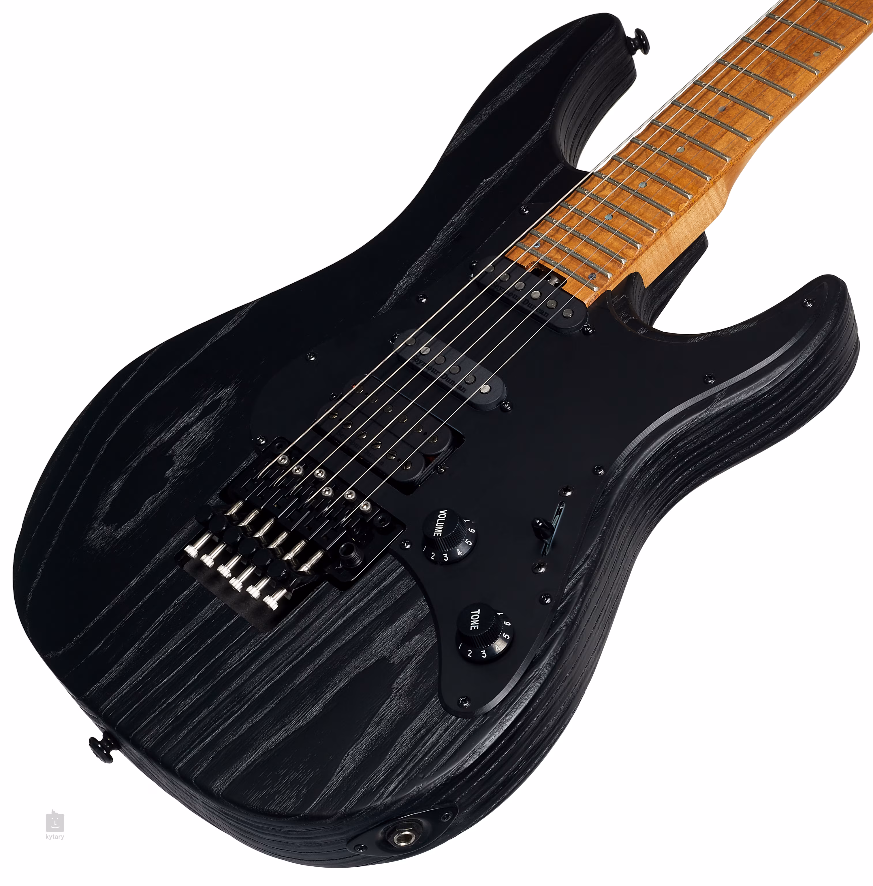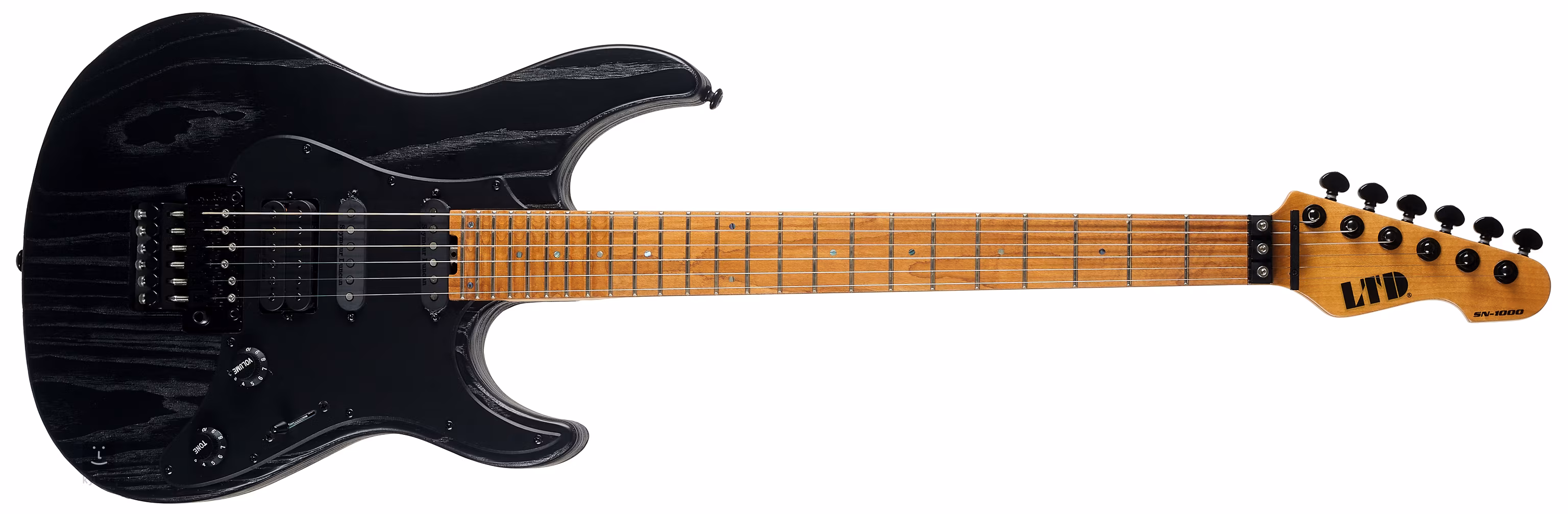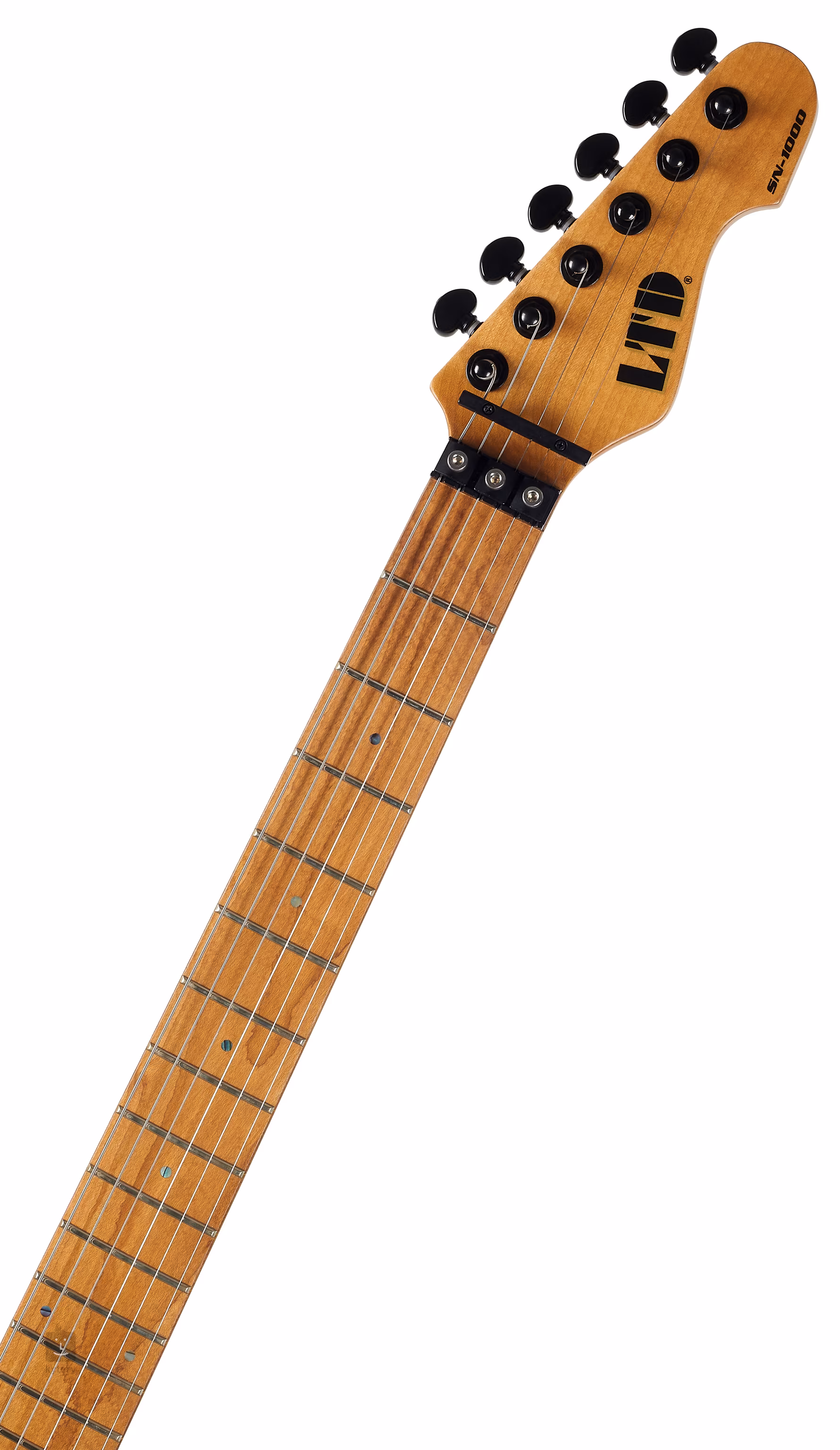 Der Korpus des SN-1000 FR M BLKBLAST ist aus Sumpfesche gefertigt. Der verschraubte Ahornhals und das Griffbrett wurden vor dem Zusammenbau einem Wärmebehandlungsprozess unterzogen, der die Eigenschaften des Holzes (Stabilität, Haltbarkeit, Widerstandsfähigkeit gegen Wasser und Temperaturschwankungen) verbessert und der Gitarre einen schönen Vintage-Charakter verleiht. Das Griffbrett selbst ist mit vierundzwanzig Extra-Jumbo-Bünden aus Edelstahl ausgestattet. Die Positionspunkte erleichtern die Navigation auf der Oberfläche.