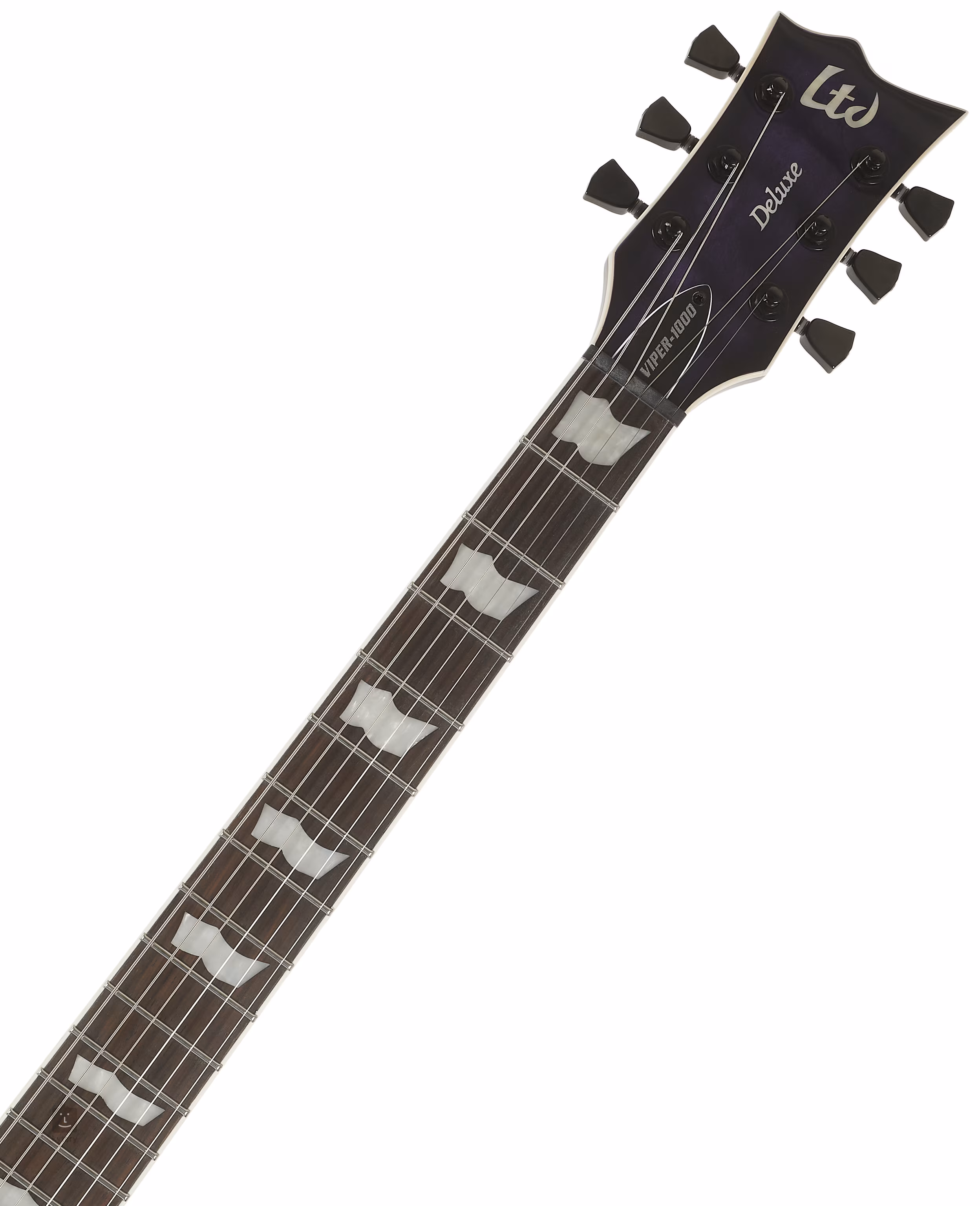 Der Mahagonikorpus der VIPER-1000 QM STPSB ist mit einem spektakulären Flammenahorn-Oberfurnier verziert. Ein dreiteiliger Mahagoni-Hals mit einer Set-Thru-Konstruktion, d.h. einem tiefer in den Korpus eingelassenen Hals, und einem schmaleren, schnellen Thin-U-Profil wird durch ein Ebenholz-Makassar-Griffbrett mit vierundzwanzig Extra-Jumbo-Bünden ergänzt. Die Orientierung auf seiner Oberfläche wird durch Positionsblöcke erleichtert.