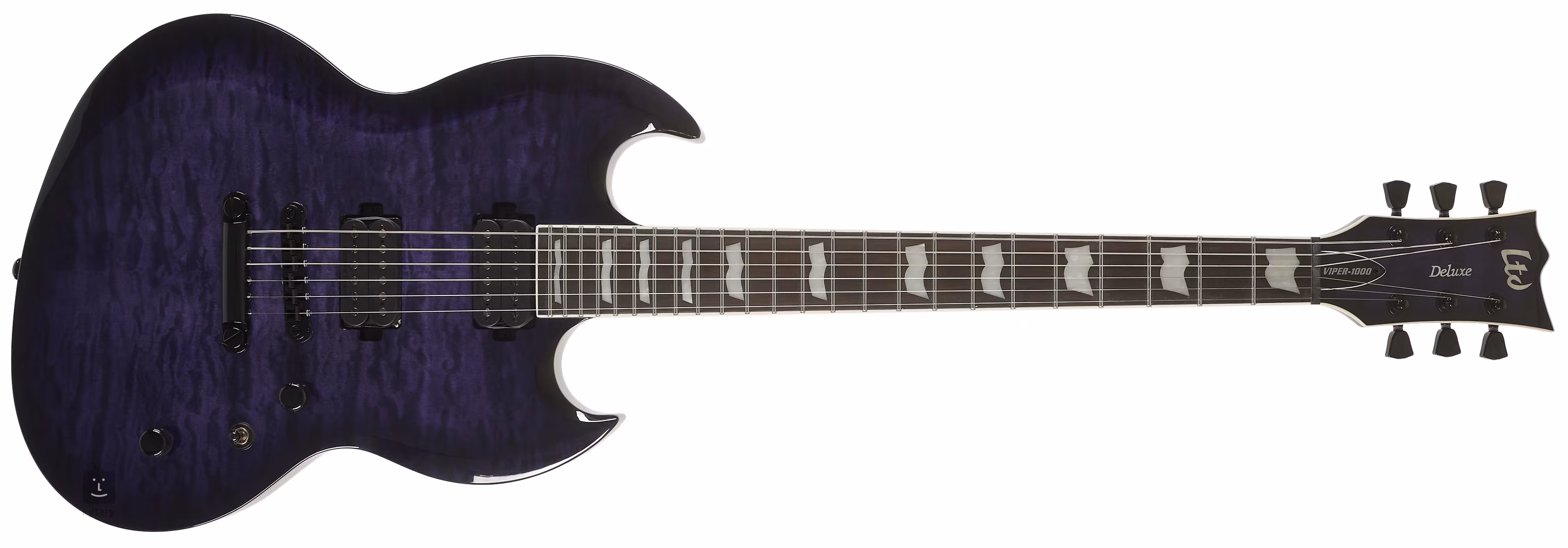 E-Gitarren mit VIPER-1000 Double-Cut-Design in Form von SG-Modellen sind Teil der LTD Deluxe-Serie. Ihr Klang, ihr Design, ihre Verarbeitung und ihre Spieleigenschaften entsprechen voll und ganz denen professioneller Instrumente. Sie sind eine gute Wahl für Spieler, die eine Gitarre suchen, die sie in Bezug auf Klang und Design würdig repräsentiert.