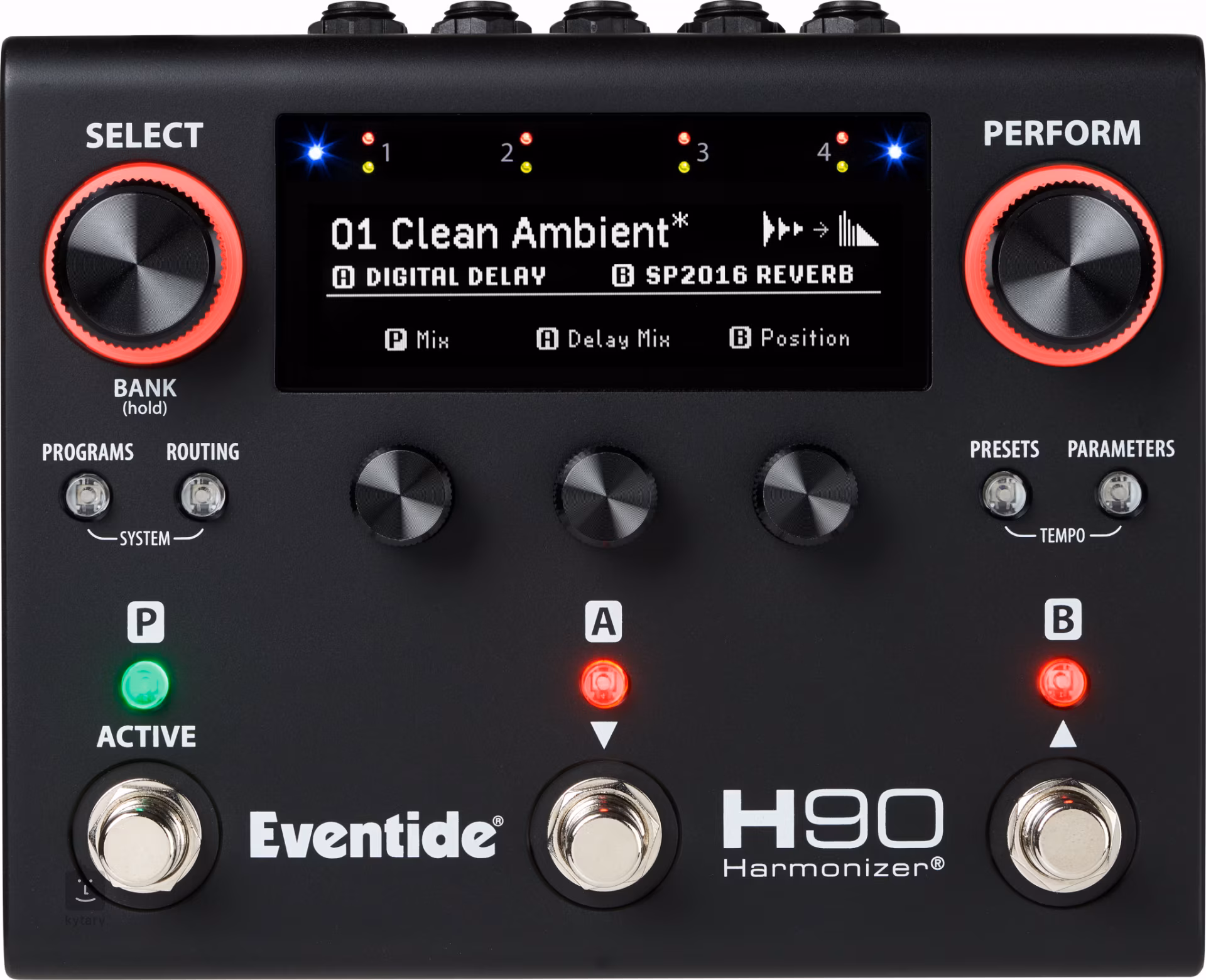 Das Gerät ermöglicht es Ihnen außerdem, zwei Algorithmen in einem Programm zu kombinieren, um völlig neue und inspirierende Sounds zu erzeugen. Dieses duale Design ermöglicht nicht nur die nahtlose Überblendung zwischen den beiden integrierten Programmen, sondern auch die gleichzeitige Verarbeitung von zwei externen Stereoeffekten! Auf der Vorderseite des H90 befinden sich drei Fußschalter, fünf Regler, sieben LED-Tasten und ein hochauflösendes OLED-Display. Hier können Sie ganz einfach alle Parameter einstellen und in der umfangreichen Bibliothek der integrierten Presets stöbern. Gleichzeitig können Sie eine Preset-Wiedergabeliste erstellen, um sie für Ihre Auftritte vorzubereiten. Im Perform-Modus können Sie jedem Fußschalter ganz einfach eine Funktion zuweisen, so dass Sie genau die Parameter steuern können, die Sie gerade benötigen.