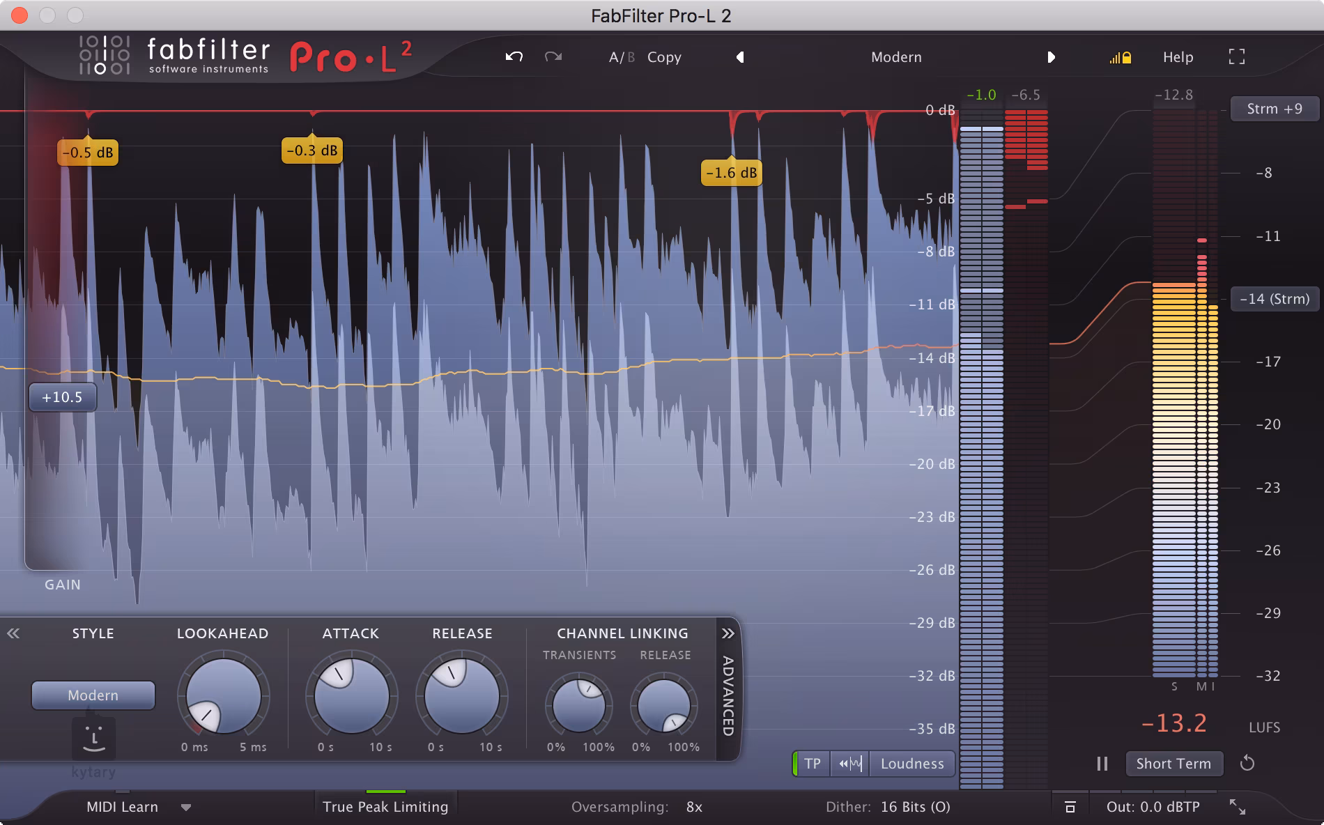 Erstklassige Messung FabFilter Pro-L 2 verfügt über präzise True-Peak-Meter und umfangreiche Lautheitsmessungen mit Unterstützung der Standards EBU R128, ITU-R BS.1770-4 und ATSC A/85. In Kombination mit der einzigartigen Echtzeit-Pegelanzeige haben Sie alle Informationen, die Sie benötigen, um die bestmöglichen Ergebnisse zu erzielen. Zusammen mit dem Plugin erhalten Sie alle üblichen FabFilter-Goodies - perfekt abgestimmte Bedienelemente, MIDI Learn, Smart Parameter Interpolation für sanfte Parameterübergänge, ein umfangreiches Tutorial mit interaktiver Hilfe, SSE-Optimierung und vieles mehr.