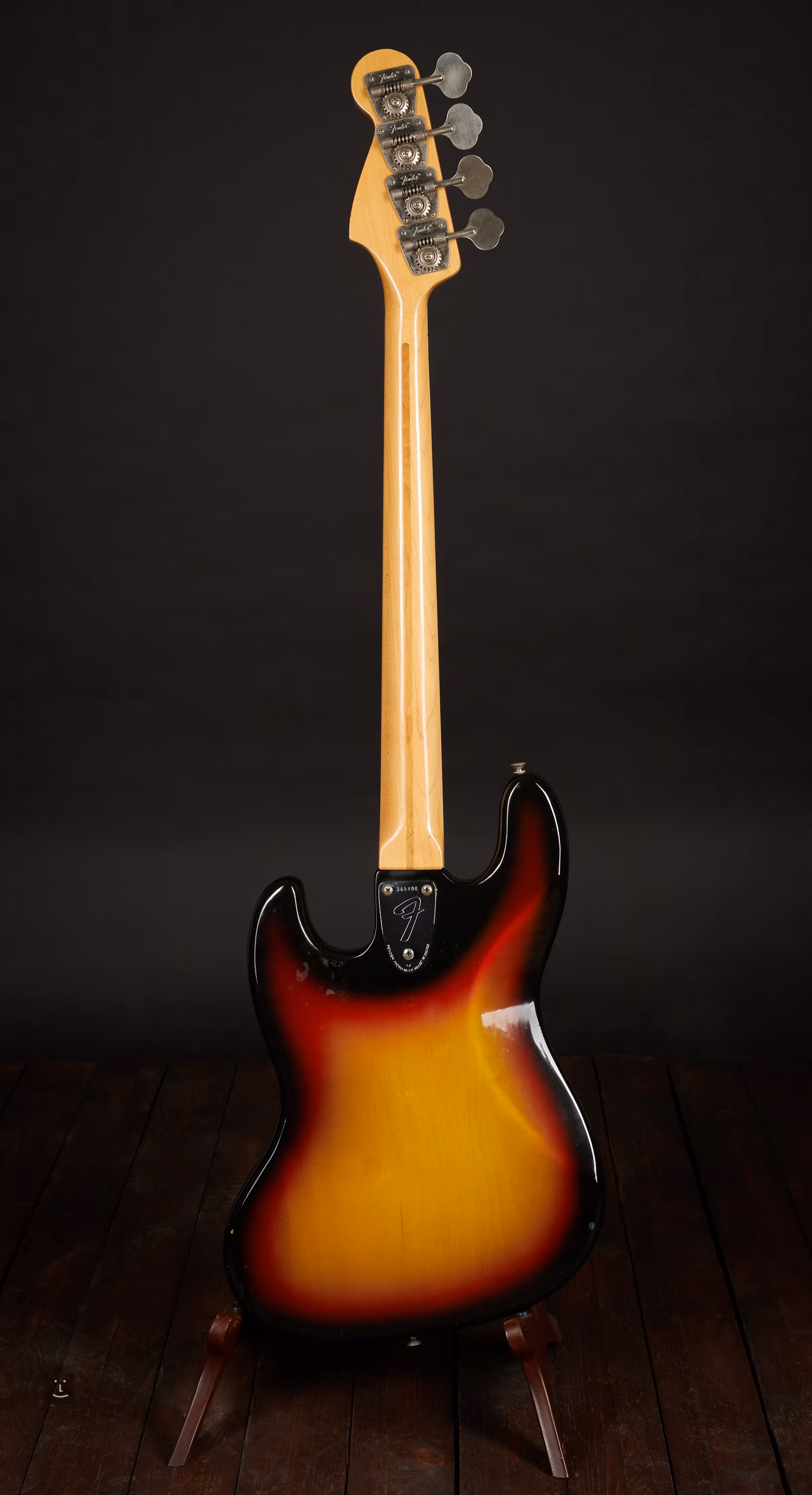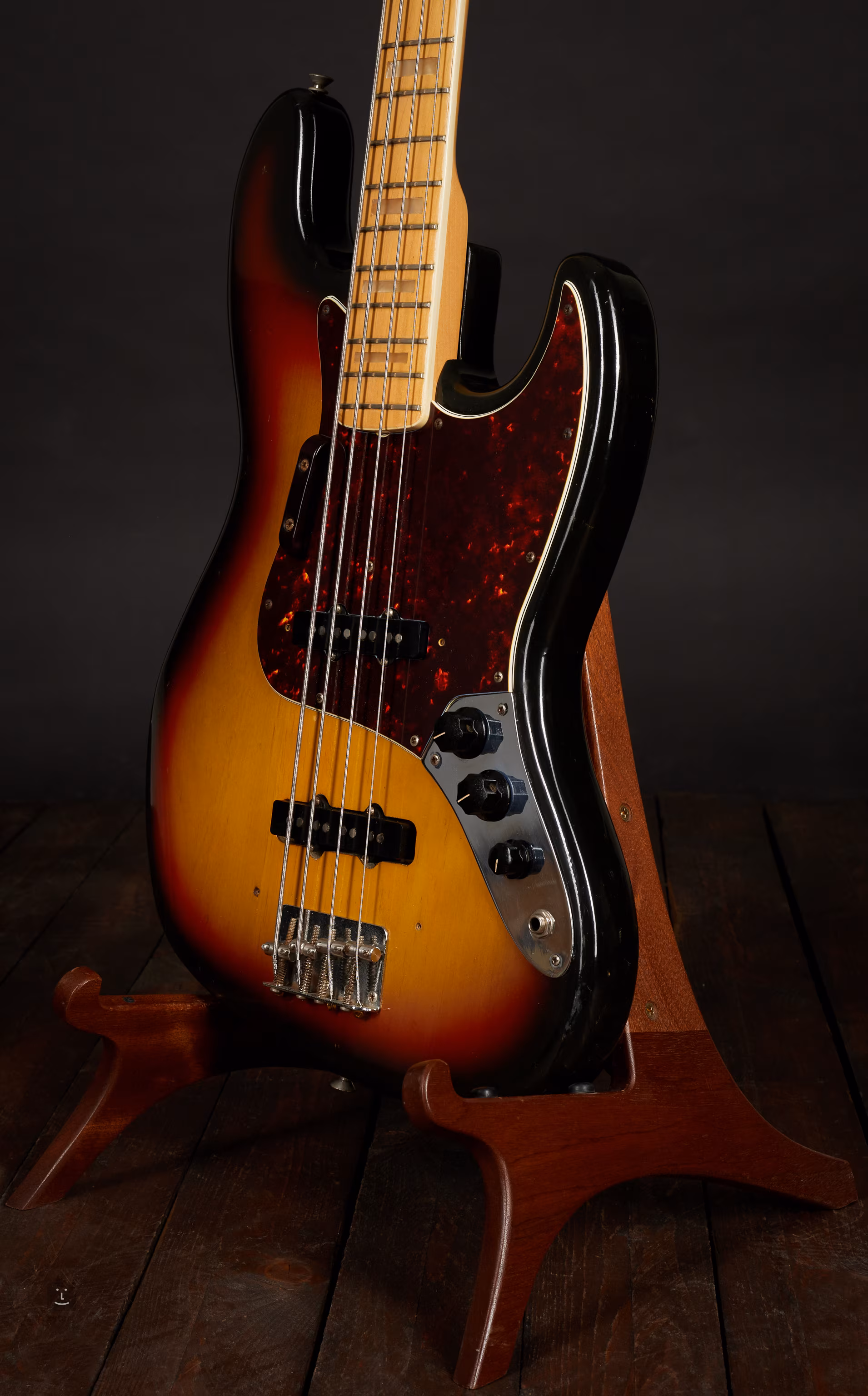 Der Bass hat den selteneren Erlenkorpus dieser Ära, etwa 1975. Der Hals ist aus Ahorn, traditionell mit rechteckigen Einlagen aus Perlmutt eingelegt. Das Halsgelenk ist ein Drei-Schrauben-Gelenk.