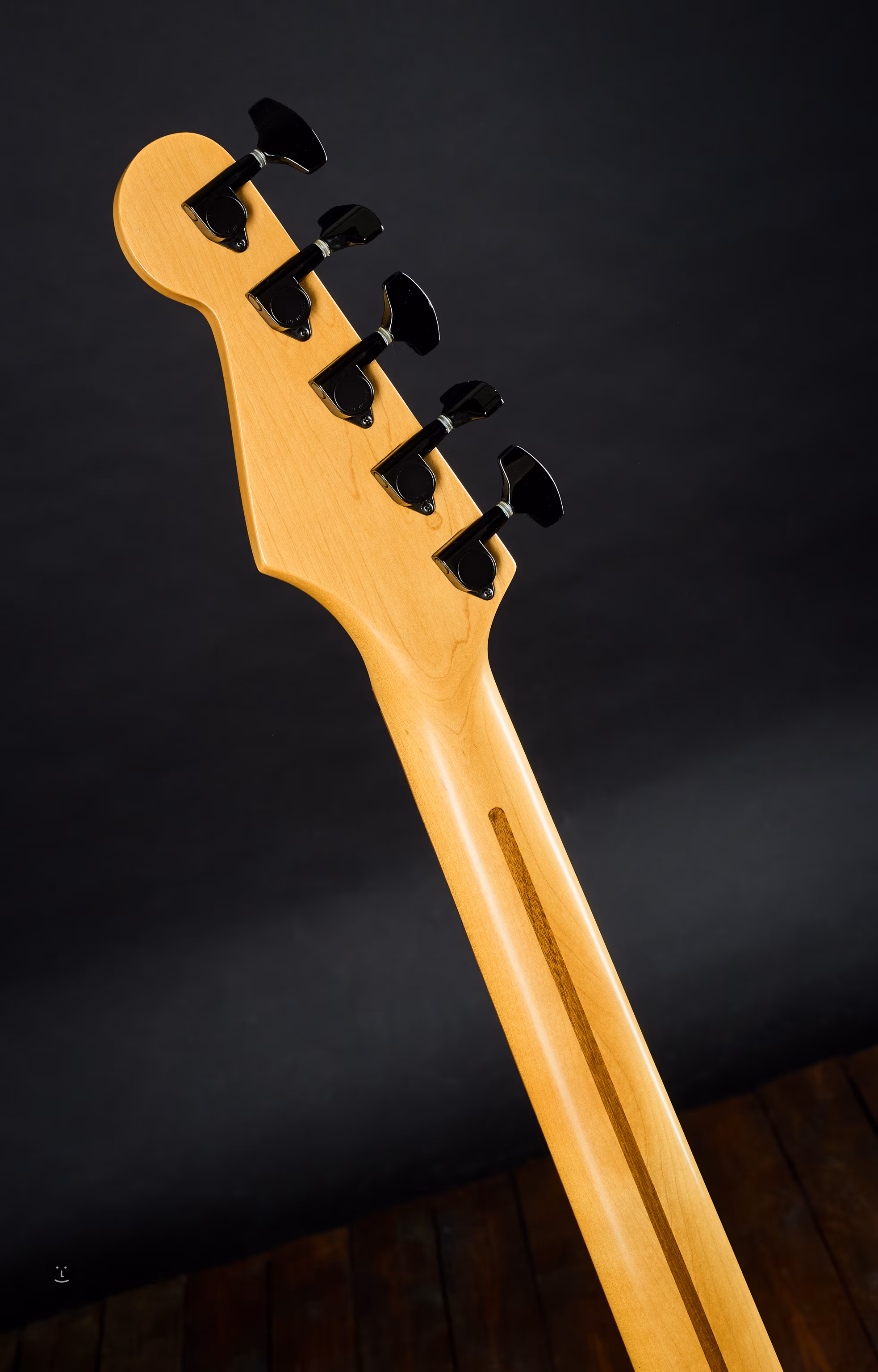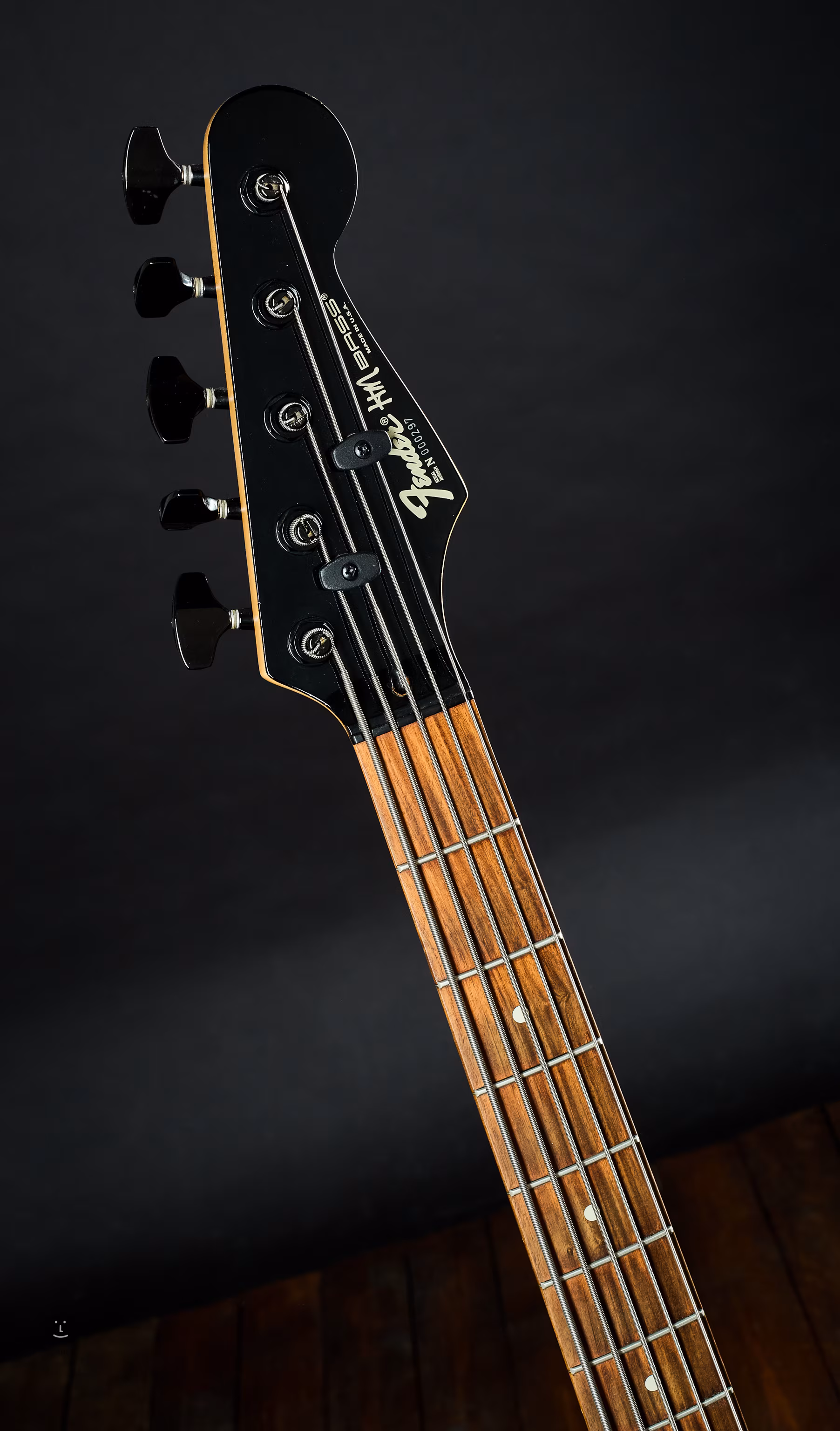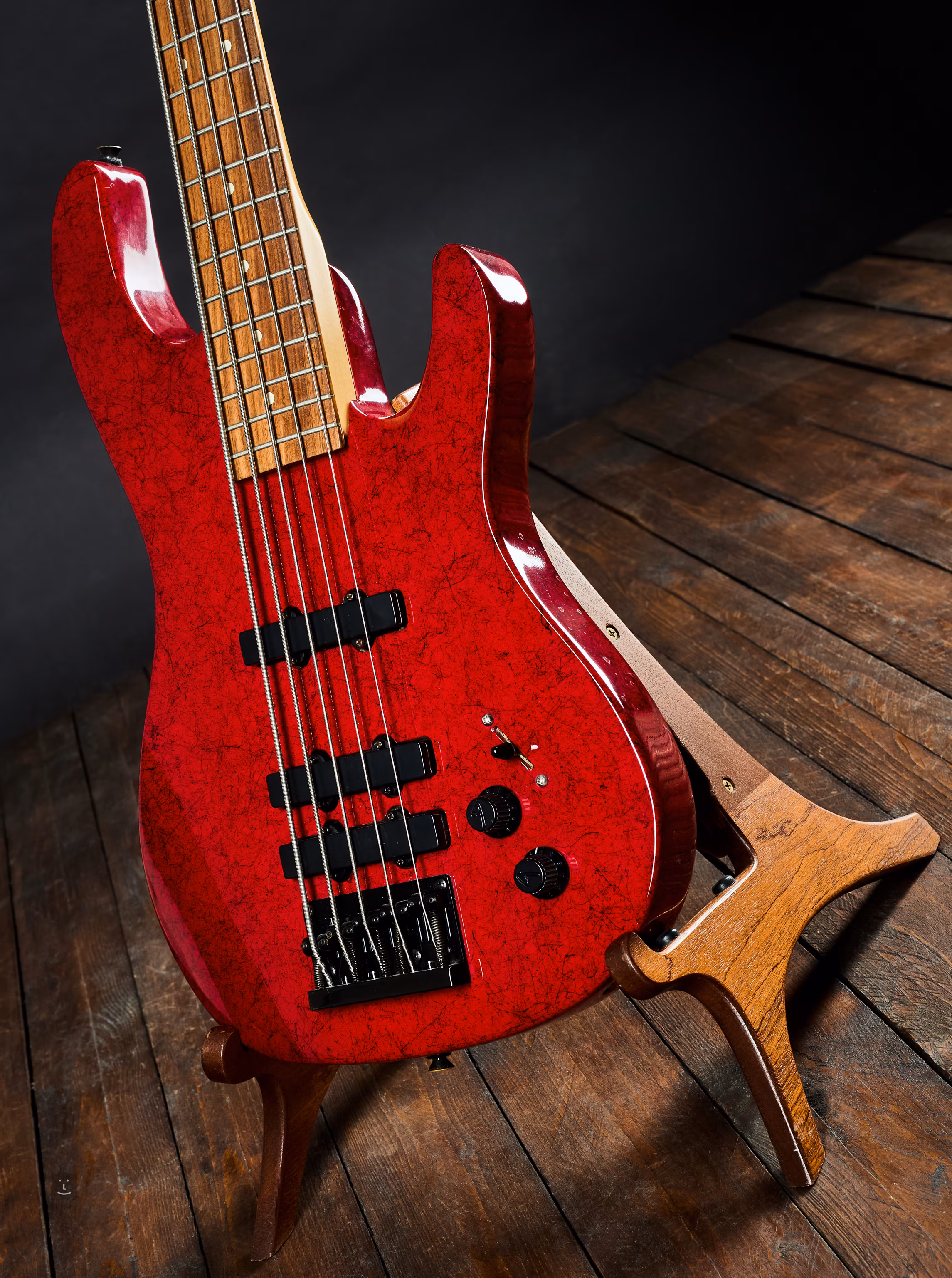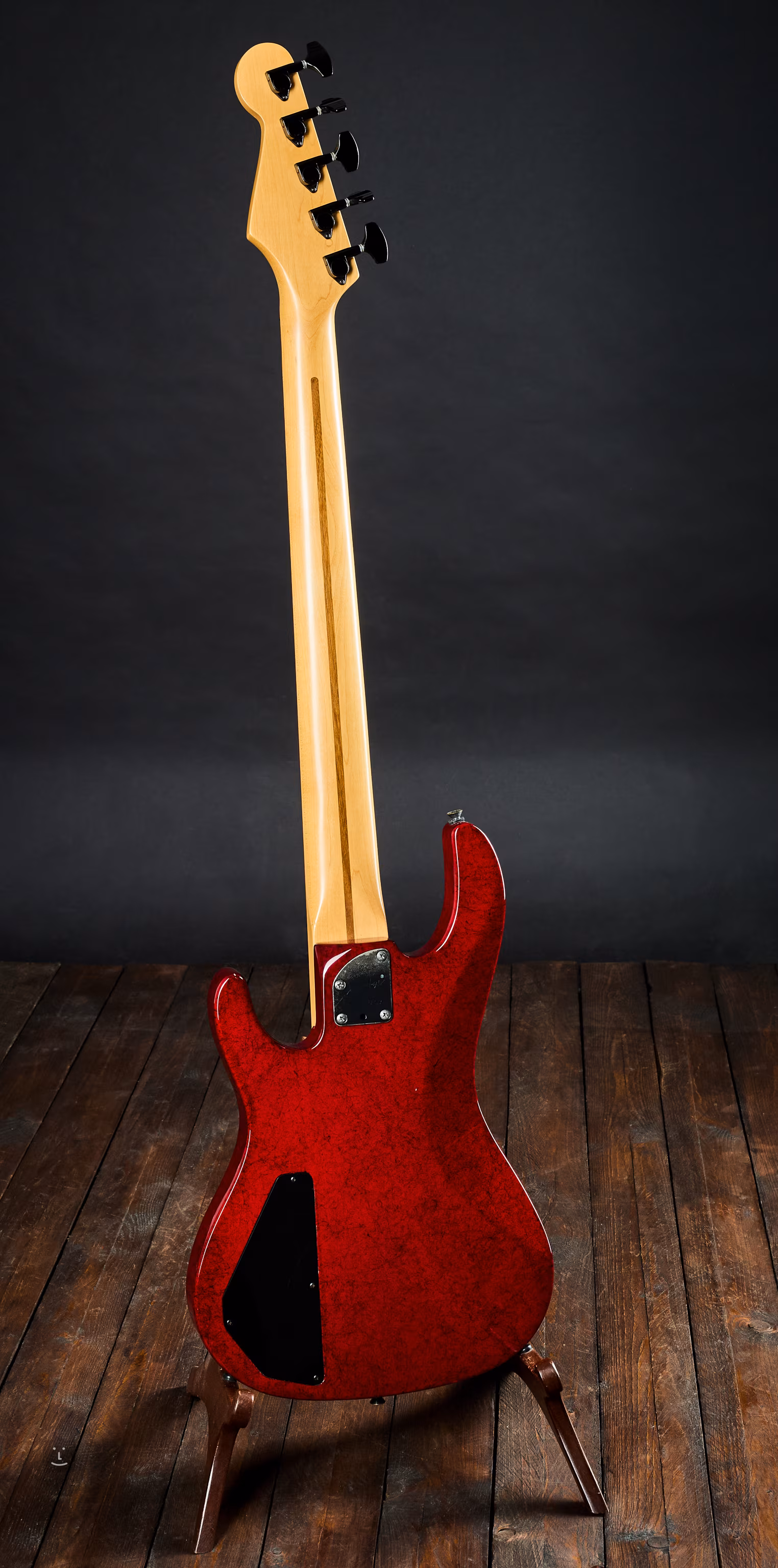 Ein fünfsaitiger Bass mit drei einzelnen Tonabnehmern, die mit einem Fünf-Positionen-Schalter verbunden sind, ähnlich wie bei einer Stratocaster. Dieses Instrument trägt den Schriftzug Made in U.S.A. auf der Kopfplatte, obwohl es sich wahrscheinlich um einen Bass handelt, der hauptsächlich aus japanischen Teilen gebaut wurde. Das Farbschema des Korpus ist sehr originell, ein sehr subtiler roter und schwarzer Wirbel.