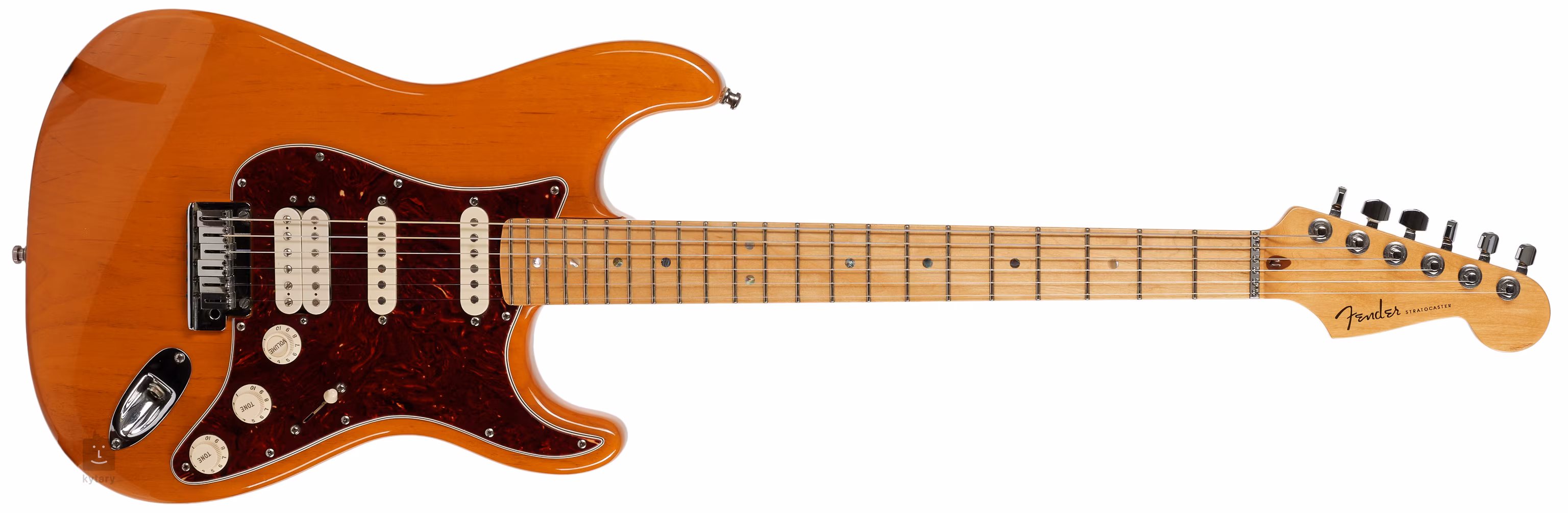 Der Korpus ist aus ausgesuchter Erle, mit Urethan-Transparentlack in Amber.
