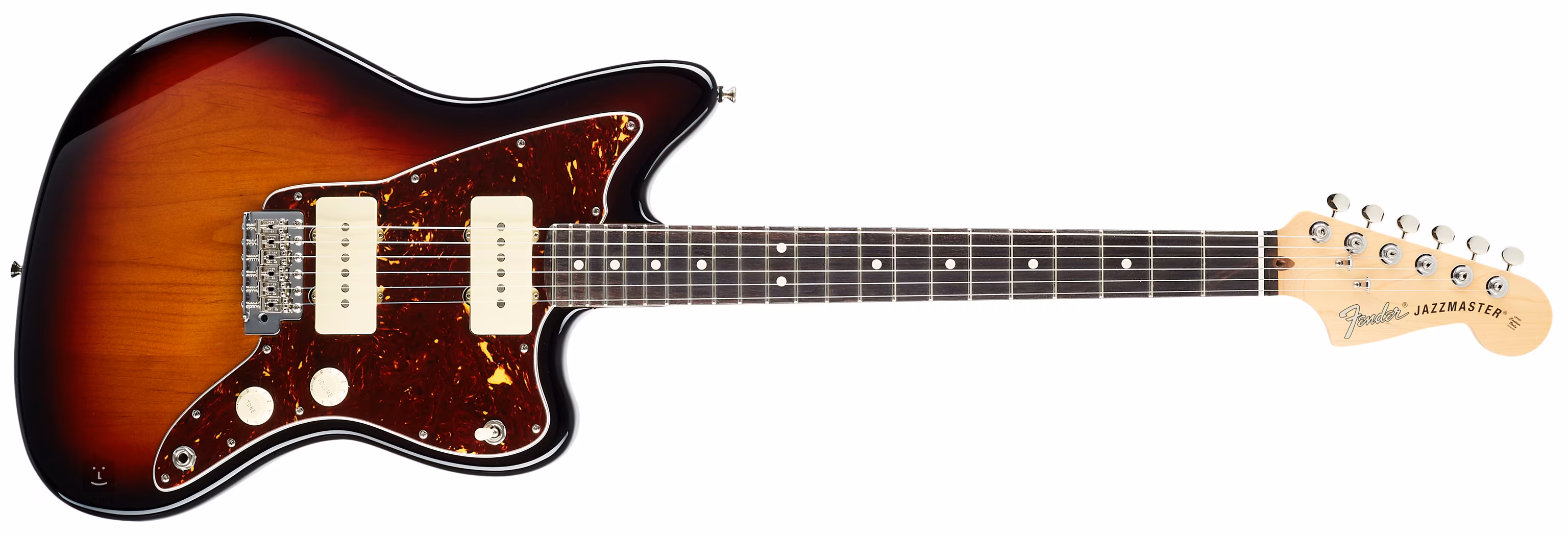 Die Saite und der Saitenhalter der Jazzmaster werden bei den American Peformer-Modellen durch das synchronisierte Singlecoil-Tremolo ersetzt, das Sie von der Stratocaster kennen. Traditionelle Elemente sind die geschlossenen Single (Six-in-Line) Mechaniken mit einem Übersetzungsverhältnis von 18:1, die Kopfplatte und das Logo im Stil der 70er Jahre oder das vierlagige Schlagbrett aus Schildpatt-Imitat.