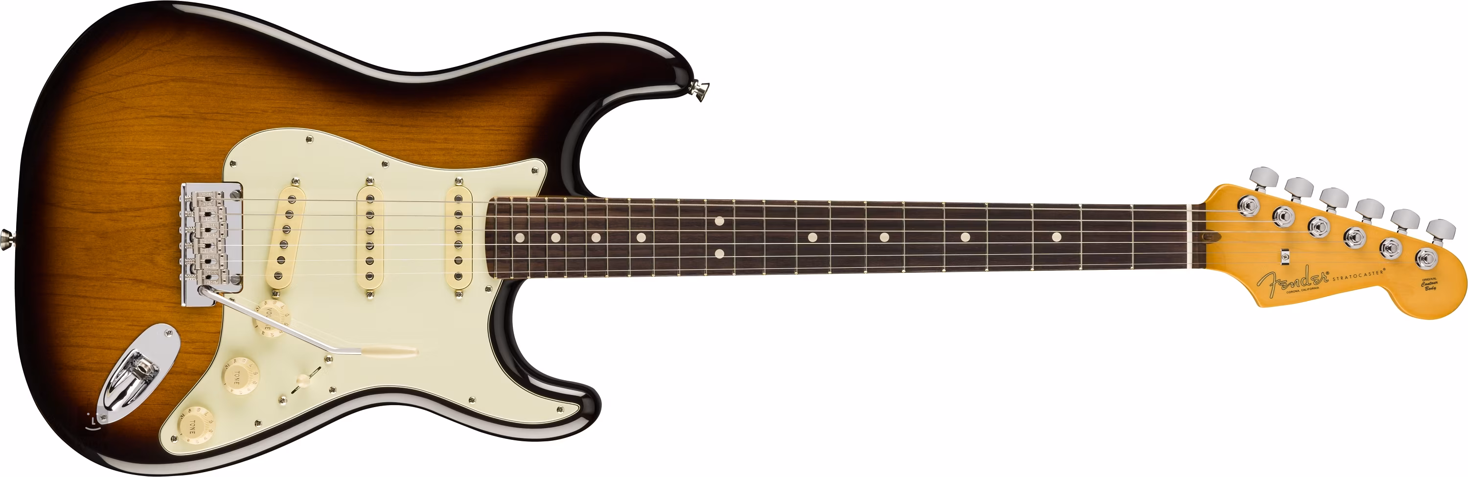 Der Erlenkorpus der American Professional II Stratocaster, Rosewood Fingerboard, Anniversary 2-Color Sunburst ist mit einem glänzenden Polyurethan-Lack überzogen. Der Ahornhals mit "Deep C"-Profil (eine Kreuzung aus Modern C und U) liegt perfekt in der Hand - egal, ob Sie schnelle Soli oder Akkorde spielen. Zweiundzwanzig Narrow Tall-Bünde und weiße Positionspunkte gliedern das Palisander-Griffbrett. Abgerundete Griffbrettkanten und ein neu geformter Halsfuß sorgen für eine leichte und komfortable Bespielbarkeit über die gesamte Griffbrettfläche.