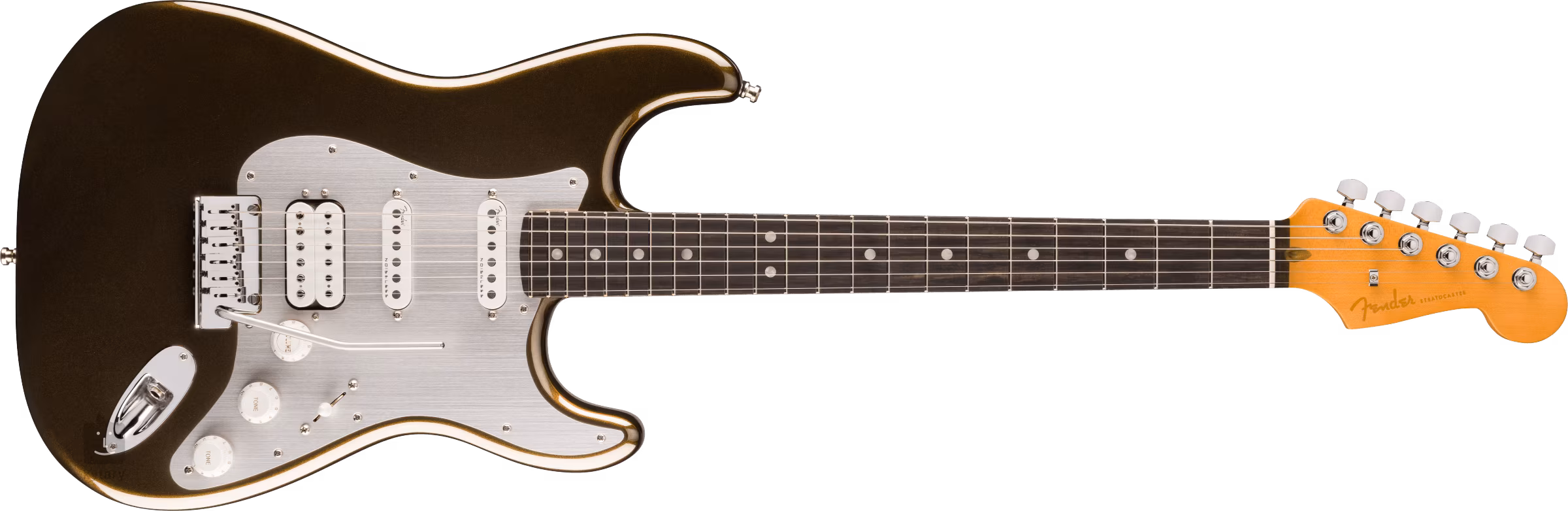 Die Stimmstabilität wird durch die Befestigung der Saiten über den Graphtech TusQ-Nullbund in der Deluxe Cast/Sealed Locking-Mechanik des Unternehmens und in einem synchronisierten 2-Punkt-Tremolo mit Edelstahlsätteln gewährleistet. Der stilvolle Look der Gitarre wird durch ein einlagiges Aluminium-Schlagbrett (Silber eloxiert) unterstrichen.