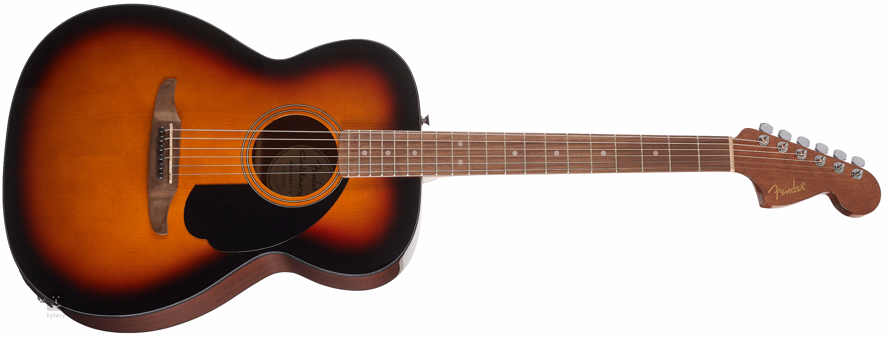 Für die Klangverstärkung sorgt die Fender-Elektronik mit Lautstärkeregler, Tonregler und einem eingebauten Stimmgerät auf der Rückseite der Gitarre. Die Saiten werden in verchromten Druckguss-Mechaniken und einem Griffbrett aus Walnussholz über einen Micarta-Verbund-Nullbund gehalten. Das Styling wird durch die Kopfplatte im Fender Mustang-Design, die Sunburst-Lackierung der Decke, das schwarze Body Binding und das einlagige schwarze Schlagbrett akzentuiert.