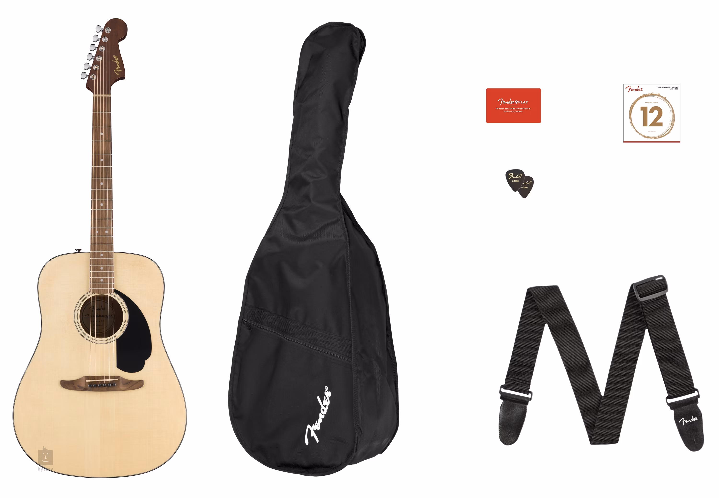 Das California Standard Redondo Pack Natural Gitarrenset enthält eine Fender California Standard Redondo Akustikgitarre, eine Gigbag, einen Gitarrengurt, zwei Plektren und einen Satz Ersatzsaiten.