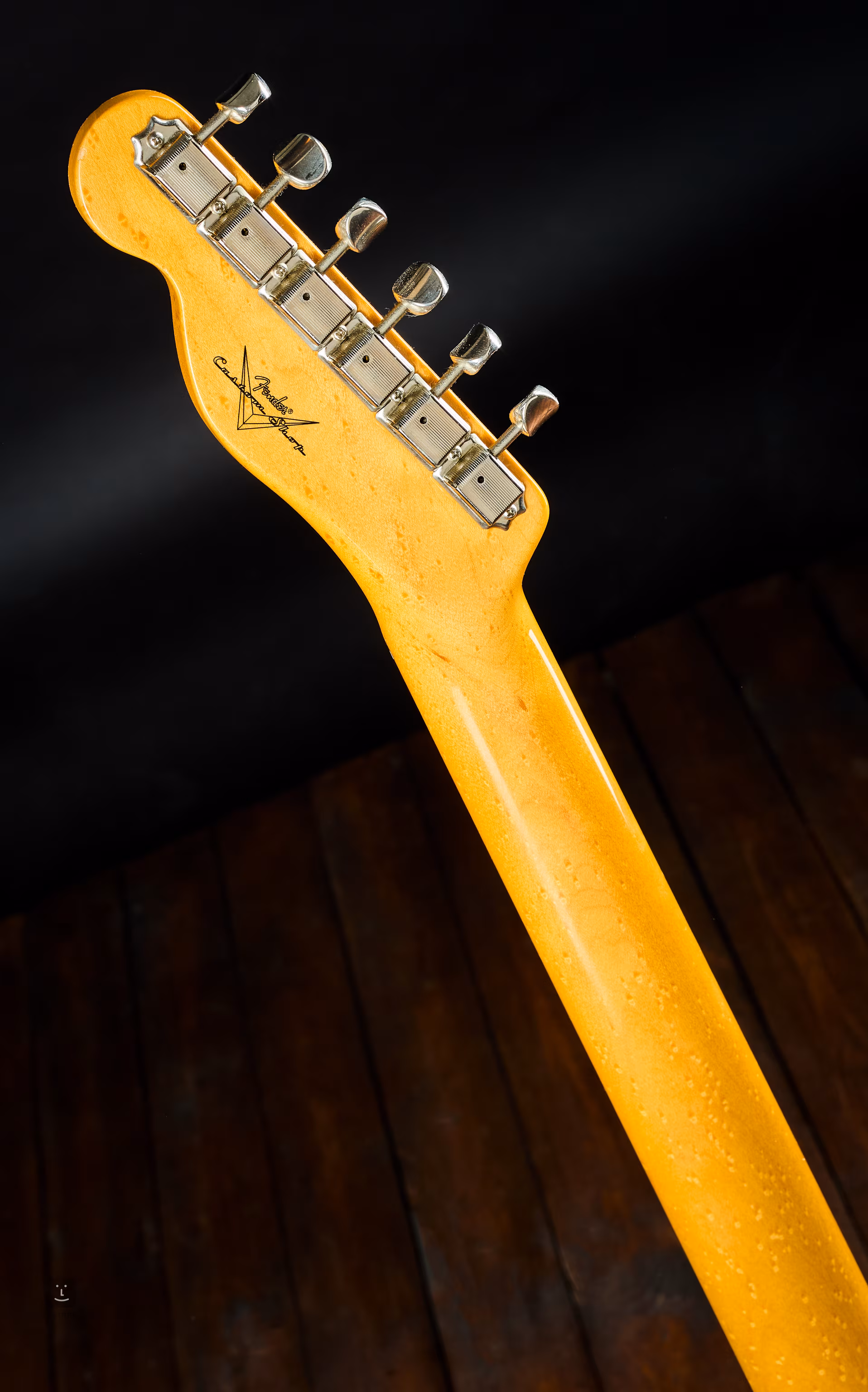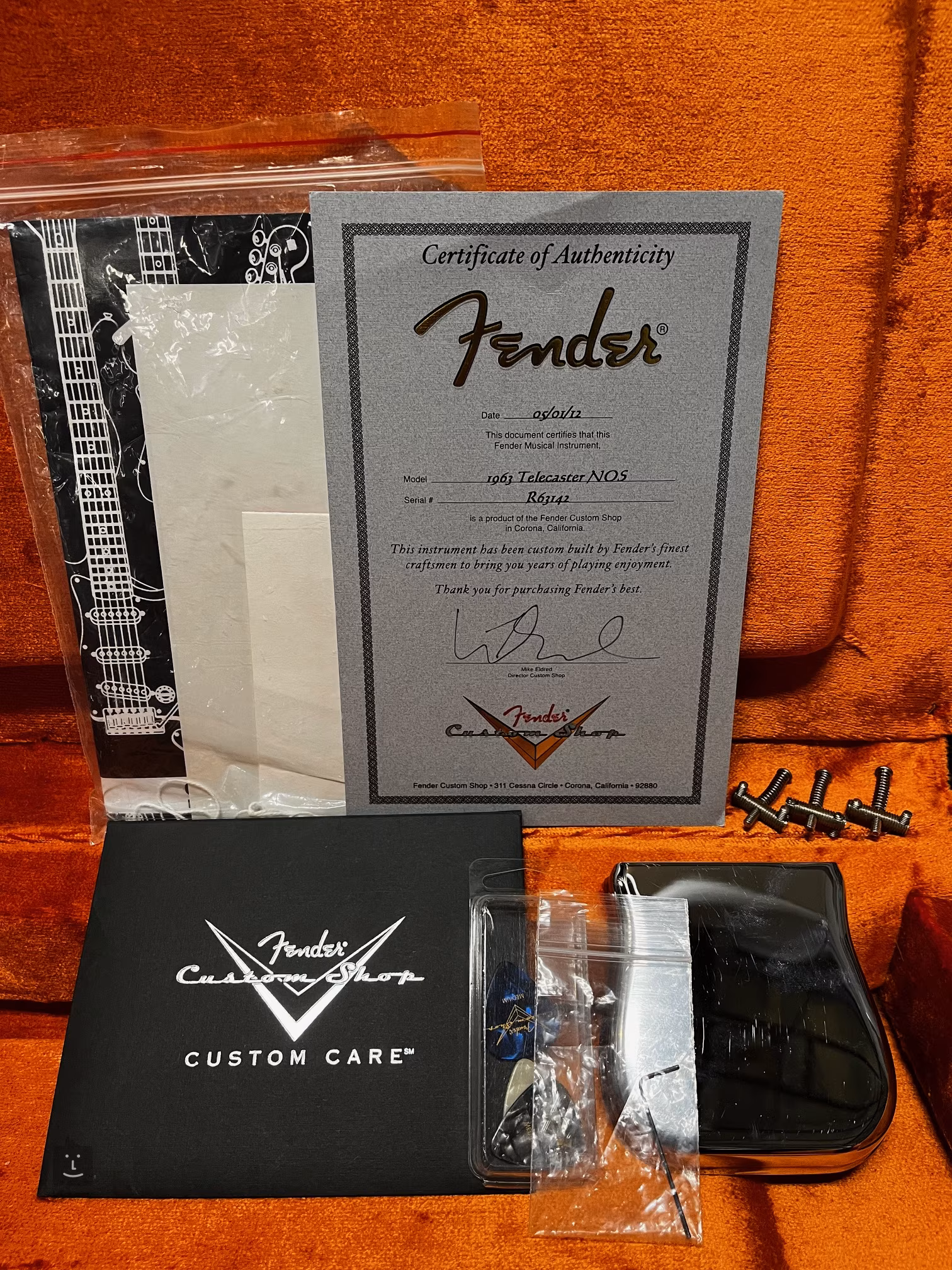 Die Elektronik ist komplett original. An der Korpuskante in der Nähe des Schlagbretts befindet sich eine größere, schwarz gefärbte Delle. Hochwertige Kompensationssteine wurden zur besseren Stimmung in die Kopfplatte eingebaut, Originalsteine sind im Lieferumfang enthalten. Ebenfalls im Originalkoffer enthalten sind ein Fender Custom Shop Zertifikat, ein Grasshopper Cover, Plektren oder ein Shop Floor Traveler.