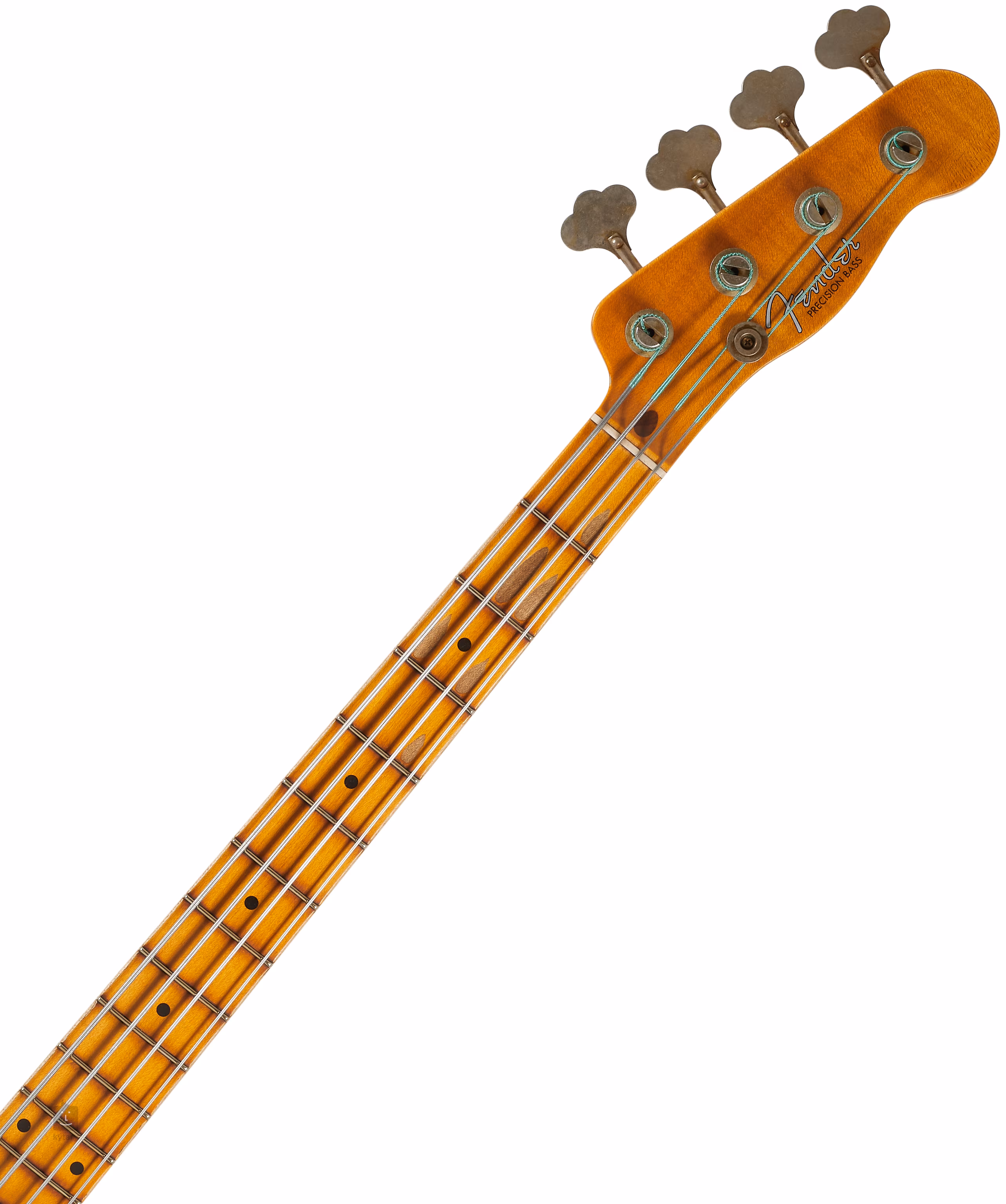 Der Korpus des Basses ist aus zwei Teilen Esche gefertigt. Die Journeyman Relic-Lackierung und das Aged 2-Color Sunburst-Farbschema bieten Elemente einer unechten Patina, die zu jahrzehntelangem, eher häuslichem Gebrauch passen. Und wenn es schon ein Eschenkorpus ist, dann muss es auch ein Ahornhals sein - in diesem Fall ein radial geschnittener Hals mit einem U-Profil im Stil der 51er Jahre und einem Ahorngriffbrett mit zwanzig Medium Vintage (47095) Bünden.