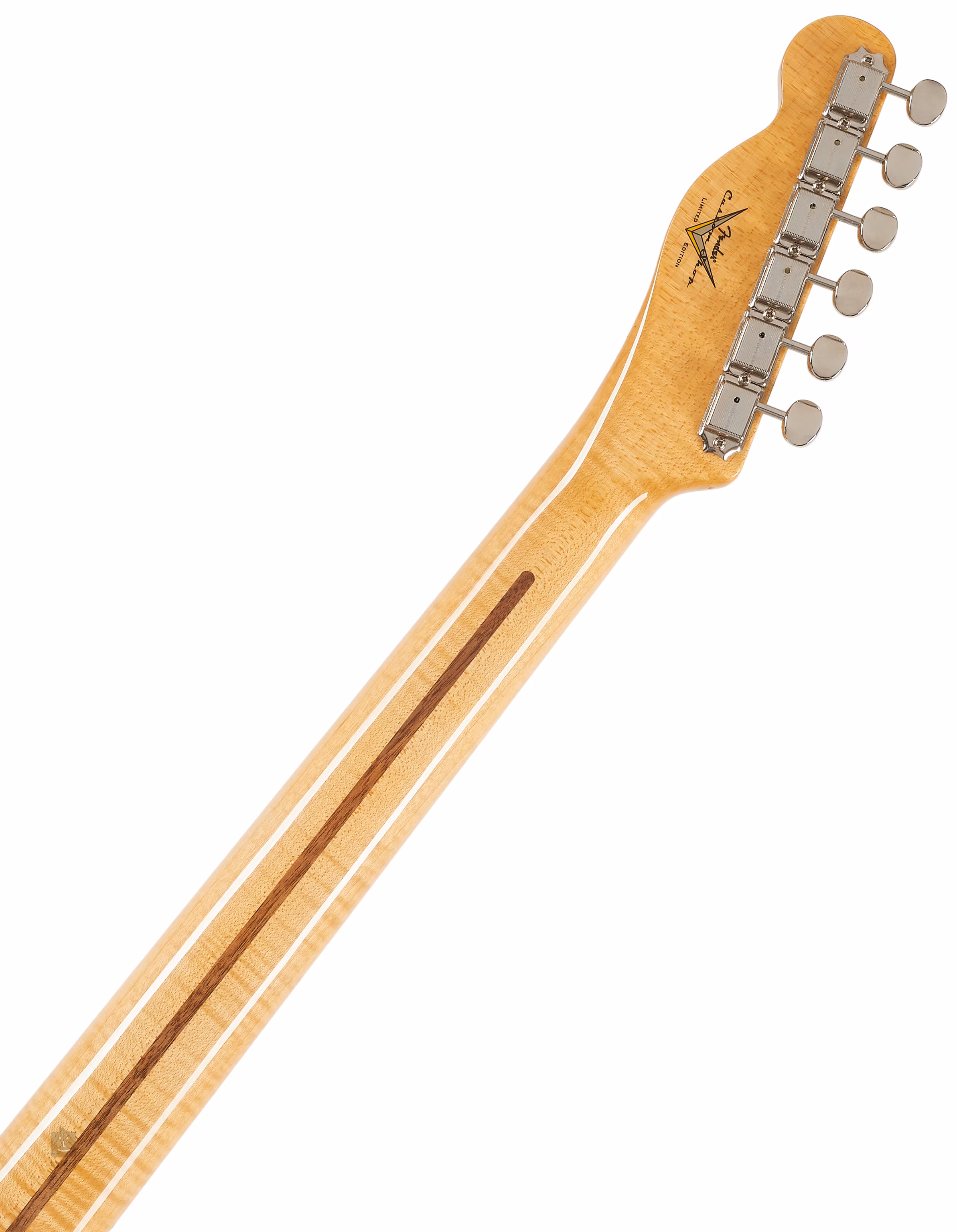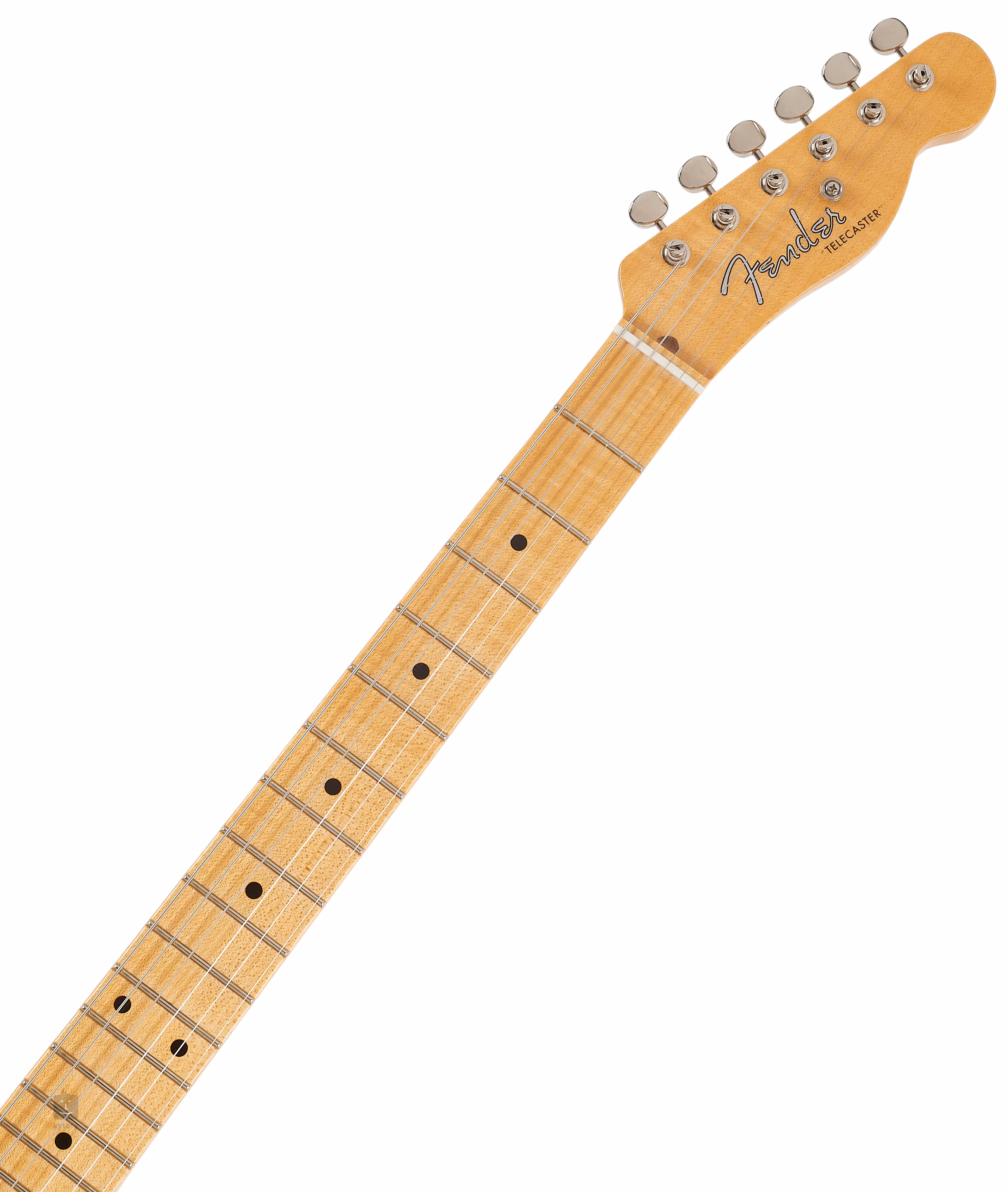 Zwei handgewickelte '50-'51 Blackguard Single-Coil-Tonabnehmer aus dem Custom Shop sorgen für das typische Tele-Gefühl und den Twang der Gitarre. Die Konturen des Sounds lassen sich mit den Standardreglern einstellen. Die Saiten werden über ein Griffbrett aus Knochen und einen Tele-Steg mit drei Messing-Sätteln durch den Korpus in den Vintage-Stimmmechaniken des Unternehmens gehalten. Das stilvolle Finish wird durch ein schwarzes, einlagiges Schlagbrett akzentuiert.