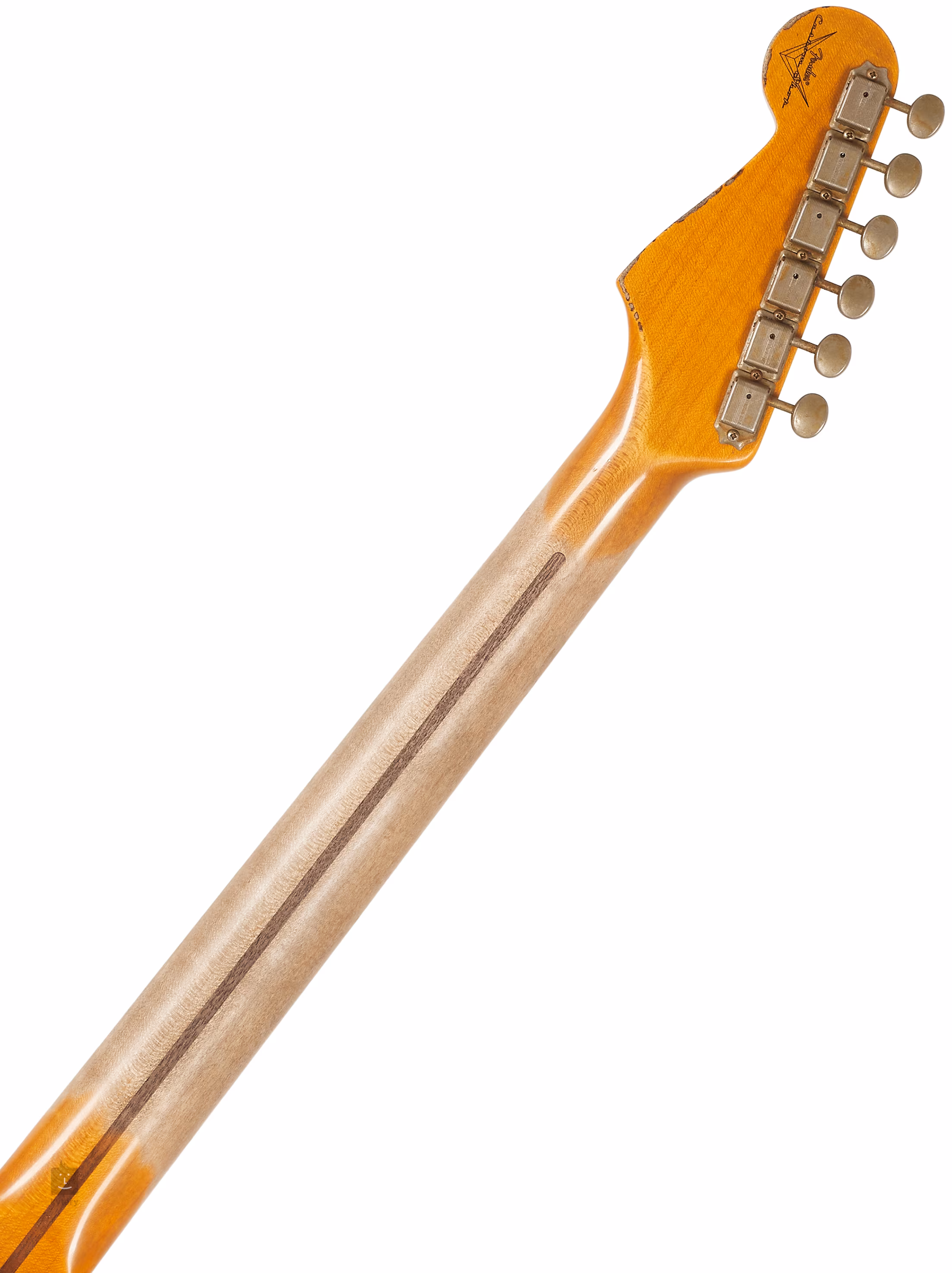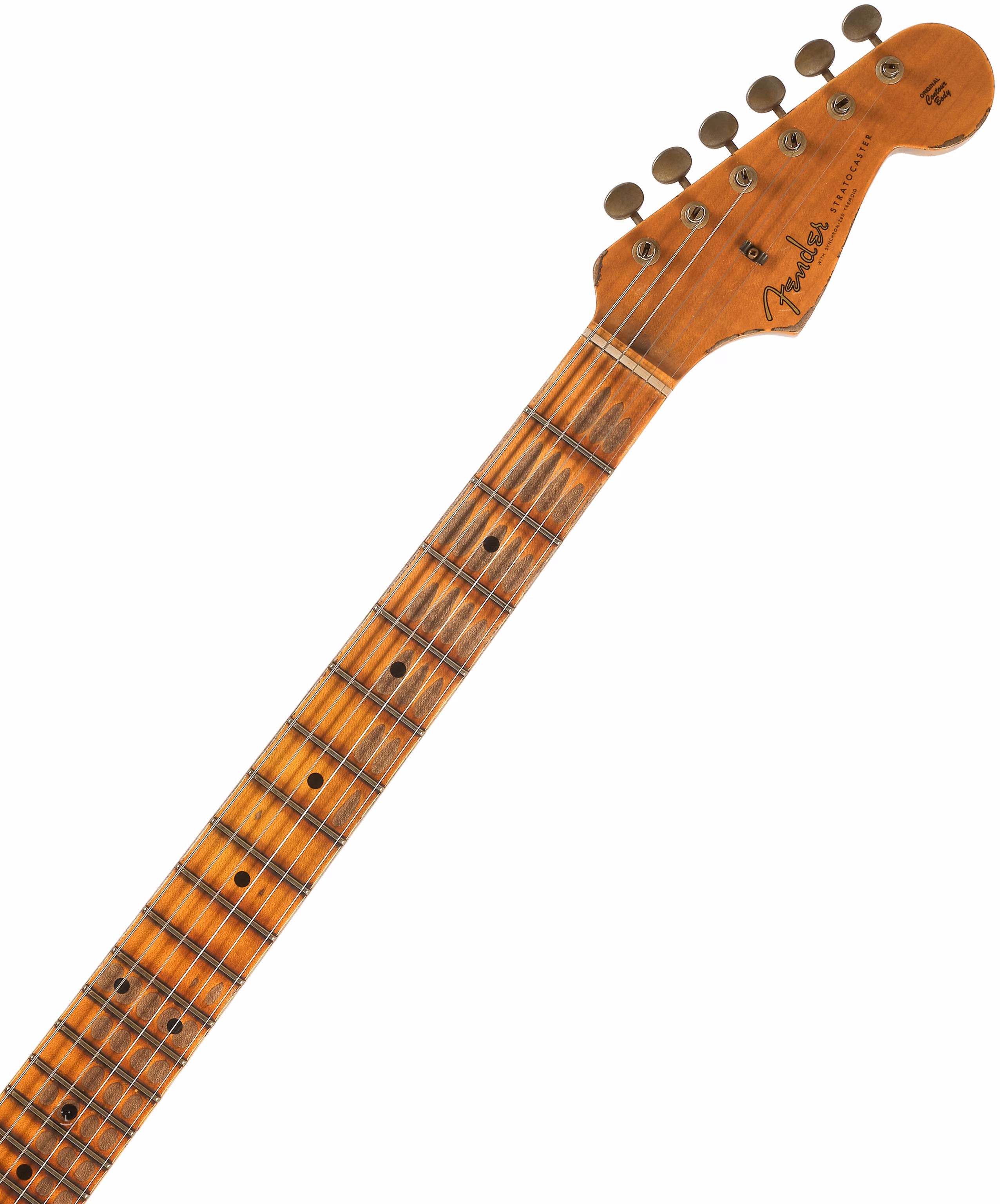 Der Korpus der Gitarre ist aus zwei Teilen Erle gefertigt. Die Lackierung, eine Kreuzung aus Relic- und Heavy Relic-Lackierung mit Elementen der Fake-Patina in Form von "zerkratztem Lack", verblasster Hardware und anderen Kampfnarben, erinnert überzeugend an Jahrzehnte intensiven Spielens und Auftritts, obwohl es sich um ein brandneues, nicht Boutique-/Basar-Instrument handelt. Der einteilige Ahornhals (spaltrau gesägt) weist ein weiches V-Profil im Stil der 57er Jahre auf, wobei die Oberfläche des Griffbretts durch einundzwanzig Narrow Tall-Bünde und schwarze Micarta-Dots unterteilt ist.