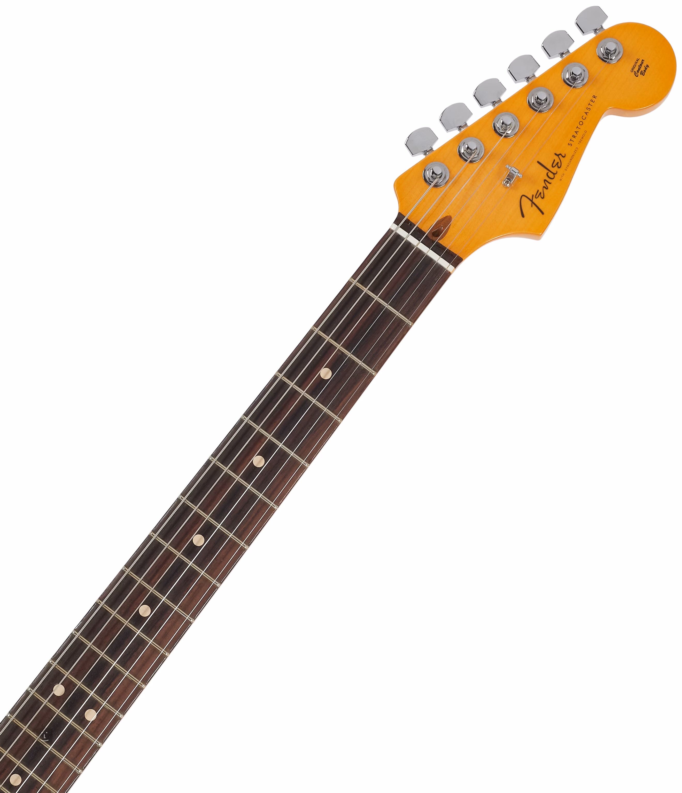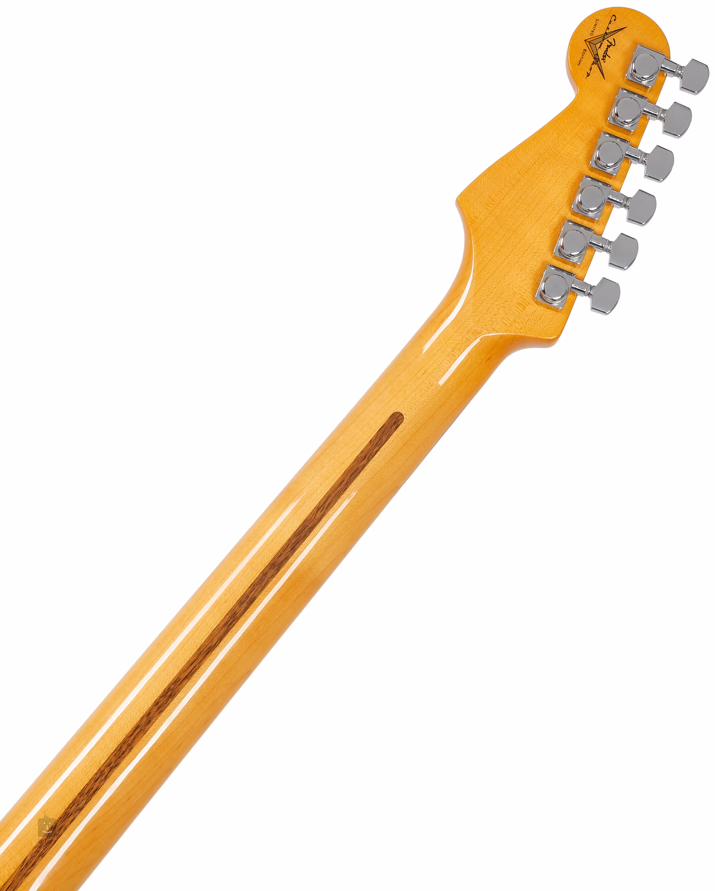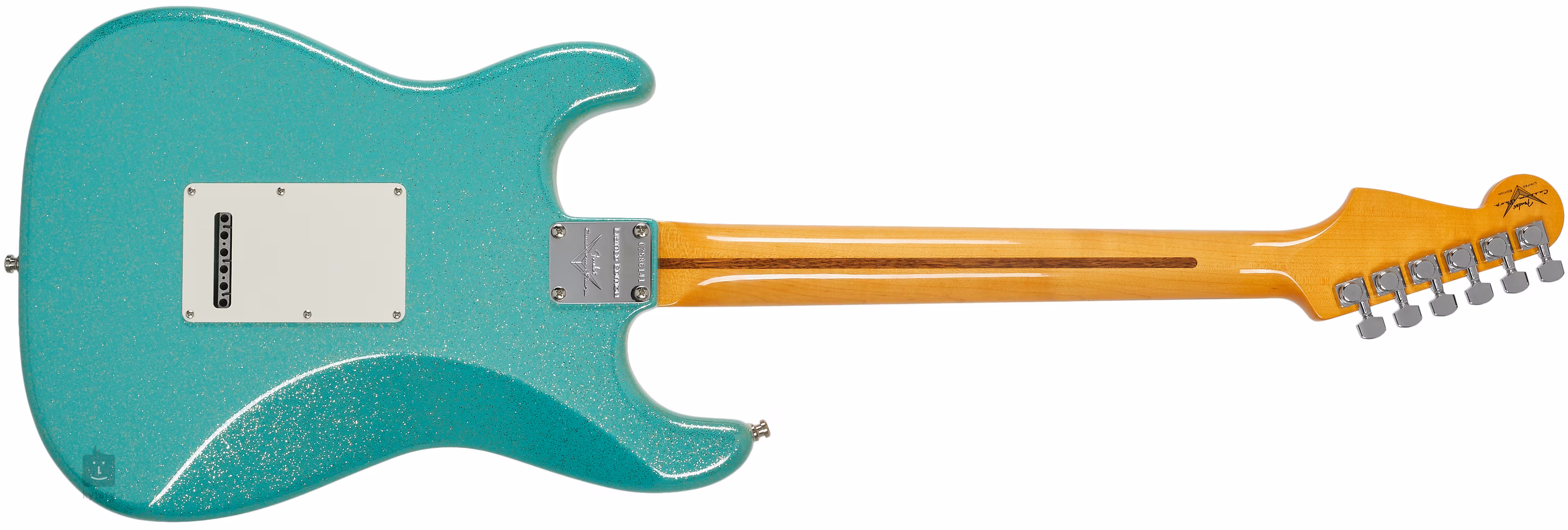 Der zweiteilige Eschenkorpus der Gitarre ist mit einem Seafoam Green Sparkle-Finish und einer NOS (New Old Stock)-Lackierung versehen, die eine absolut authentische Lackierung der Originale aus den 1950er und 1960er Jahren darstellt, ohne die Elemente künstlicher Patina und Alterungserscheinungen in Form von verblichenem Lack. Ein Palisander-Griffbrett in AAA-Qualität mit zweiundzwanzig Narrow Tall (6105) Bünden ist auf einen Ahornhals mit einem 65er Strat "C"-Profil geklebt.