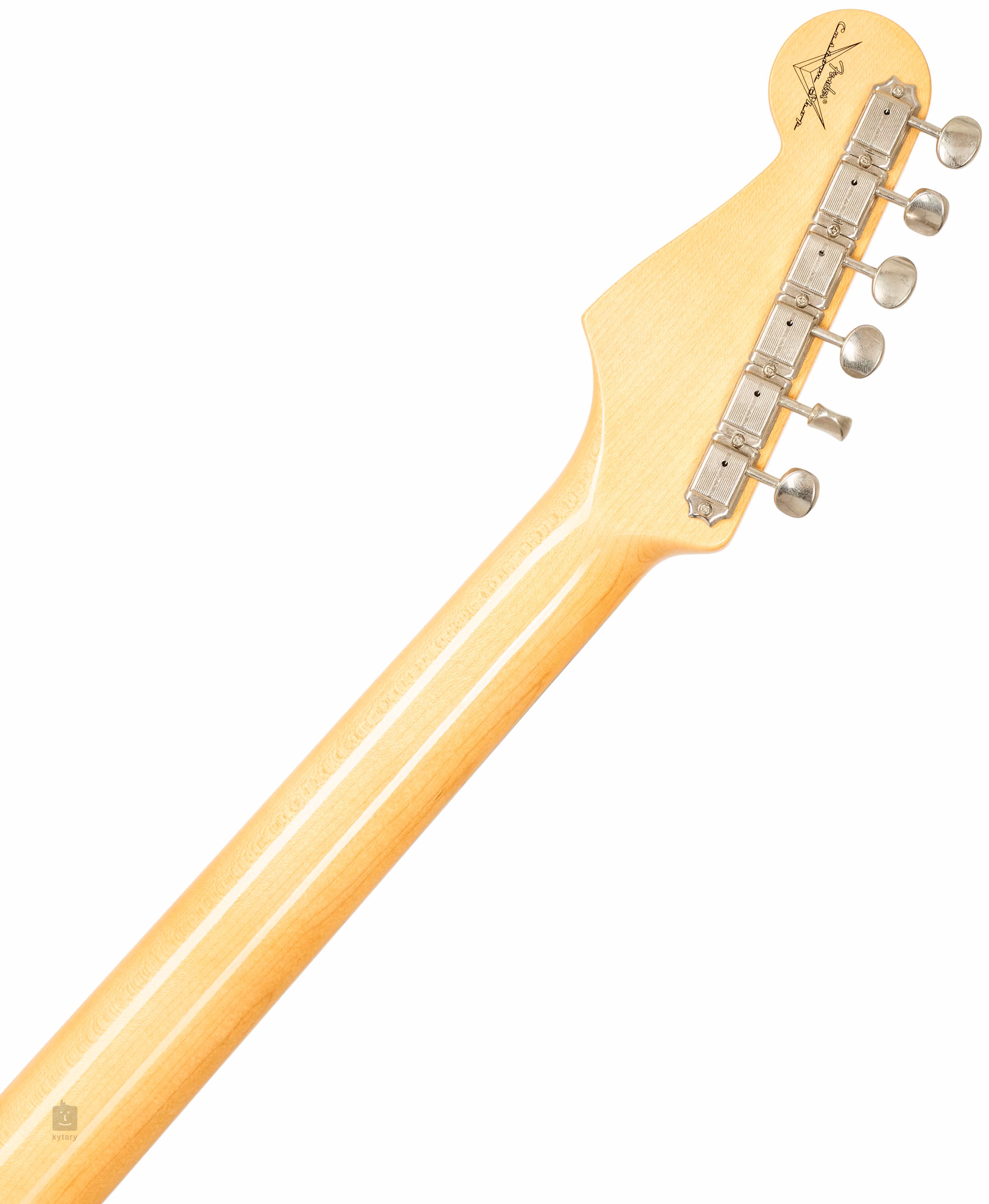Auf den riftgesägten Ahornhals ist ein 9 mm dickes Palisander-Griffbrett in AAA-Qualität geleimt, das mit einundzwanzig Medium-Vintage-Bünden (47095) bestückt ist. Die Orientierung auf dem Griffbrett wird durch Positionspunkte mit der Bezeichnung "Vintage Clay" erleichtert. Drei handgewickelte 1959er Strat-Singlecoil-Pickups, Vintage-Treiber und -Elektronik aus den Jahren '59 und '60, ein synchronisiertes Strat-Tremolo, Vintage-Stimmmechaniken und ein Griffbrett aus Knochen unterstreichen die Authentizität des Instruments.