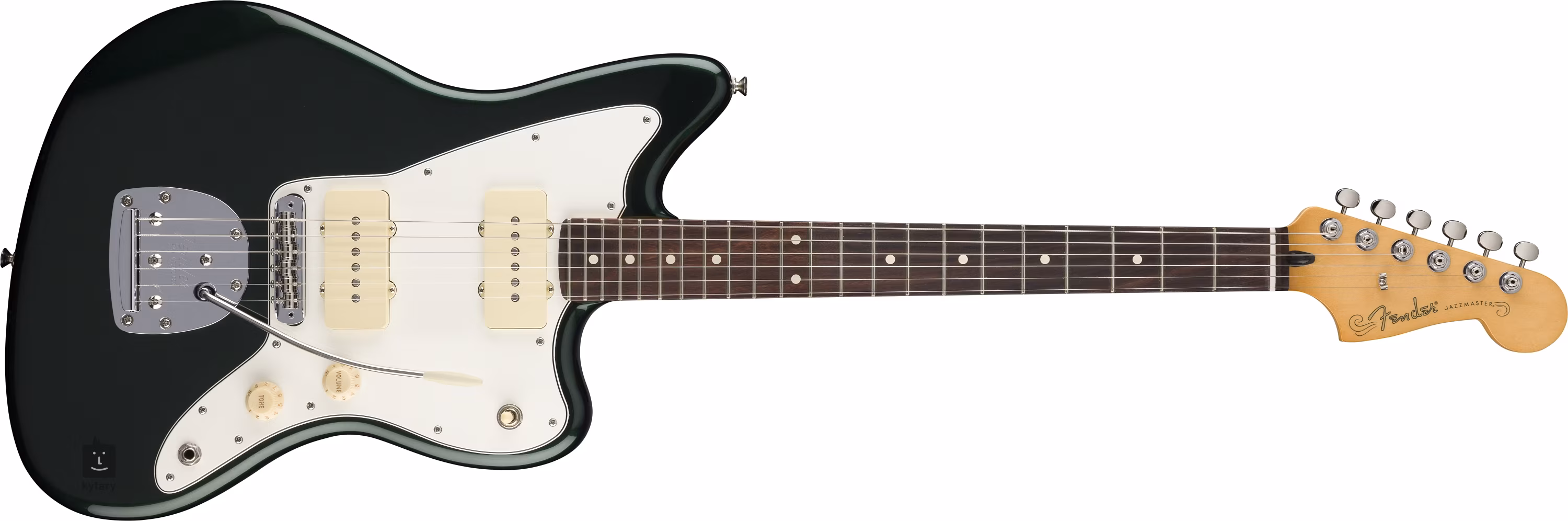 Das Wort Jazzmaster im Namen der DE Player II Jazzmaster RW BRG Limited Edition-Gitarre der Marke deutet eindeutig auf die ursprüngliche Intention hin, aber dieses Musikinstrument mit seiner typischen Offset-Korpusform wird nicht mit Jazz in Verbindung gebracht - es hat bei Musikern aus der alternativen Musikszene (von Surf-Rock bis Indie-Rock) an Popularität gewonnen. Der Erle-Korpus der Gitarre ist mit einem glänzenden Polyester-Lack überzogen. Der Ahornhals mit "Modern C"-Profil ist auf ein Palisandergriffbrett mit abgerundeten Kanten und zweiundzwanzig Medium-Jumbo-Bünden geleimt.