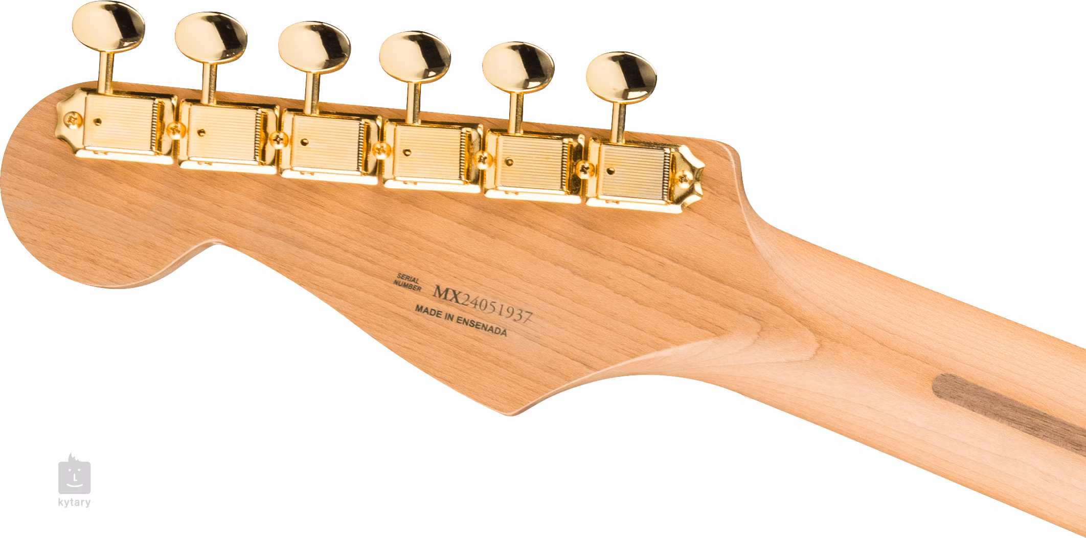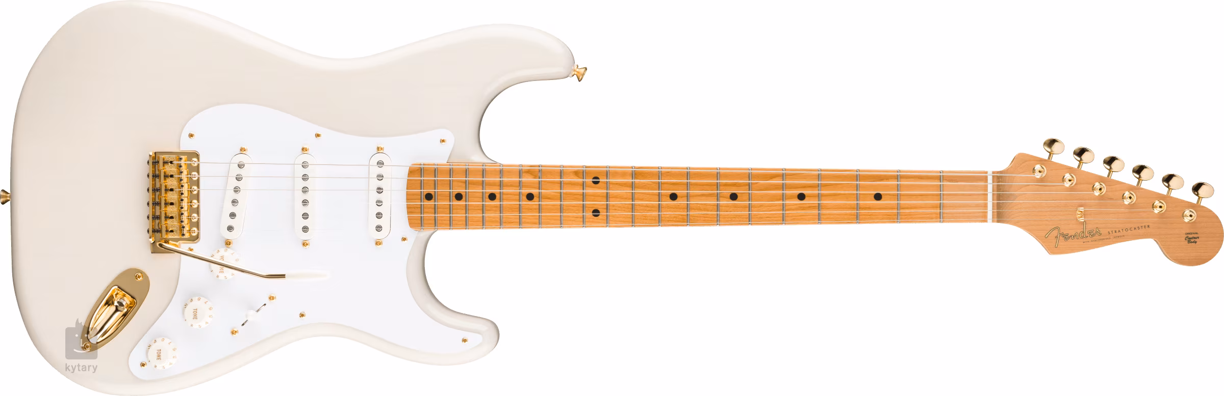 Ein Trio von Custom Shop Fat '50s Single-Coil-Tonabnehmern verleiht der Gitarre einen warmen, lebendigen Ton mit deutlich erkennbarer Fender-DNA. Der Charakter des Tons lässt sich mit den Standardreglern einstellen. Die Saiten sind über einem Griffbrett aus synthetischem Knochen in den Vintage-Stimmmechaniken und dem synchronisierten Tremolo des Unternehmens montiert. Das stilvolle Finish wird durch ein einlagiges weißes Schlagbrett, goldene Hardware und das Fender-Logo auf der Kopfplatte akzentuiert.