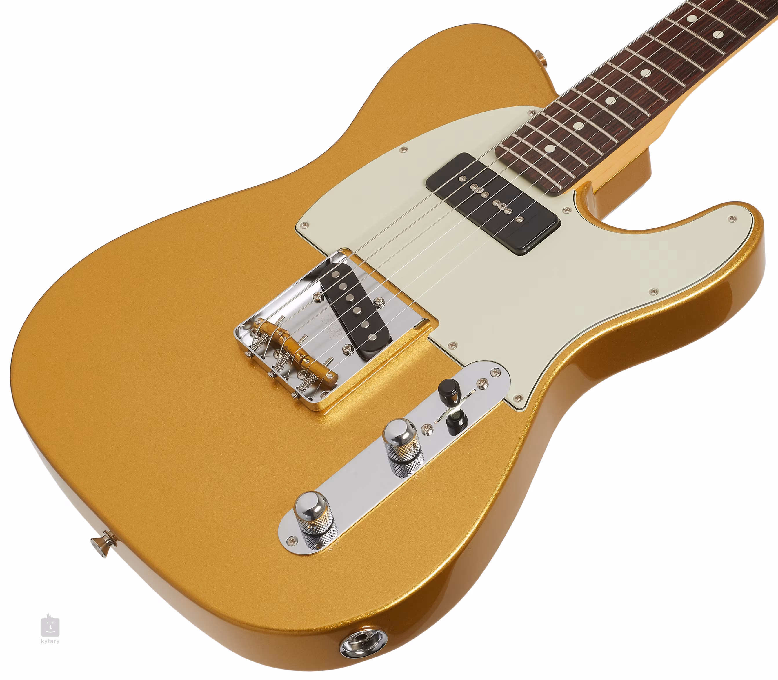 Die Gitarre wird von einem Hybrid II Custom Single-Coil Steg und einem Gotoh P-90 Halstonabnehmer beschallt. Der Klangcharakter lässt sich mit Lautstärkepotentiometern, Tonblende und dreistufigem Tonabnehmerschalter einstellen. Stabile Stimmung und gutes Sustain werden durch die Arretierung der Saiten in Vintage Style Locking Stimmmechaniken und durch eine klassische Telecaster-Brücke im Korpus gewährleistet. Das stilvolle Finish wird durch verchromte Hardware und ein dreilagiges Schlagbrett in Mint Green akzentuiert.
