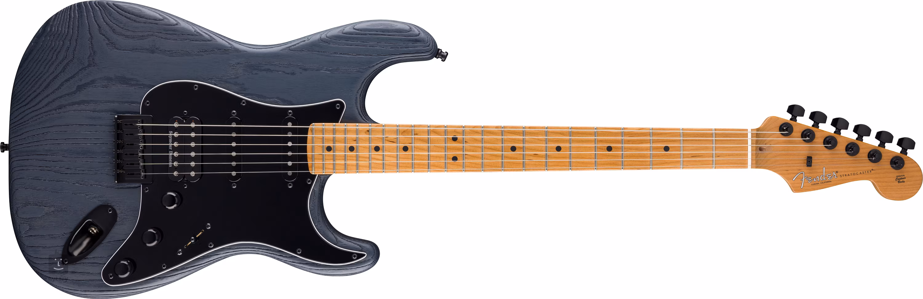 Die Saiten sind in den Locking-Mechaniken des Unternehmens verankert und werden unkonventionell durch eine feste Brücke im Korpus gehalten. Das stilvolle Finish wird durch ein schwarzes Schlagbrett und schwarze Hardware akzentuiert.