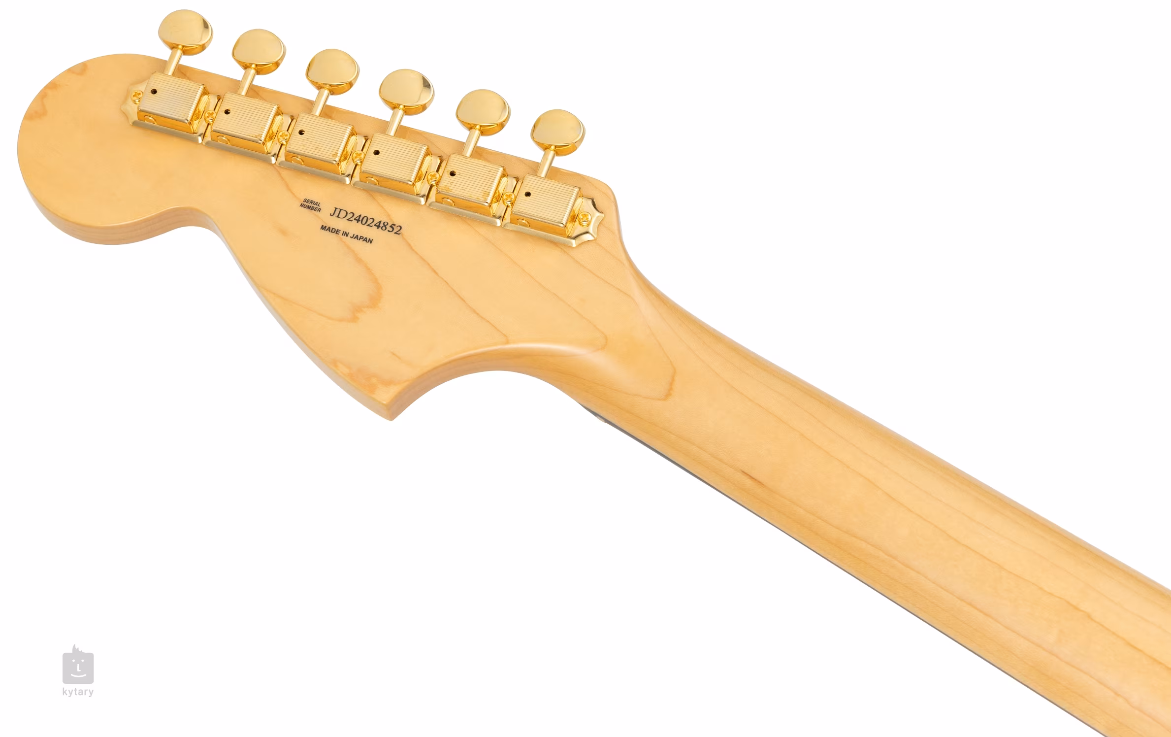 Ein Paar Single-Coil-Pickups im Vintage-Stil verleihen der Gitarre einen warmen Sound und ein Gefühl, das eindeutig Fender-DNA erkennen lässt. Die Konturen des Sounds lassen sich mit den Lautstärke- und Tonreglern einstellen. Mit zwei Mini-Kippschaltern lassen sich die einzelnen Pickups aktivieren, wobei man wählen kann, ob man sie ein- oder aussteckt. Die Saiten sind über das Knochengriffbrett in den hauseigenen Vintage-Stimmmechaniken und in einem dynamischen Vibrato/Mustang-Tremolo montiert, d.h. der schwebende Saitenhalter ist Teil des dynamischen Vibratos. Die stilvolle Verarbeitung wird durch goldene Hardware und ein schwarzes dreilagiges Schlagbrett akzentuiert.