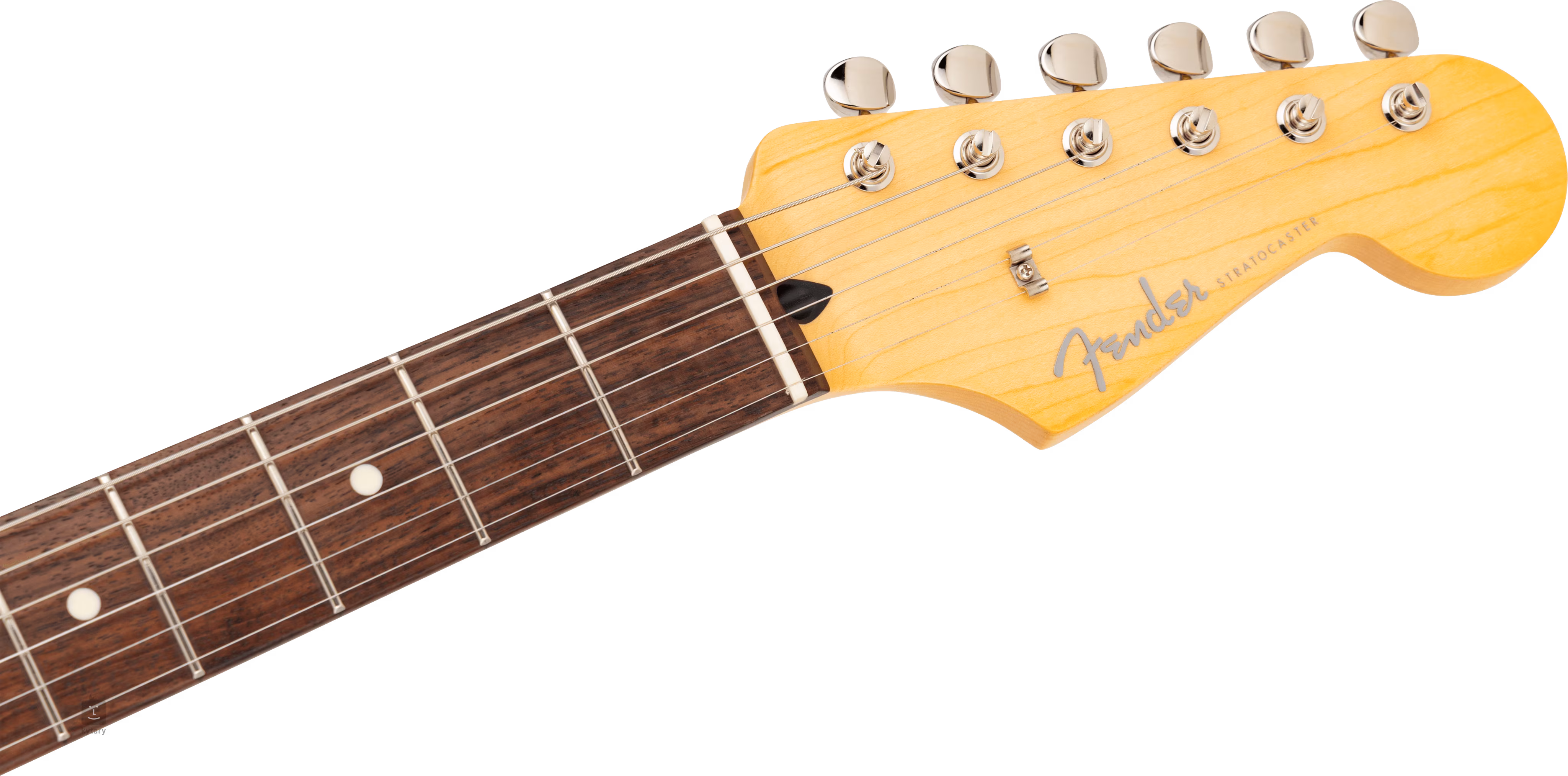 Ein Trio von Single-Coil-Tonabnehmern im Vintage-Stil verleiht der Gitarre einen warmen Sound und ein Spielgefühl mit klar erkennbarer Fender-DNA. Die Konturen des Klangs lassen sich mit den Standardreglern einstellen. Die Saiten sind über dem Griffbrett aus Knochen in den Vintage-Style Locking Tunern des Unternehmens und in einem synchronisierten 2-Punkt-Tremolo montiert. Das Styling wird durch ein vierlagiges Schlagbrett aus Schildpatt-Imitat und das Fender Stratocaster-Logo auf der Kopfplatte akzentuiert.