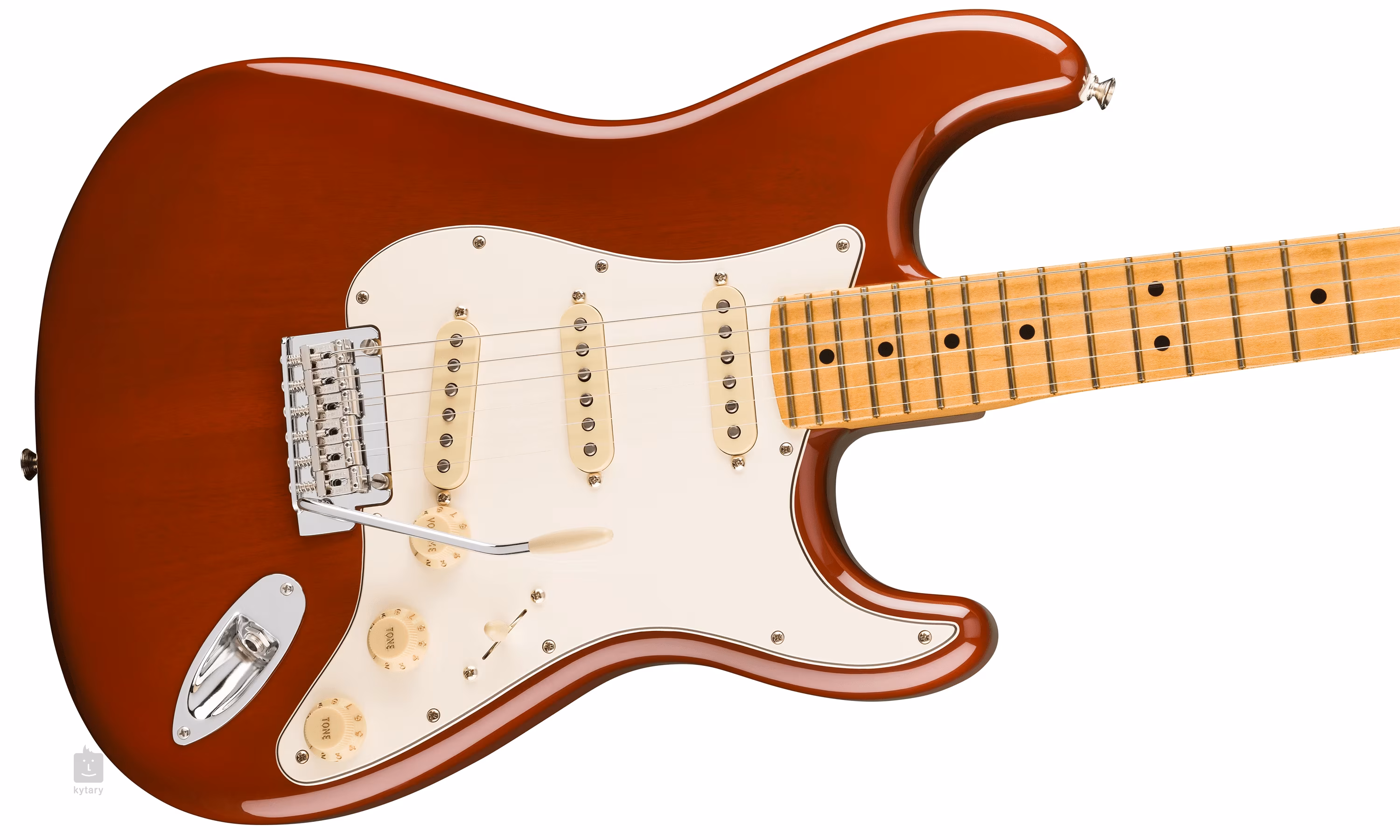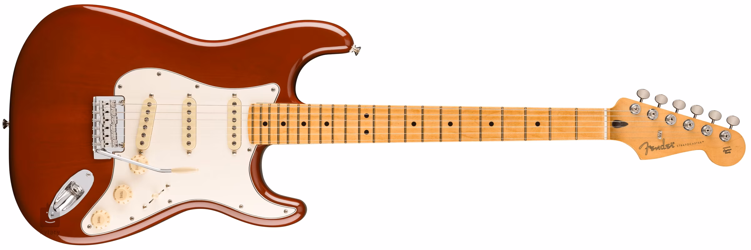 Drei Single-Coil-Tonabnehmer der Player-Serie mit Alnico-5-Magneten verleihen der Gitarre ein modernes Fender-Gefühl und einen Sound, den Sie in einer Vielzahl von Musikstilen schätzen werden. Der Klangcharakter kann mit den Lautstärke- und Tonreglern und dem fünfstufigen Pickup-Schalter beeinflusst werden. Die Saiten sind in ClassicGear-Mechaniken mit einem Übersetzungsverhältnis von 18:1 und einem synchronisierten "2-Punkt"-Tremolo mit Stahlsätteln montiert. Der stilvolle Look der Gitarre wird durch ein helles 3-lagiges Schlagbrett und eine glänzende Transparent Mocha Burst Lackierung unterstrichen.