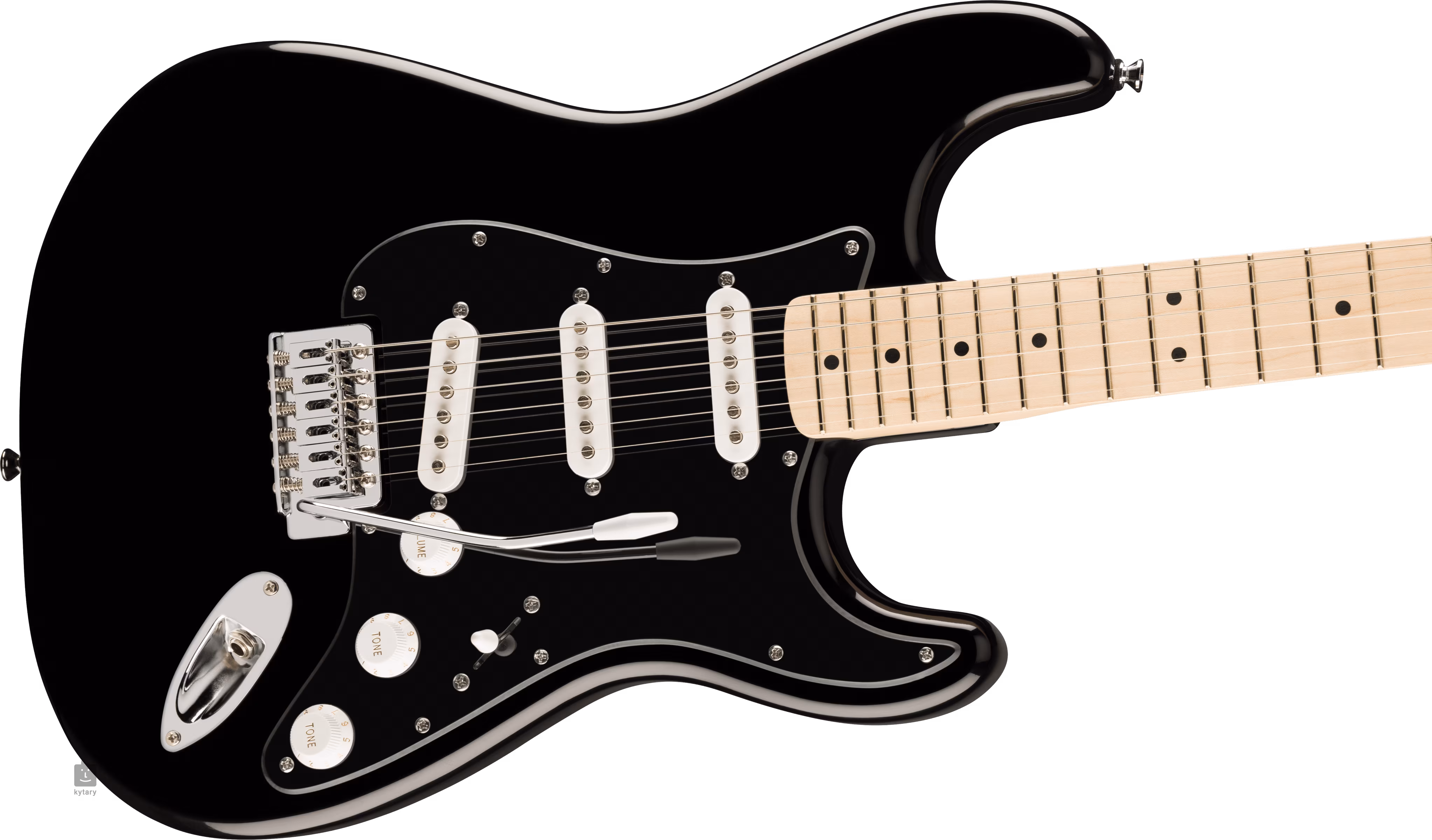 Drei firmeneigene Single-Coil-Tonabnehmer mit Keramikmagneten verleihen der Gitarre einen sauberen, klingenden Sound mit dem Feeling von Strat-Modellen, der in einer Vielzahl von Musikstilen nicht verloren geht. Die Konturen der Gitarre lassen sich mit Lautstärkepotentiometern, zwei Tonreglern und einem fünfstufigen Pickup-Schalter einstellen. Die Saiten sind in den Druckguss-Stimmmechaniken und dem synchronisierten Tremolo des Unternehmens verankert. Das stilvolle Strat-Design wird durch verchromte Hardware, ein schwarzes einlagiges Schlagbrett und das Firmenlogo auf der Kopfplatte akzentuiert.