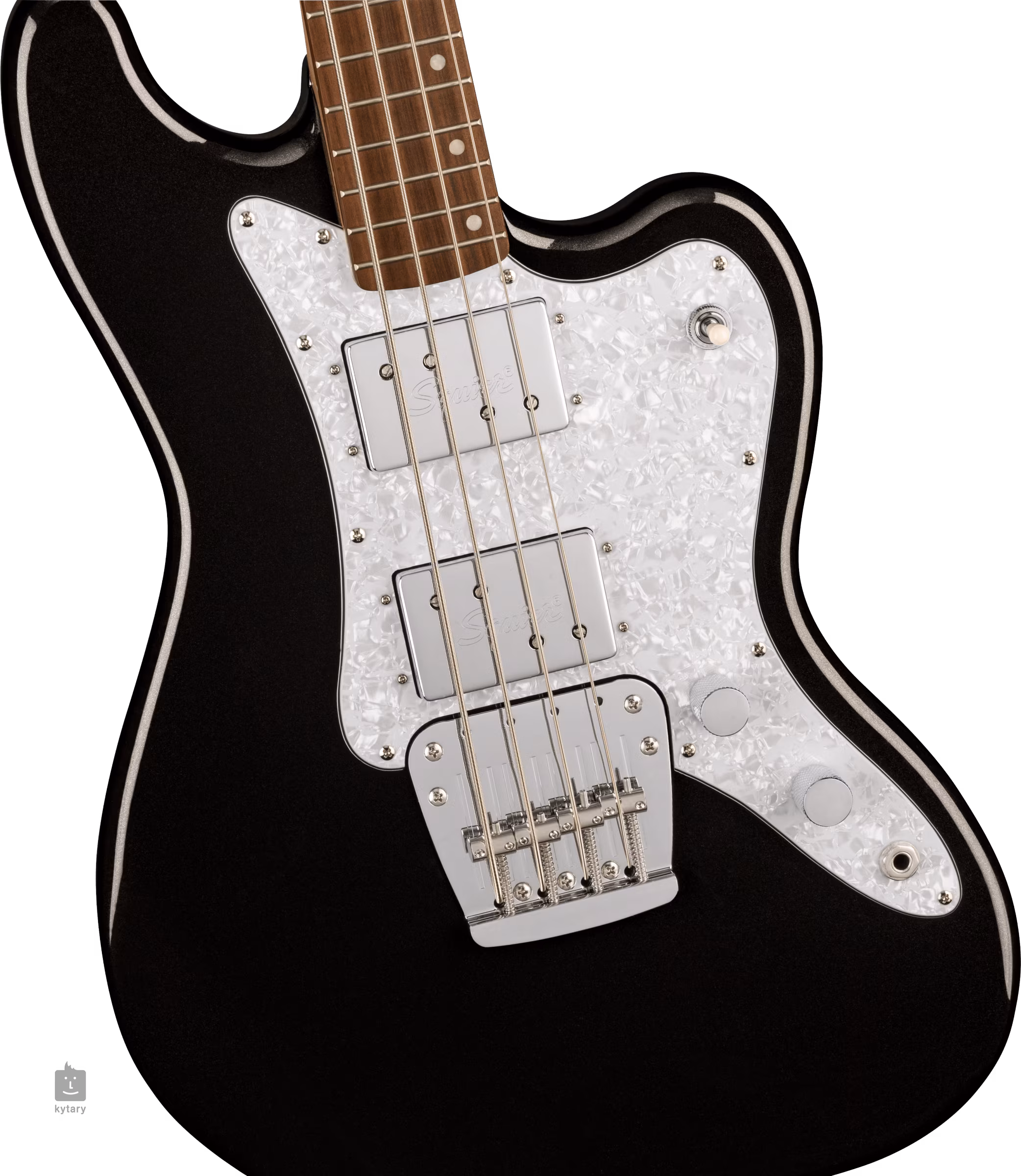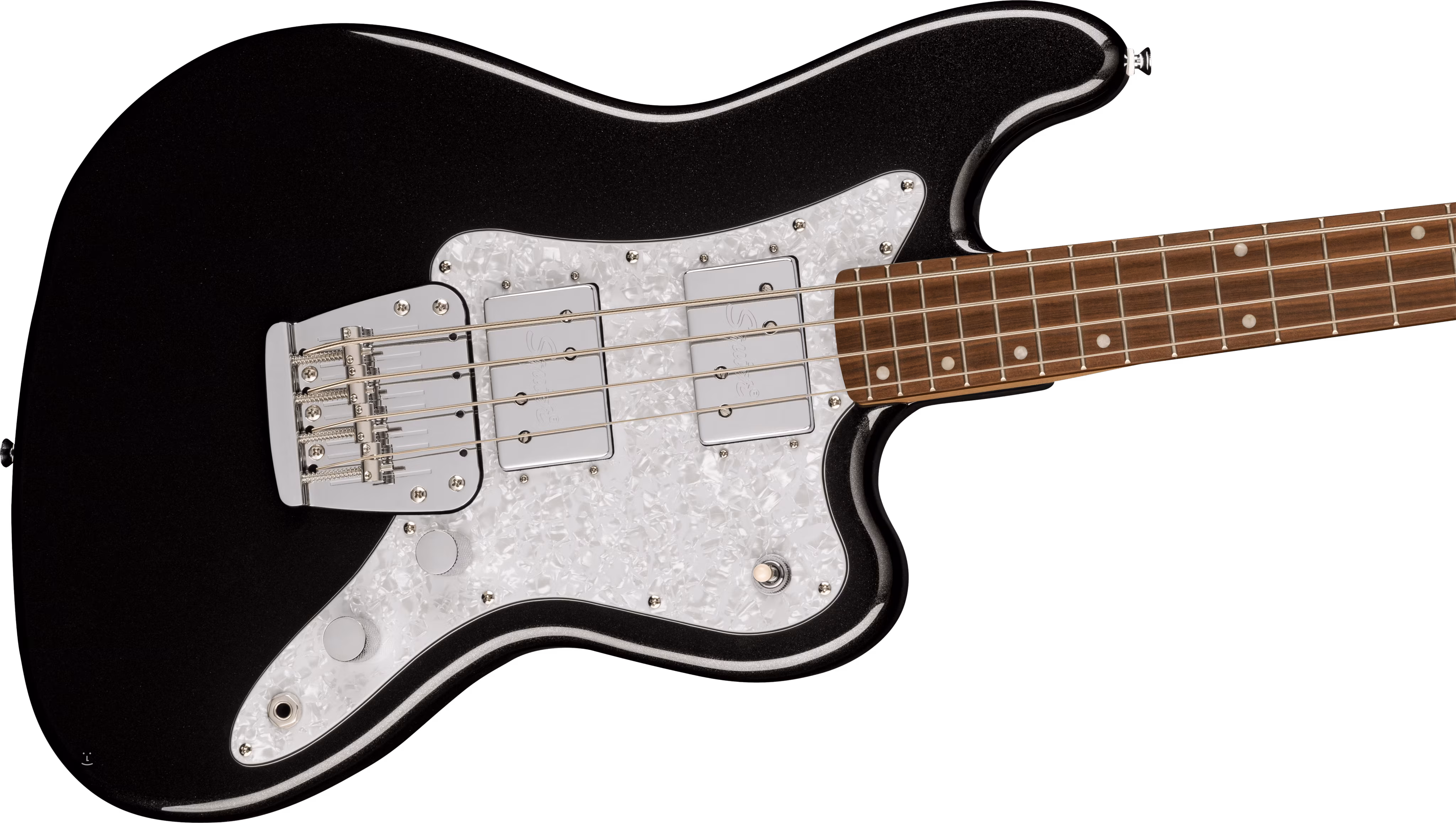 Der Paranormal Rascal Bass HH LRL WPPG MBK ist ein Short-Scale-Bass, der lose von einigen der exzentrischen Designs von Fender aus den 1960er Jahren inspiriert ist. Seine Verarbeitung kombiniert die Offset-Korpusform des Fender Bass VI mit der einzigartigen Kopfplattenform des Fender Coronado Bass, dem String-Through-Body des Mustang Bass und dem Sound von zwei Fender-Designed Wide Range Humbuckern.