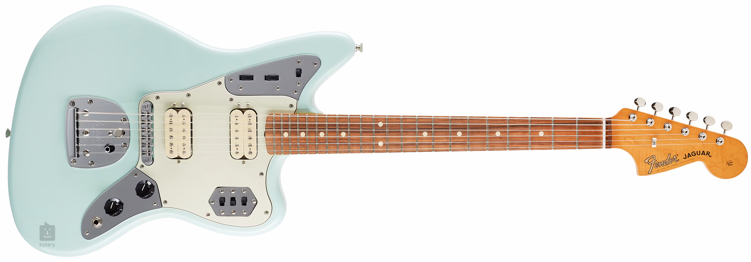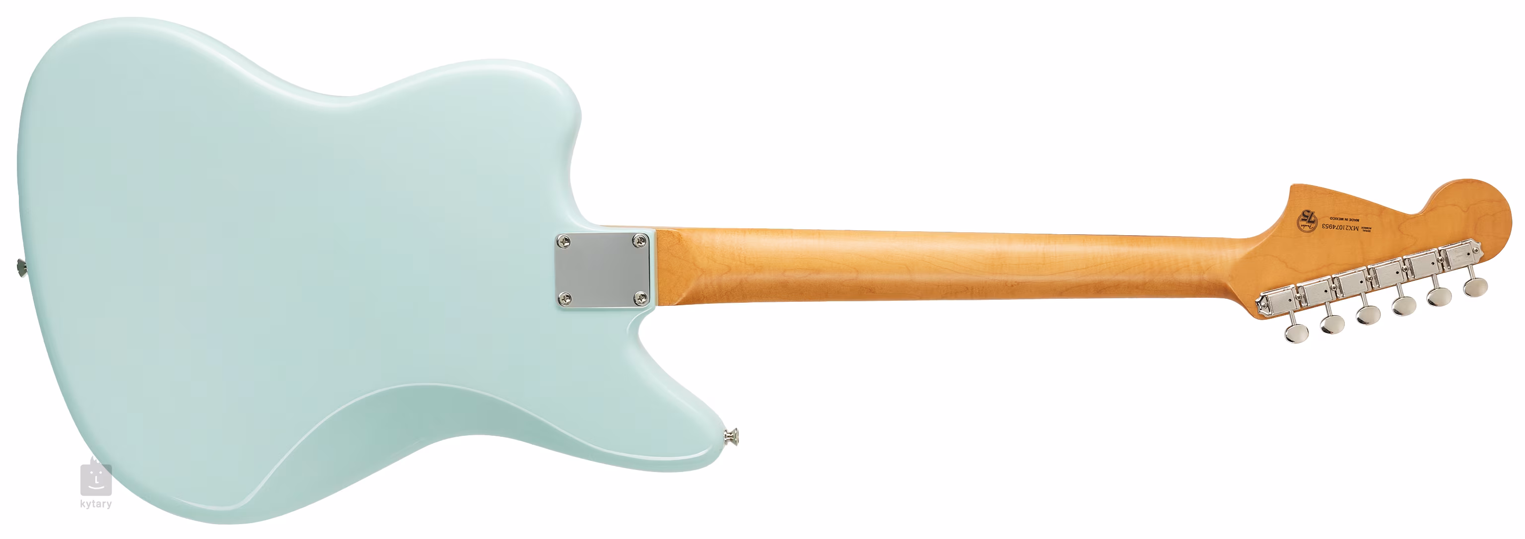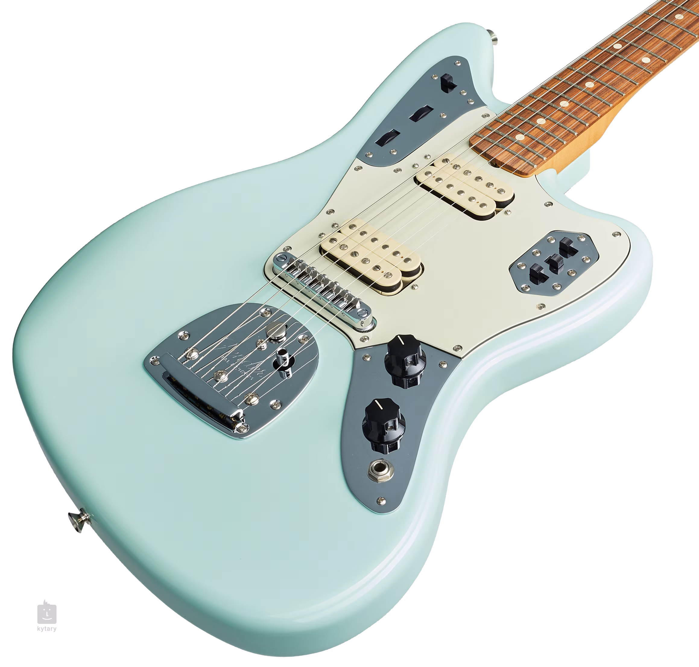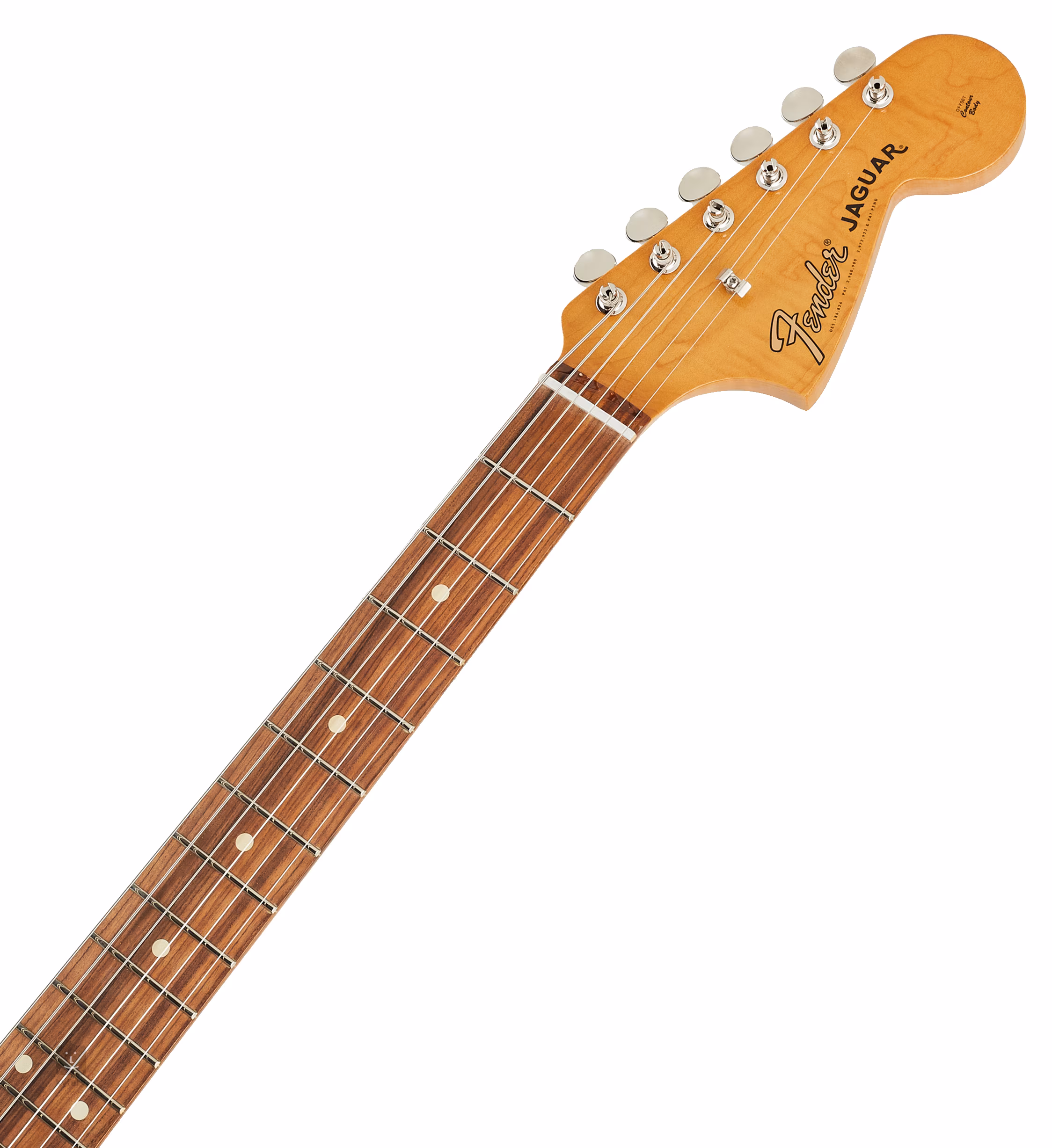 Der Erle-Korpus der Gitarre ist mit einem glänzenden Polyester-Lack überzogen. Der geschraubte Ahornhals mit einem ansprechenden "Modern C"-Profil ist auf ein Pau-Ferro-Griffbrett mit einem modernen 9,5"-Radius und einer für Jaguars typischen kürzeren Mensur geklebt und mit 22 Medium-Jumbo-Bünden ausgestattet. Positionsmarkierungen erleichtern die Navigation auf der Oberfläche.