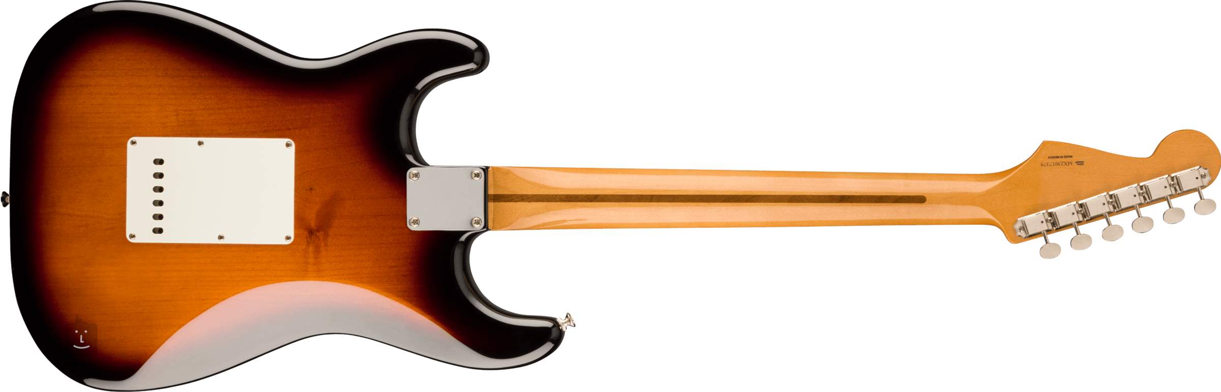 Ein Trio von Vintage-Tonabnehmern im Stil der 50er Jahre verleiht der Gitarre einen warmen, lebendigen Ton mit deutlich erkennbarer Fender-DNA. Der Klangcharakter lässt sich mit den üblichen Lautstärke- und Tonreglern und einem fünfstufigen Pickup-Schalter einstellen. Die Saiten sind über dem Griffbrett aus synthetischem Knochen in den Vintage-Stimmmechaniken des Unternehmens und einem synchronisierten Tremolo mit Sechs-Punkt-Verankerung montiert. Das Styling wird durch ein weißes Schlagbrett und das Fender-Logo auf der Kopfplatte akzentuiert.