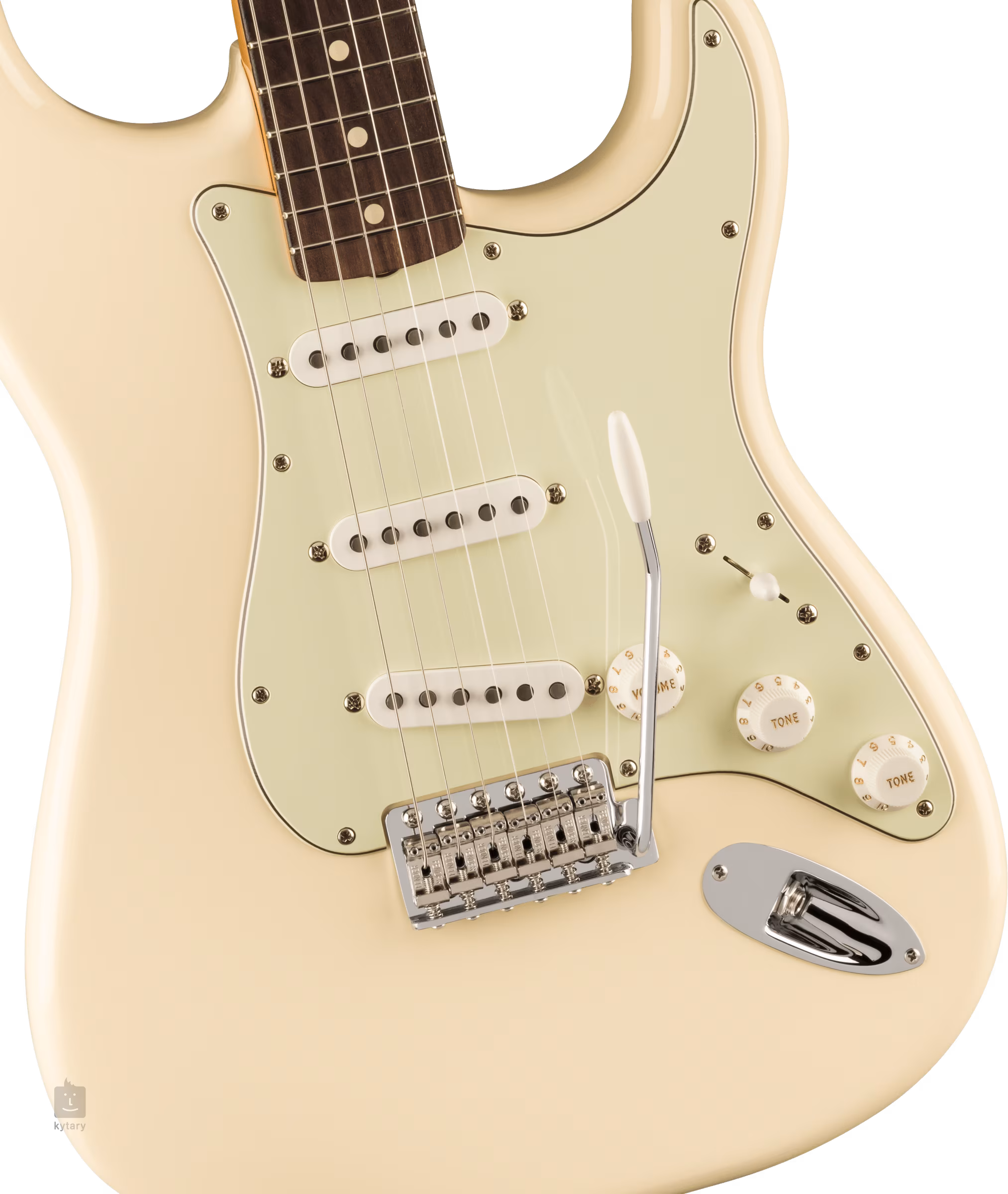 Ein Trio von 60er-Jahre-Tonabnehmern im Vintage-Stil verleiht der Gitarre einen warmen, lebendigen Ton mit deutlich erkennbarer Fender-DNA. Der Klangcharakter lässt sich mit den üblichen Lautstärke- und Tonreglern und einem fünfstufigen Pickup-Schalter einstellen. Die Saiten sind über dem Griffbrett aus synthetischem Knochen in den Vintage-Stimmmechaniken des Unternehmens und dem synchronisierten Tremolo mit Sechs-Punkt-Verankerung montiert. Das Styling wird durch ein dreilagiges Schlagbrett in Mint Green und das Fender-Logo auf der Kopfplatte akzentuiert.