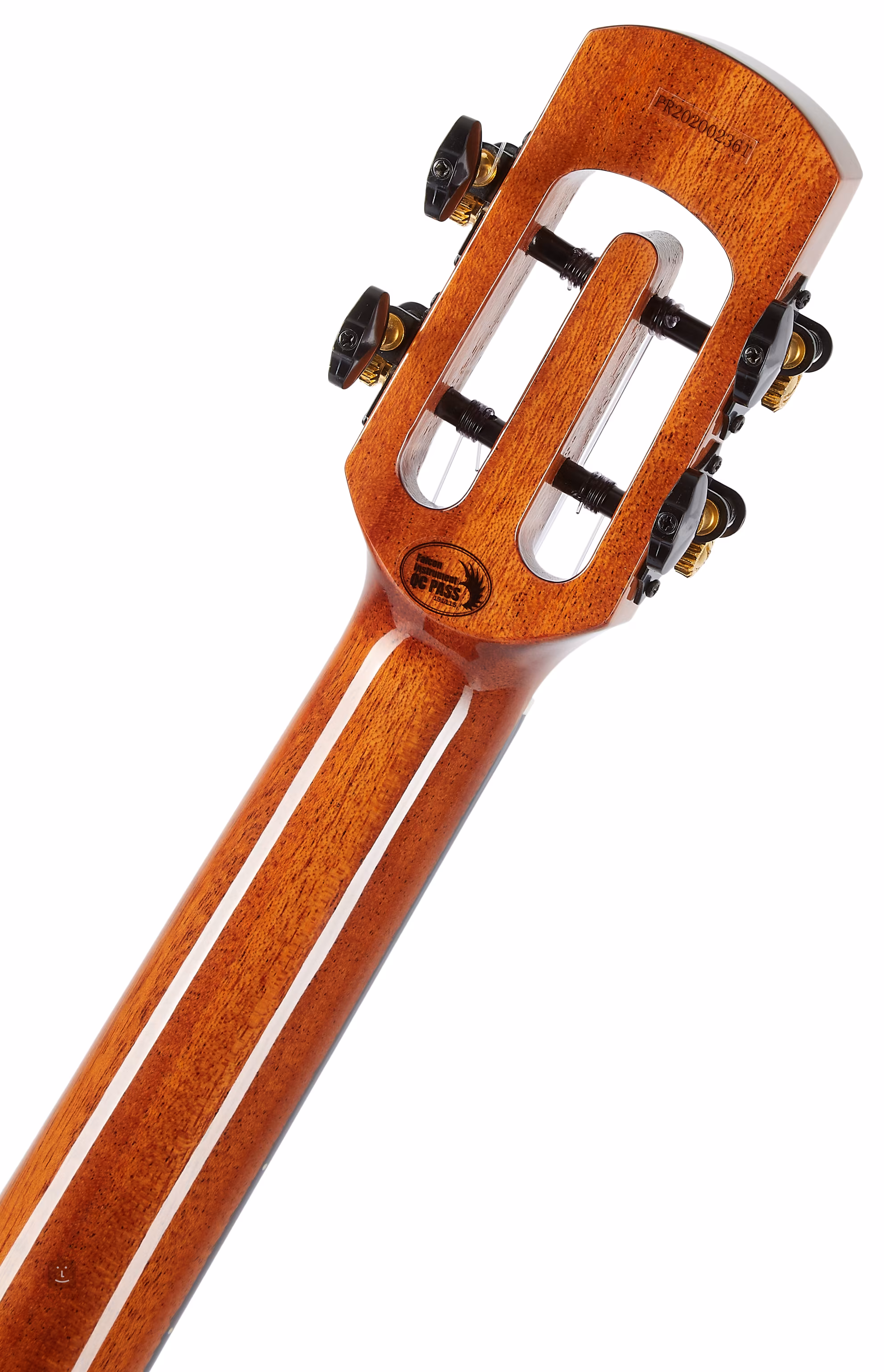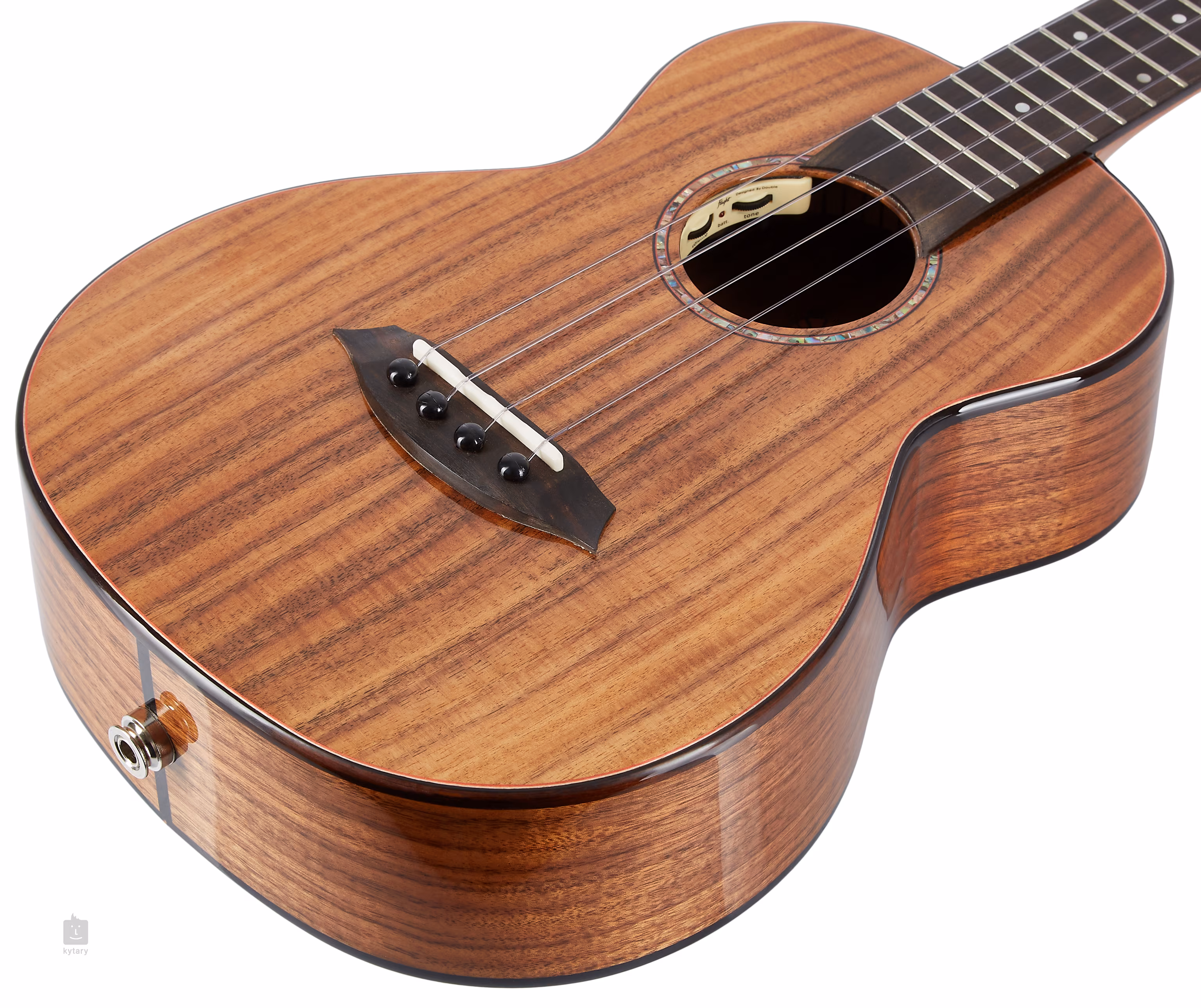 Der Korpus der Phantom Tenor-Ukulele ist aus ausgesuchtem Akazienholz gefertigt. Bei der Wahl des Halses und des Griffbretts wurde auf die bewährten Materialien afrikanisches Mahagoni und Ebenholz zurückgegriffen, die bei hochwertigen Instrumenten verwendet werden. Die Saiten sind über einen kompensierten Sattel und ein Griffbrett aus Knochen in offenen Stimmmechaniken und einem Ebenholzgriffbrett verankert. Die Qualität der Verarbeitung zeigt sich im originellen Kopfplatten-Design, das die Phantom-Ukulele von anderen Modellen der Royal-Reihe unterscheidet, in der Hochglanzlackierung der Decke und in den traditionellen Merkmalen der Positionsmarkierungen auf dem Ebenholz-Griffbrett und der Perlmutt-Rosette.
