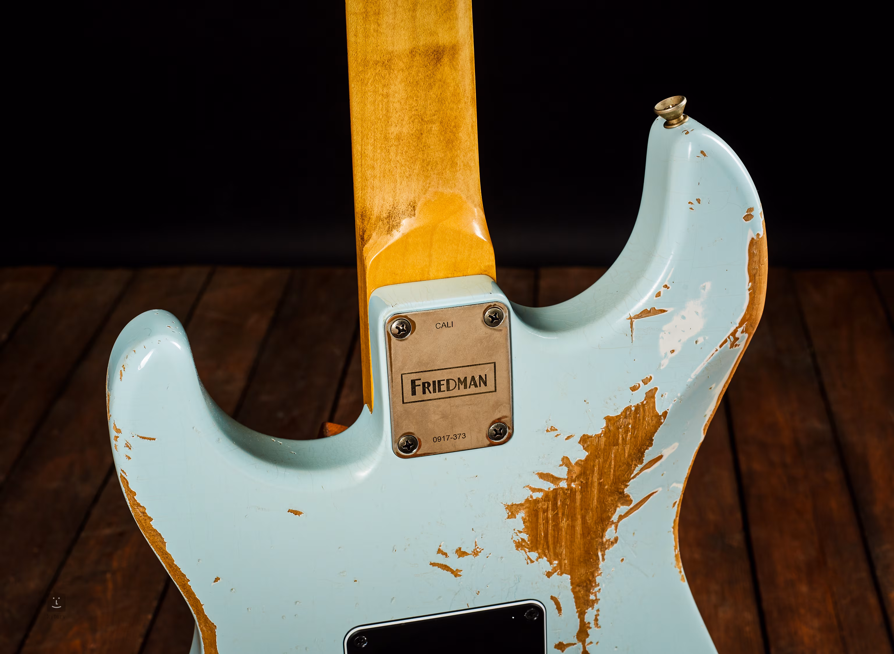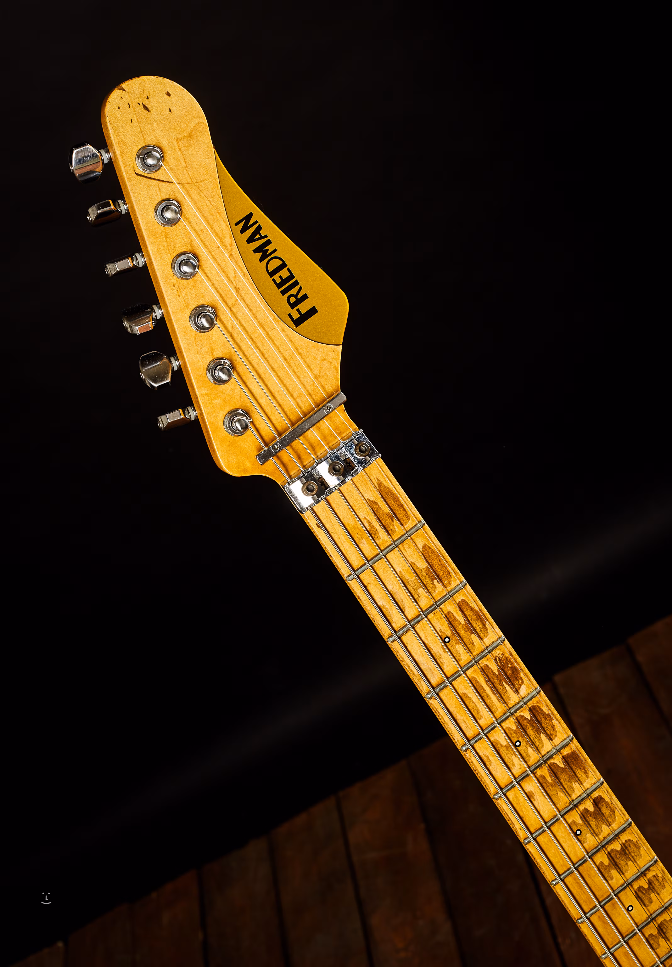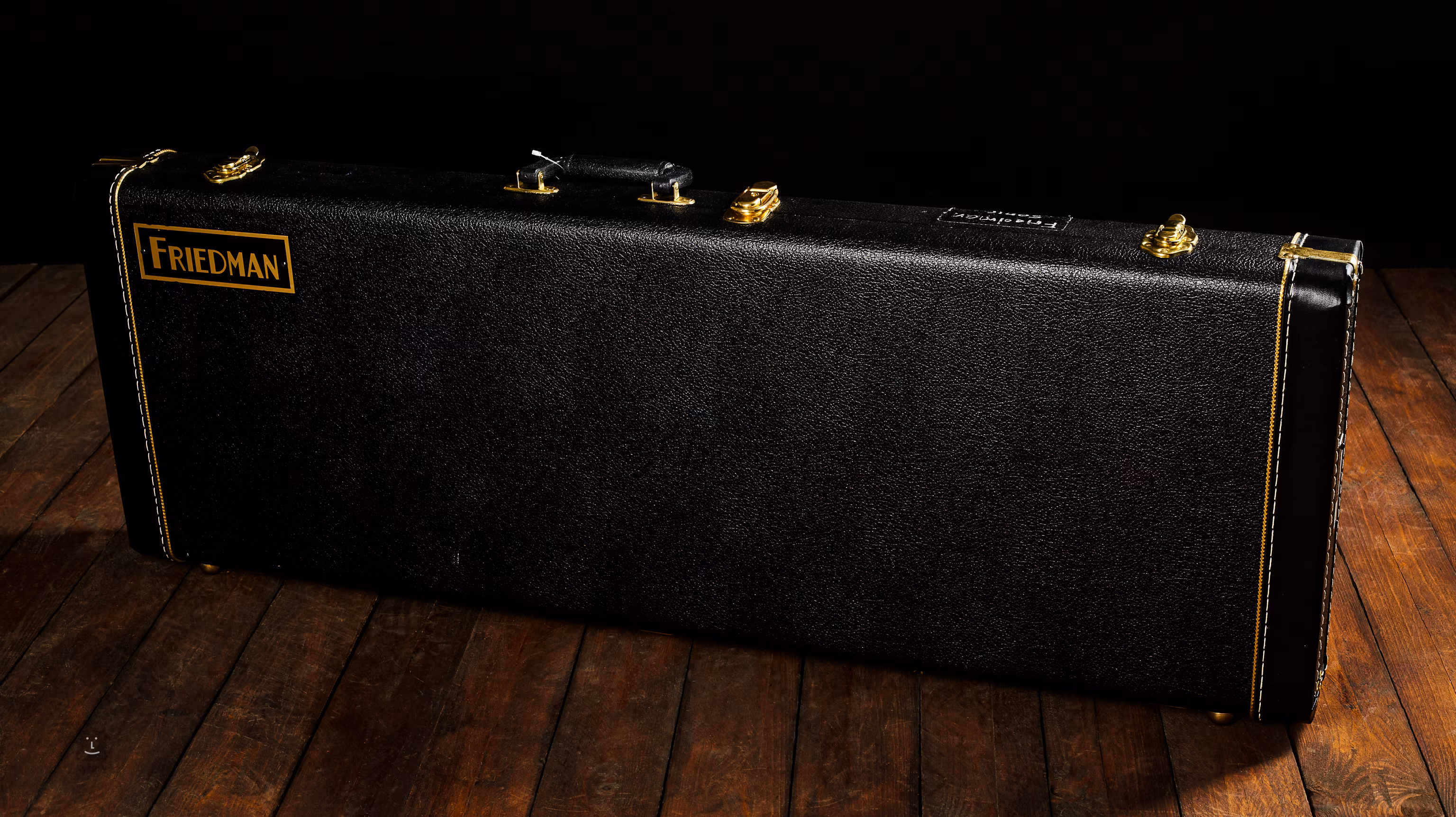 Boutique E-Gitarren werden für die etablierte Luxusmarke Friedmann in den USA von dem renommierten Gitarrenbauer Grover Jackson (ex Jackson Guitars, Charvel, Washburn USA, Rickenbacker, B.C.Rich etc...) hergestellt, dieses Cali Modell ist eine Stratocaster mit zwei Humbuckern und einem Floyd Rose Double-Return Tremolo.