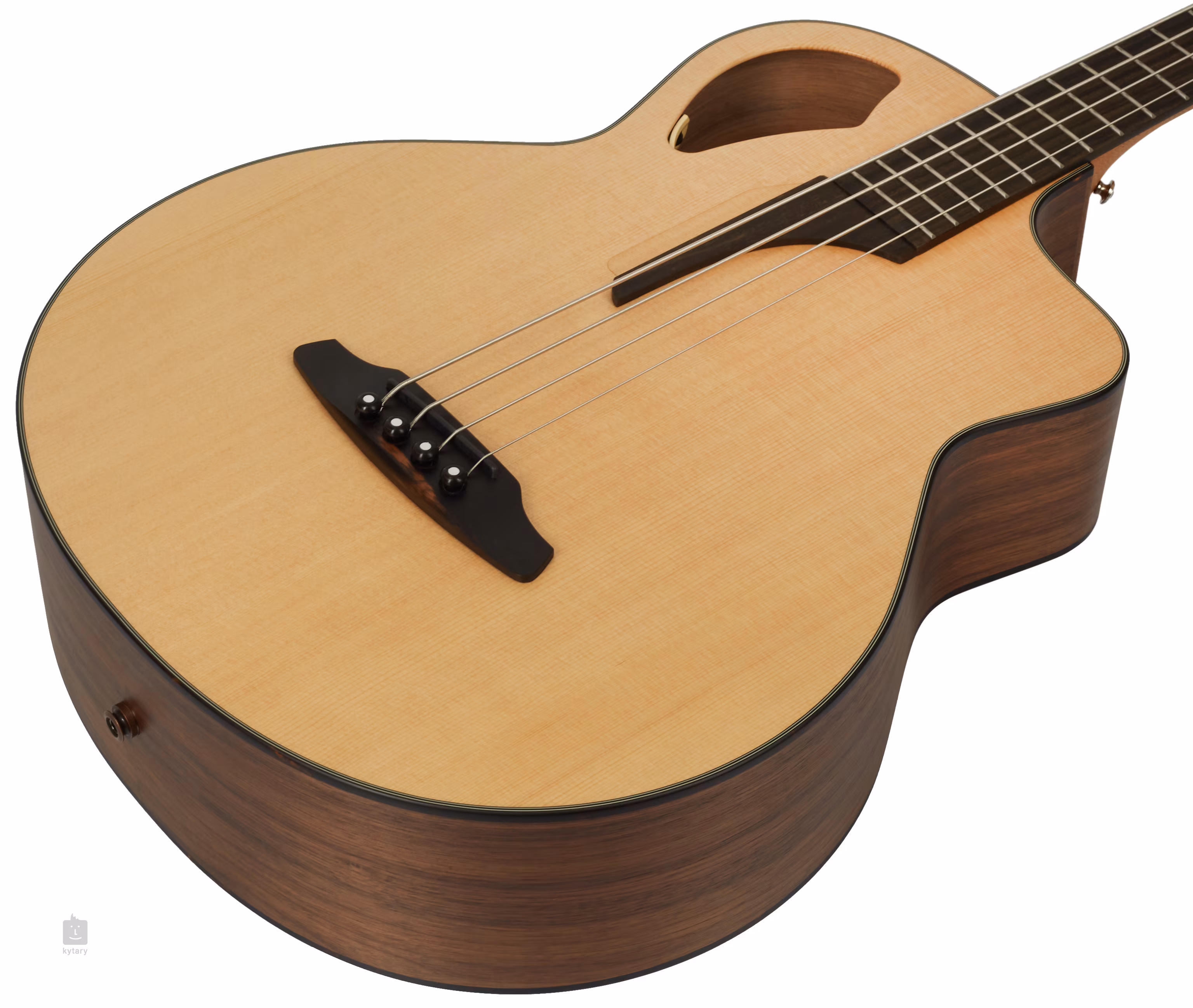 Der Furch-Akustikbass ist aus Vollmaterial gefertigt und verwendet eine firmeneigene Konstruktion für die Decke. Dieses Instrument ist ohne Kompromisse gebaut. Das Resonanzloch zum Beispiel mag in seiner Form wie moderne Kunst aussehen, aber seine Platzierung wurde sorgfältig gewählt, um die Leistung des Instruments im Tieftonbereich zu maximieren.