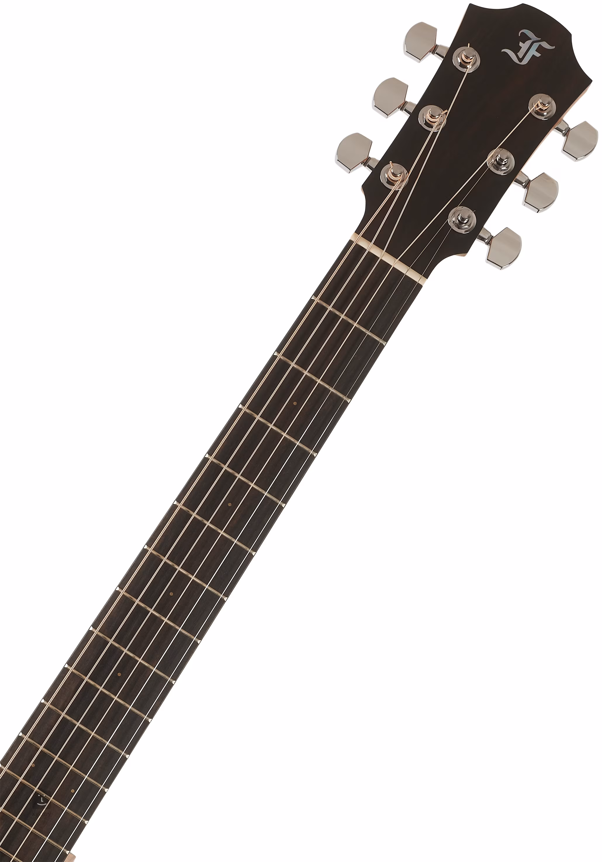 Die Orientierung auf dem Ebenholzgriffbrett wird durch seitliche und vordere Positionsmarkierungen erleichtert. Die präzise und stabile Stimmung wird durch verchromte Mechaniken mit einem Übersetzungsverhältnis von 1:18 garantiert. Die feine Verarbeitung wird durch das Binding aus Schildpattimitat, eine Doppelringrosette mit schwarzer Walnusseinlage, gebürstete Bünde und ein transparentes Schlagbrett, das die natürliche Schönheit des Holzes zur Geltung bringt, unterstrichen.