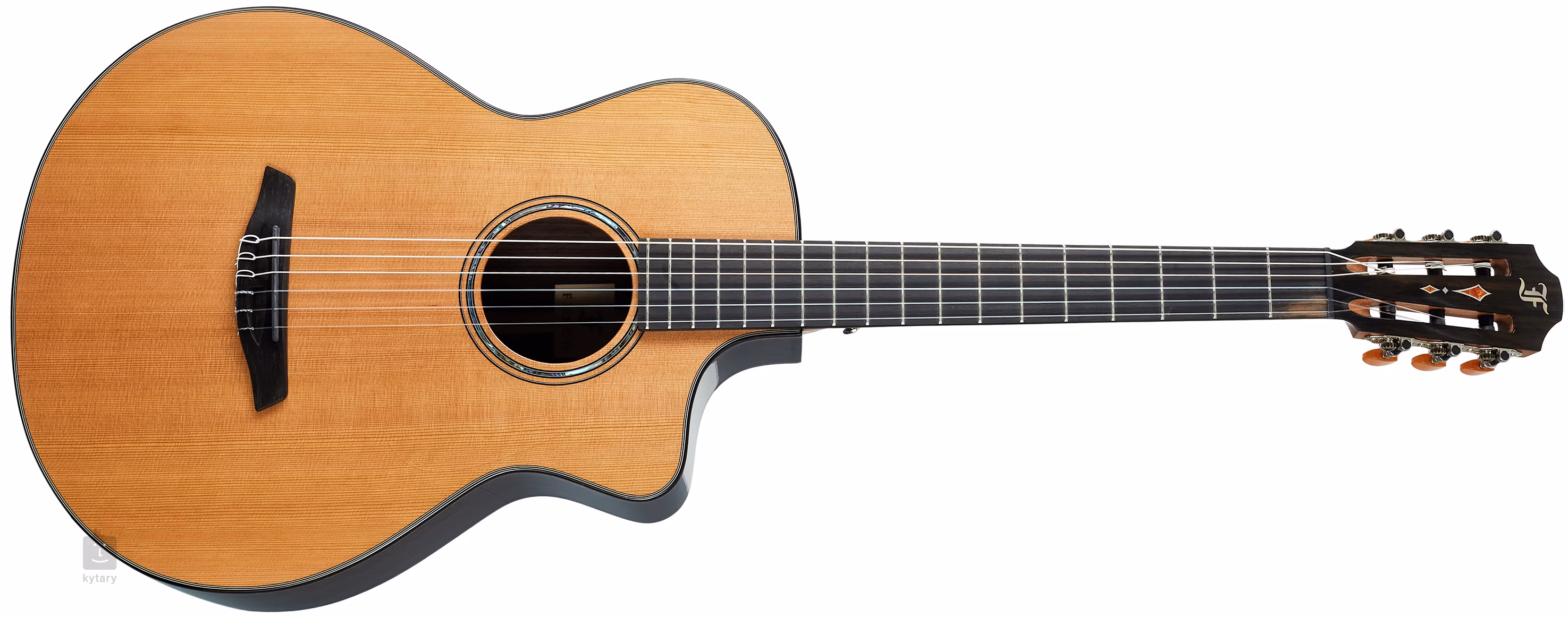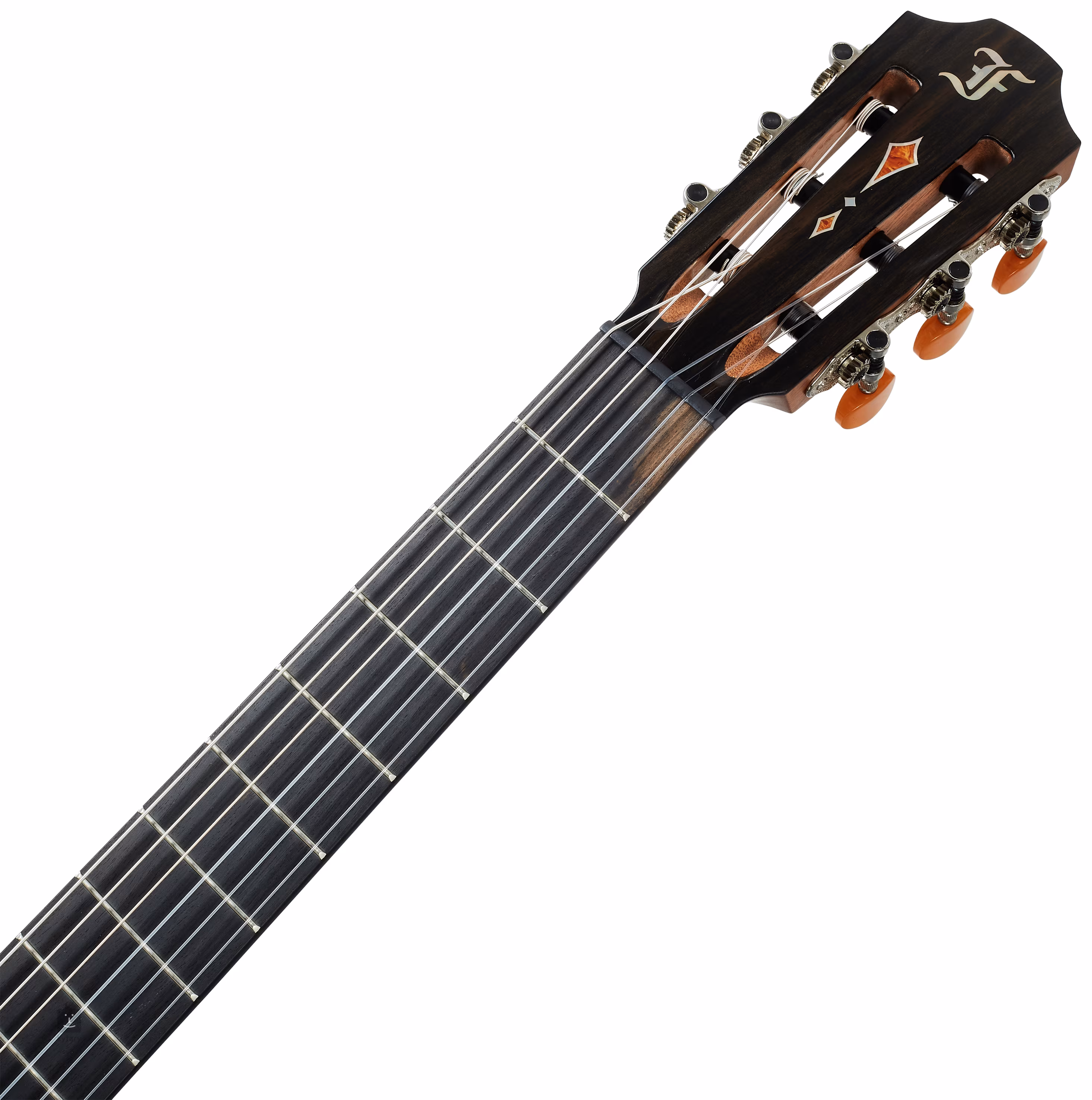 Ein Ebenholz-Griffbrett ist auf einen Hals aus afrikanischem Mahagoni mit einem Furch Soft V-Profil und einer traditionellen Verbindung zum Korpus im 12. Nylonsaiten sind über die TusQ-Null- und Sattelbünde in einem Ebenholz-Griffbrett und Schaller Hauser Chrom-Mechaniken befestigt. Der attraktive, natürliche Look der Gitarre wird durch Details in Form einer glänzenden Korpuslackierung, einer Schildpattimitat-Einfassung mit kontrastierenden Linien, einer Doppelring-Rosette mit Schildpattimitat-Einlage, weißen Perlmutt-Positionsmarkern, polierten Ebenholz-Stimmwirbeln und einem transparenten Schlagbrett unterstrichen.