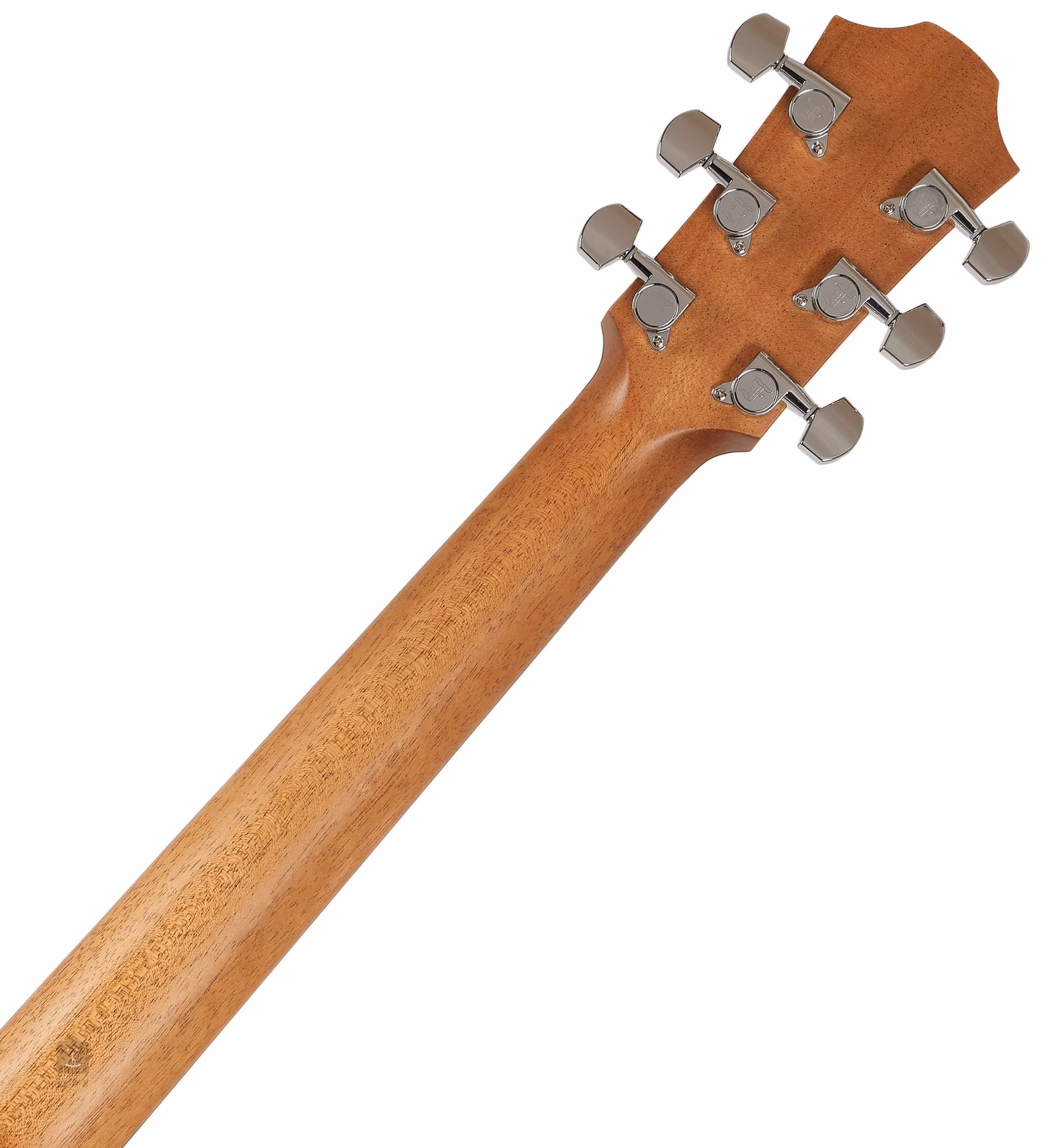 Die Orientierung auf dem Ebenholz-Griffbrett wird durch vordere und seitliche Perlmutt-Punktmarkierungen erleichtert. Das transparente Schlagbrett lässt die natürliche Maserung des Holzes zur Geltung kommen, ohne die Resonanz des Resonanzbodens zu beeinträchtigen. Die präzise und stabile Stimmung wird durch verchromte Mechaniken mit einem Übersetzungsverhältnis von 1:18 garantiert. Die schöne Verarbeitung wird durch die Schildpattimitation mit fünf Lagen schwarzer und weißer Kontrastlinien und einer Rosette, die aus einem Doppelring mit Walnusseinlage besteht, unterstrichen.