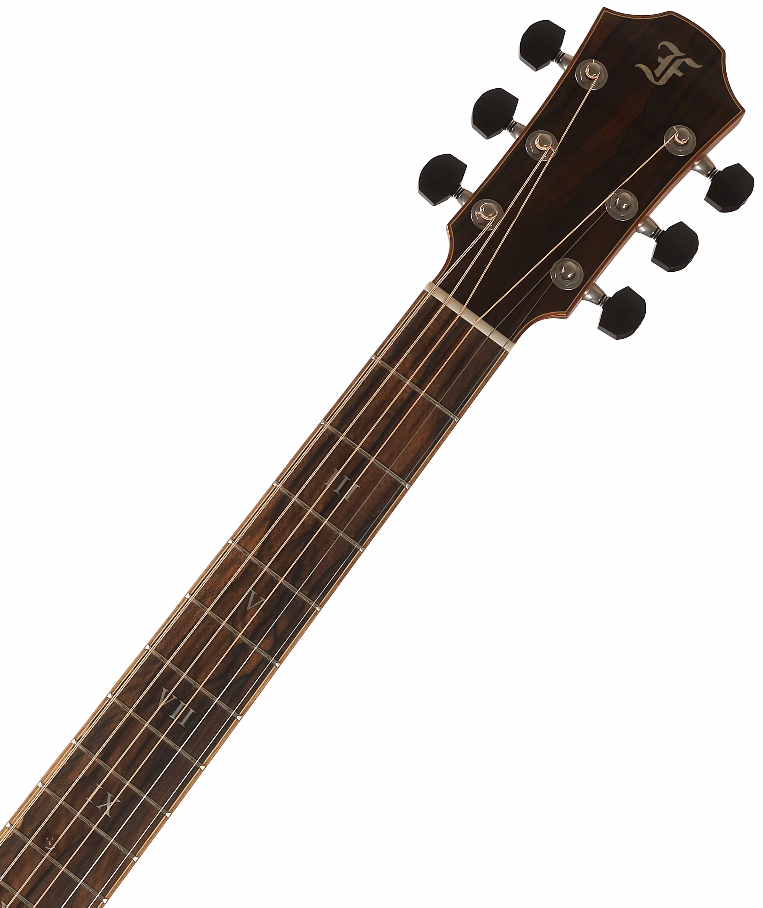 Die außergewöhnliche Optik der Gitarre wird durch die Kombination von Griffbrett, Kopfplatte und Kopfplatte aus exklusivem mittelamerikanischem Ziricote-Holz mit markanter Maserung unterstrichen. Die Schönheit der verwendeten Hölzer wird durch eine Reihe von dekorativen Details unterstrichen, allen voran das Binding und die hochwertige Ringrosette aus hawaiianischem Koa, die Perlmutteinlage (Abalone) auf dem Resonanzboden oder die römischen Ziffern aus Perlmutt auf dem Griffbrett.