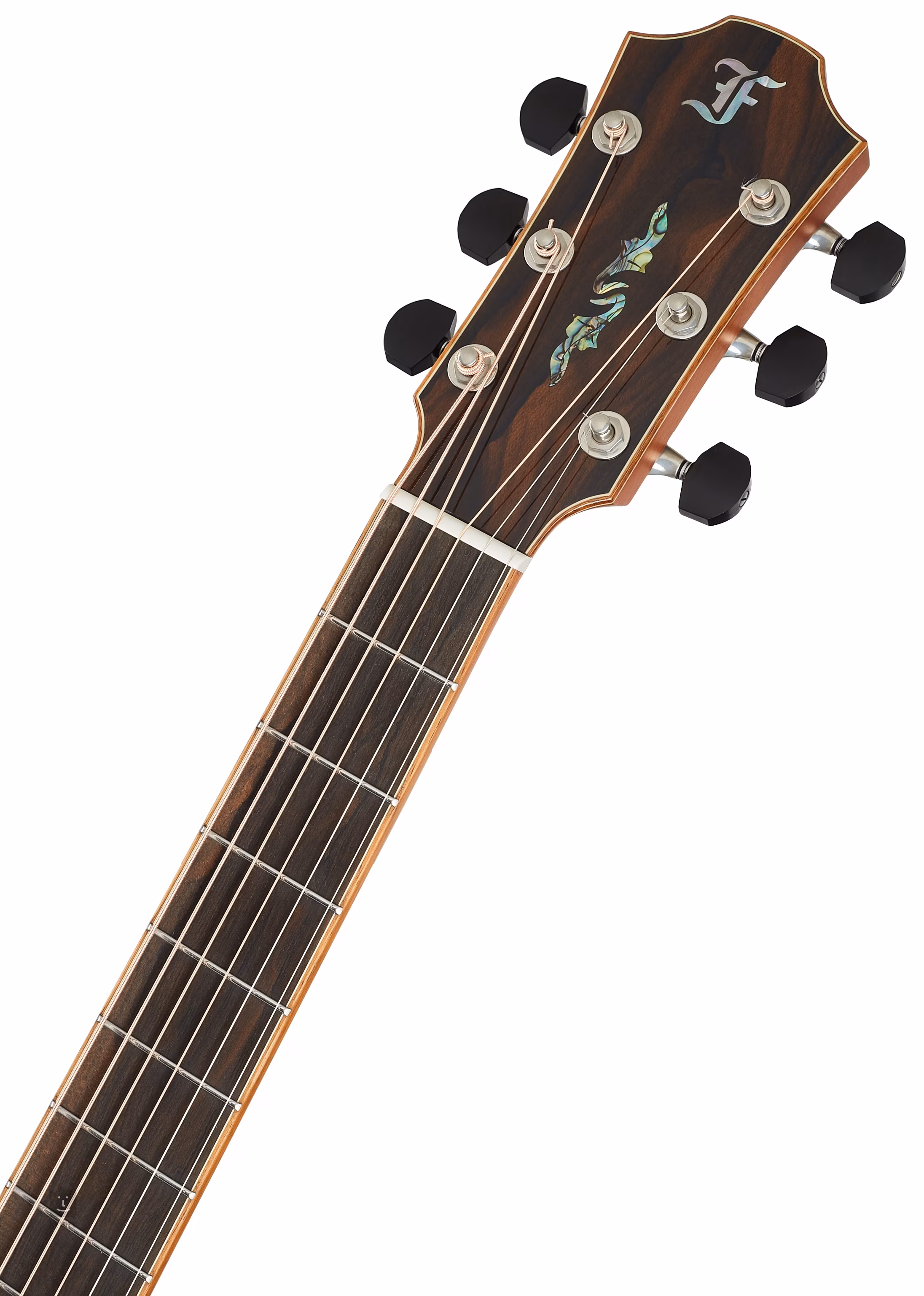 Das Griffbrett aus exklusivem mittelamerikanischem Ziricote-Holz mit markantem Muster ist mit einer Perlenintarsie in Form eines Blattes verziert, und ein ähnliches natürliches Muster aus grüner Abalone befindet sich auf der Kopfplatte. Das transparente Schlagbrett lässt die natürliche Maserung des Holzes zur Geltung kommen, ohne die Resonanz des Resonanzbodens zu beeinträchtigen. Für eine stabile Stimmung sorgt eine hochwertige Gotoh 510 Mechanik in Silberpatina mit polierten Ebenholzwirbeln und einer Übersetzung von 1:21. Das luxuriöse Aussehen der Gitarre wird durch die Kopfplatte und das Griffbrett aus Ziricote-Holz, den Korpus, das Griffbrett und die Kopfplatteneinfassung sowie die Endblockverzierung aus hawaiianischem Koa, die Kopfplatteneinlage aus Abalone-Perlen und die hochwertige Ringrosette aus hawaiianischem Koa und Abalone-Perlen unterstrichen.
