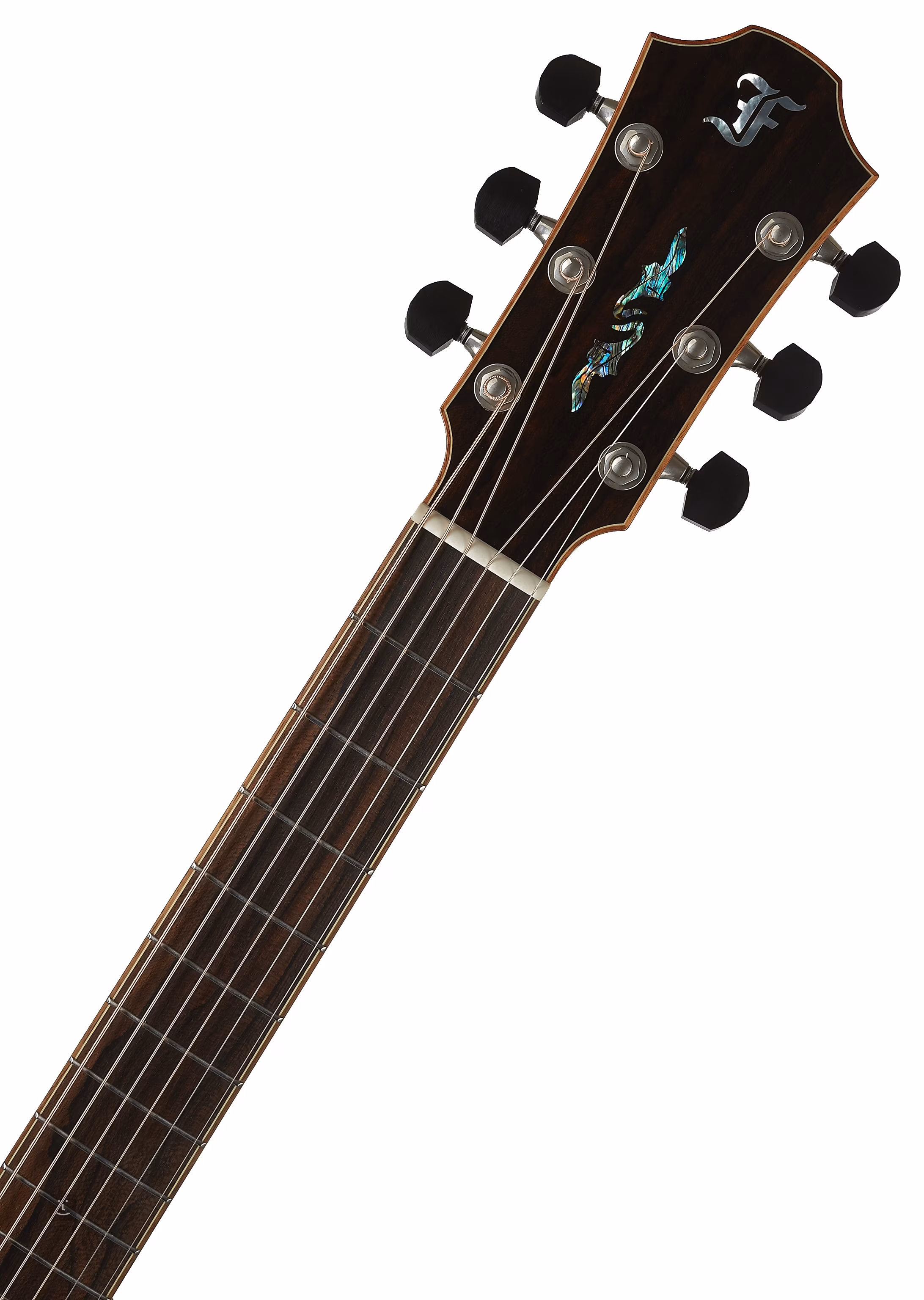 Das Griffbrett aus exklusivem mittelamerikanischem Ziricote-Holz mit markantem Muster ist mit einer Perlenintarsie in Form eines Blattes verziert, und ein ähnliches natürliches Muster aus grüner Abalone befindet sich auf der Kopfplatte. Das transparente Schlagbrett lässt die natürliche Maserung des Holzes zur Geltung kommen, ohne die Resonanz des Resonanzbodens zu beeinträchtigen. Für eine stabile Stimmung sorgt eine hochwertige Gotoh 510 Mechanik in Silberpatina mit polierten Ebenholzwirbeln und einer Übersetzung von 1:21. Das luxuriöse Aussehen der Gitarre wird durch die Kopfplatte und das Griffbrett aus Ziricote-Holz, das Korpus-, Griffbrett- und Kopfplatten-Binding, die Endblock-Verzierung aus hawaiianischem Koa, die Kopfplatteneinlage aus Abalone-Perlen und die hochwertige Ringrosette aus hawaiianischem Koa und Abalone-Perlen unterstrichen.