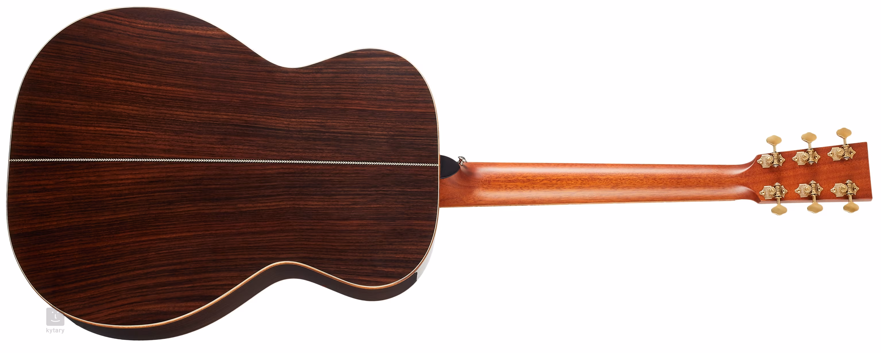 Die Orientierung auf dem Ebenholzgriffbrett wird durch quadratische weiße Perlmutt-Positionsmarker und schwarze Punkt-Seitenmarker erleichtert. Für eine stabile Stimmung sorgt die hochwertige Gotoh SE700 Mechanik in Goldpatina mit einer Übersetzung von 1:15. Das attraktive Aussehen der Gitarre wird durch den Korpus, die Kopfplatte und das Griffbrett-Binding aus hawaiianischem Koa mit kontrastierenden Linien, eine Decke mit Fischgrätenmotiv, eine Doppelring-Rosette mit grünem Abalone-Schlagbrett, ein Kopfplatten-Griffbrett aus Madagaskar-Palisander und ein Schlagbrett aus Schildpatt-Imitat noch unterstrichen.