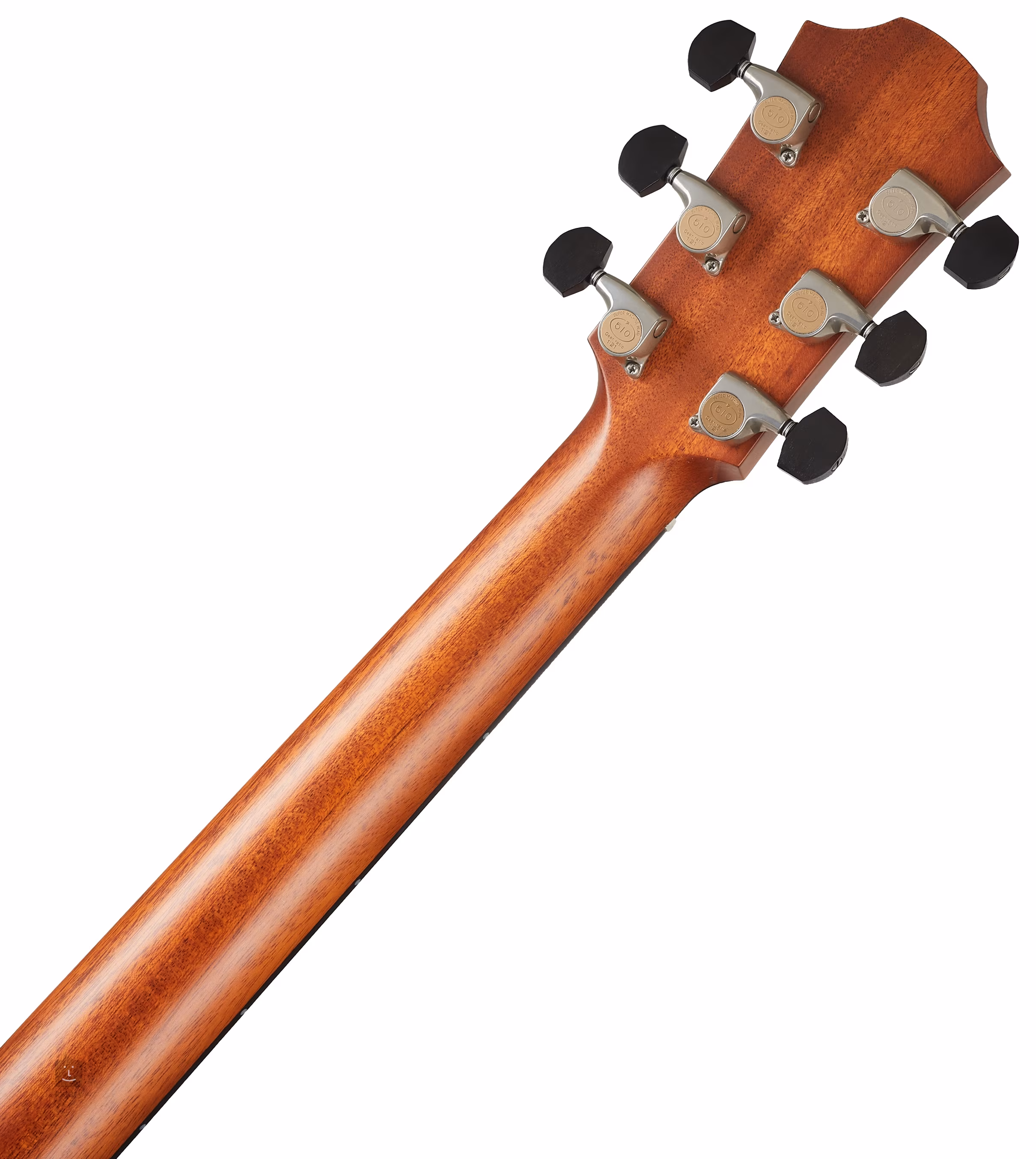 Die Orientierung auf dem Ebenholz-Griffbrett wird durch elegante kreisförmige Positionsmarker auf der Vorderseite mit einer dünnen weißen Perlmutt-Konturlinie und seitlichen Perlmutt-Punktmarkern erleichtert. Das transparente Schlagbrett lässt die natürliche Maserung des Holzes zur Geltung kommen, ohne die Resonanz des Resonanzbodens zu beeinträchtigen. Für eine stabile Stimmung sorgt das hochwertige Gotoh 510 Werk in silberner Patina mit polierten Ebenholzwirbeln und einer hochentwickelten Übersetzung von 1:21. Die feine Verarbeitung wird durch feine Details in Form von Schildpattimitat-Korpuseinfassung und Doppelringrosette mit grüner Abalone-Einlage mit schwarzer und weißer Linie akzentuiert.