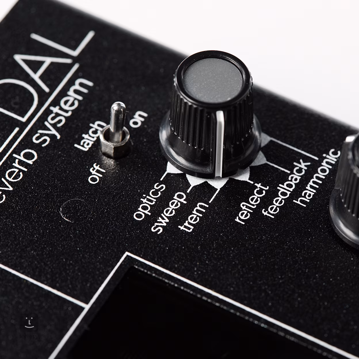 Das Light Pedal bietet sechs Arten von einzigartigen Halleffekten in zwei Kategorien, Optical FX und Mechanical FX, die jeweils mit dem CTRL-Regler eingestellt werden können; der Gate-Regler steuert den integrierten Hüllkurvenfilter. Die anderen Regler bestimmen das Verhältnis des Clean-Signals (Dry), die Lautstärke des trockenen Signals (Spring für das Federhallsignal, Optical für das optische Signal und Tone für beide Signale gleichzeitig) und die Intensität des nassen Signals/Halls (Drive). Zwei Schalter bestimmen die Latch-/Momentanfunktion des Fußschalterpedals und die Trails-Funktion, d.h. den Nachhall des Effekts nach dem Ausschalten des Pedals. Erweiterte Steuerungsmöglichkeiten bieten einen Eingang für ein Expression-Pedal.