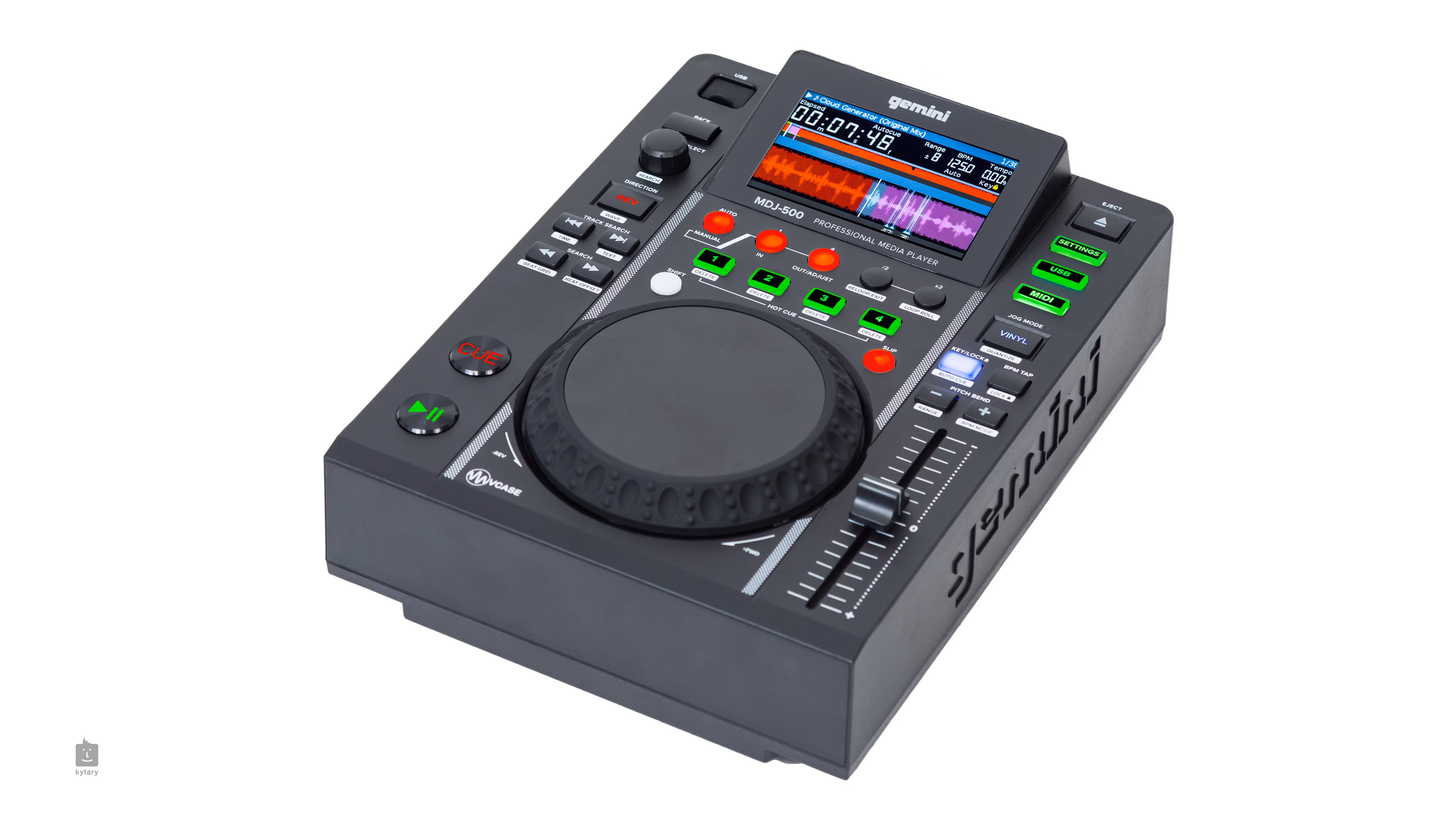 Das Gerät verfügt über eine berührungsempfindliche 8-Zoll-Jog-Plate mit einstellbarem Widerstand, den Sie genau an Ihre Bedürfnisse anpassen können. Außerdem zeigt das 4,3-Zoll-Farbdisplay alle wichtigen Informationen übersichtlich auf einen Blick an. Der MDJ-500 unterstützt die Wiedergabe von WAV-, MP3-, AAC- und AIFF-Formaten direkt von externen Speichermedien über den USB-A-Anschluss und dient außerdem als 24-Bit/192-kHz-Audio-Interface, wenn er über den USB-B-Anschluss an einen Computer angeschlossen ist.