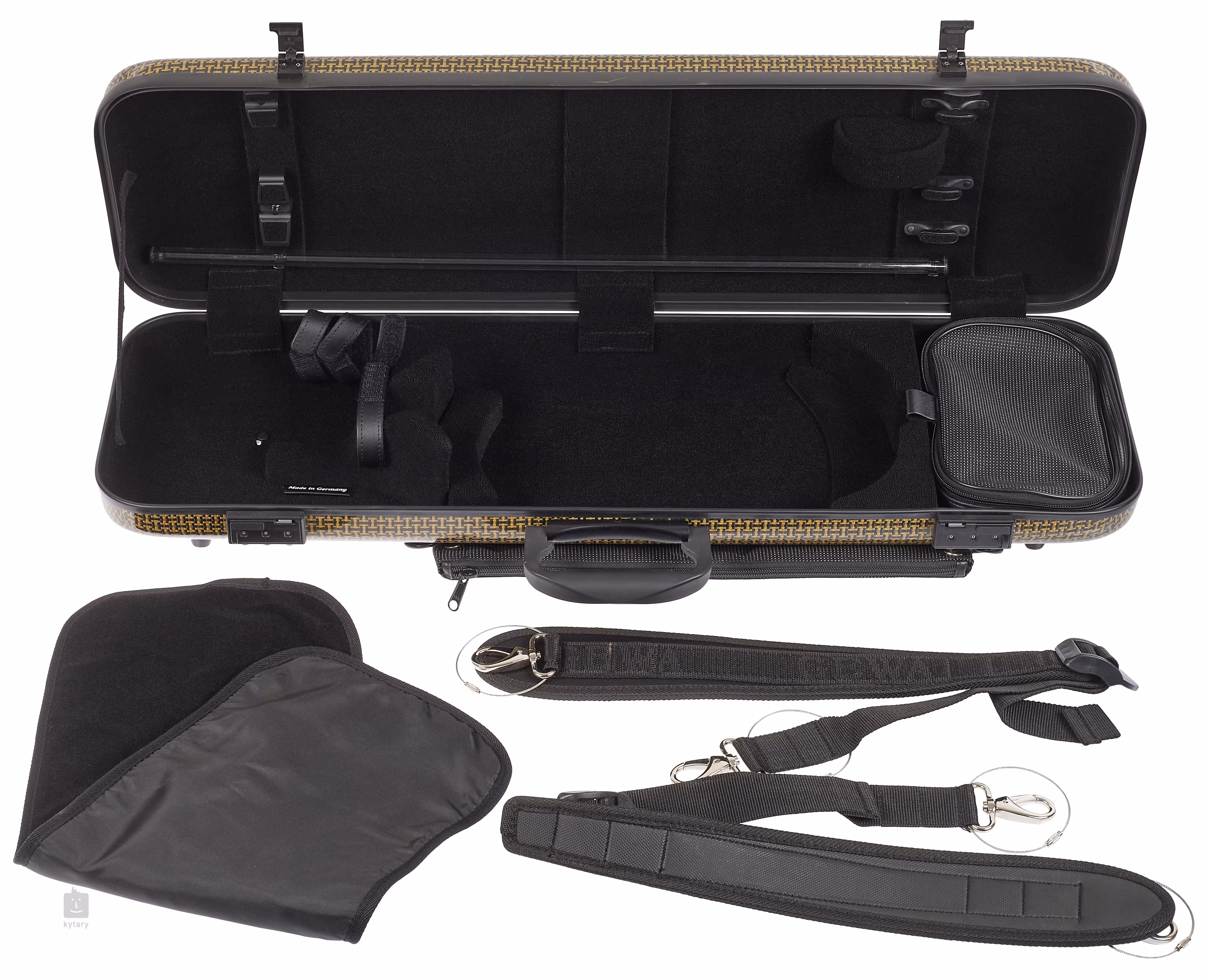 Schalenetui für 4/4 Violine, hergestellt aus spezieller Aramid-Kohlefaser. Diese garantieren hohe Festigkeit, Durchstoß- und Reißfestigkeit, hervorragende Isolationseigenschaften und geringes Gewicht. Natürlich verhindert die reichhaltige Innenpolsterung aus schwarzem Velours ein Verkratzen des Instruments. Außerdem finden Sie zum Beispiel patentierte Drehschlaufenhalterungen, eine leicht abnehmbare Zubehörtasche oder bequeme Neopren-Rückengurte, die bei Bedarf abgenommen werden können. Kurz gesagt, dieser in Deutschland hergestellte Koffer sorgt dafür, dass Ihr wertvolles Instrument unter allen Bedingungen sicher ist.