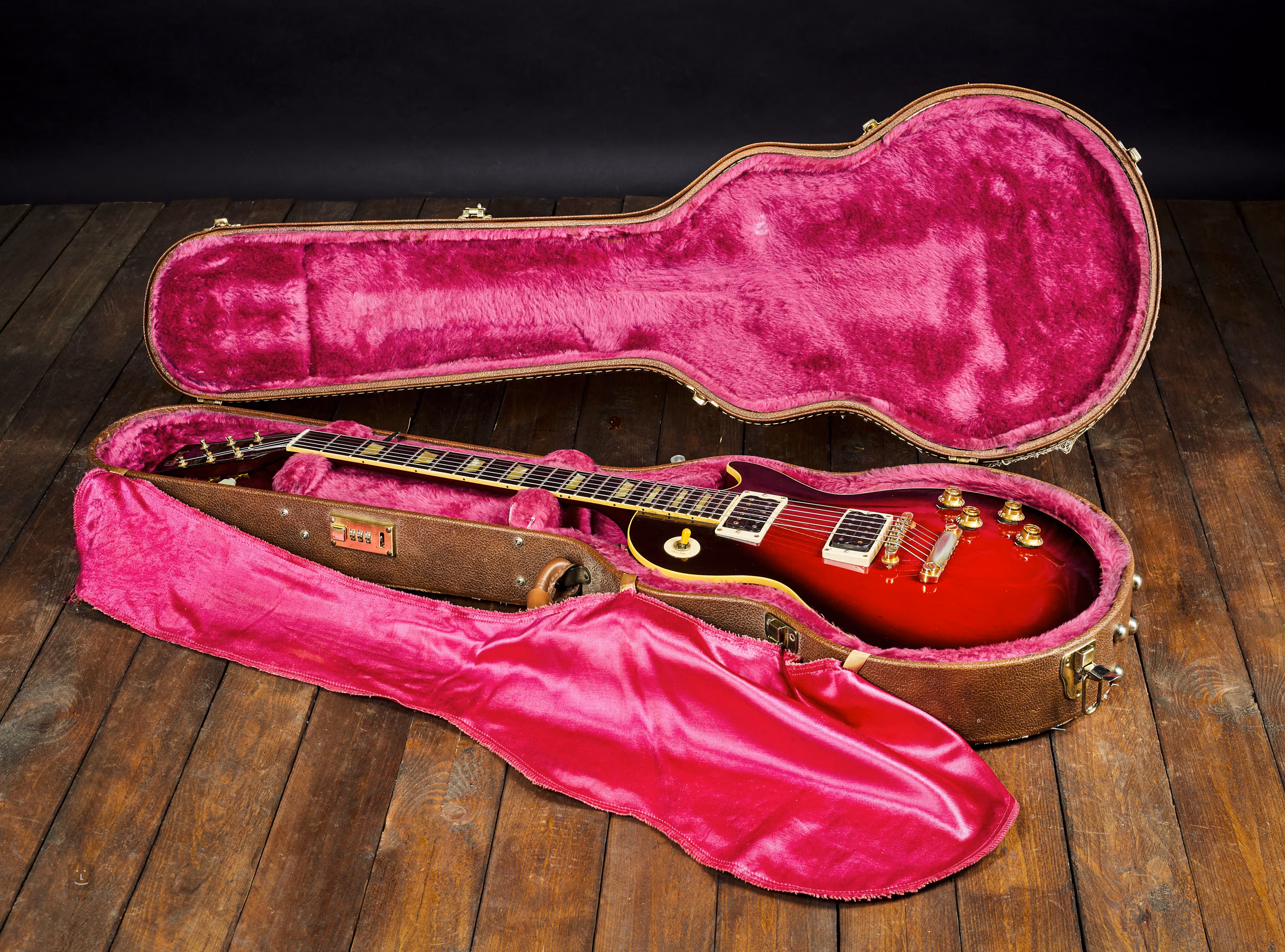 Gibson Les Paul nach dem 1. Besitzer (gekauft in der Tschechischen Republik im Jahr 1995). Dieses Modell ist der Vorgänger der heutigen Custom Shop 1960 Les Paul. Die Gitarre hat eine ziemlich seltene Oberfläche: der Körper hat eine rote Burst und die Hardware ist Gold.