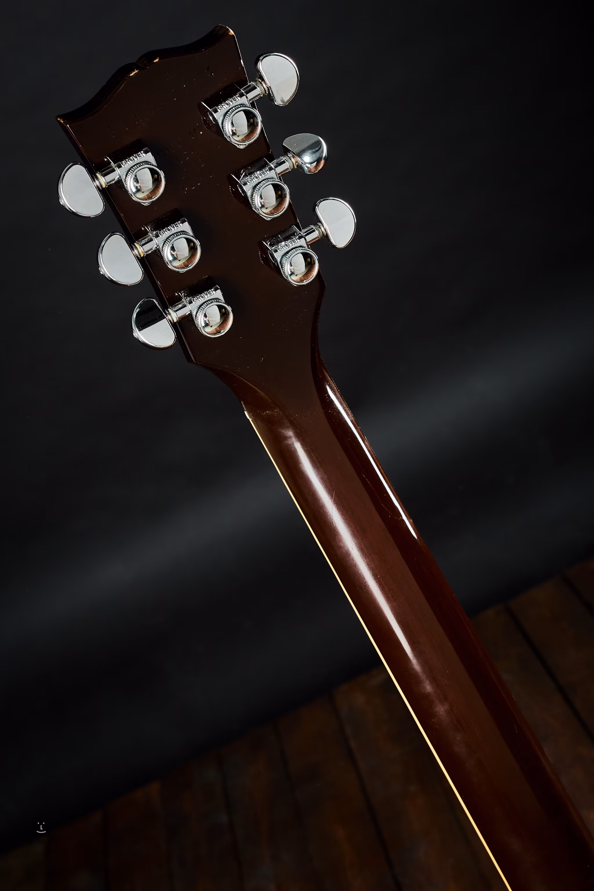 Ein sehr schönes Instrument in tollem Spielzustand. Die Gitarre wurde benutzt, sieht aus wie ein gewonnenes Stück. Der Hals ist perfekt. Es gibt kleinere Stöße und Kratzer auf dem Körper oder der Kopfplatte, die Plastikabdeckungen auf der Rückseite sind gerissen, aber halten.