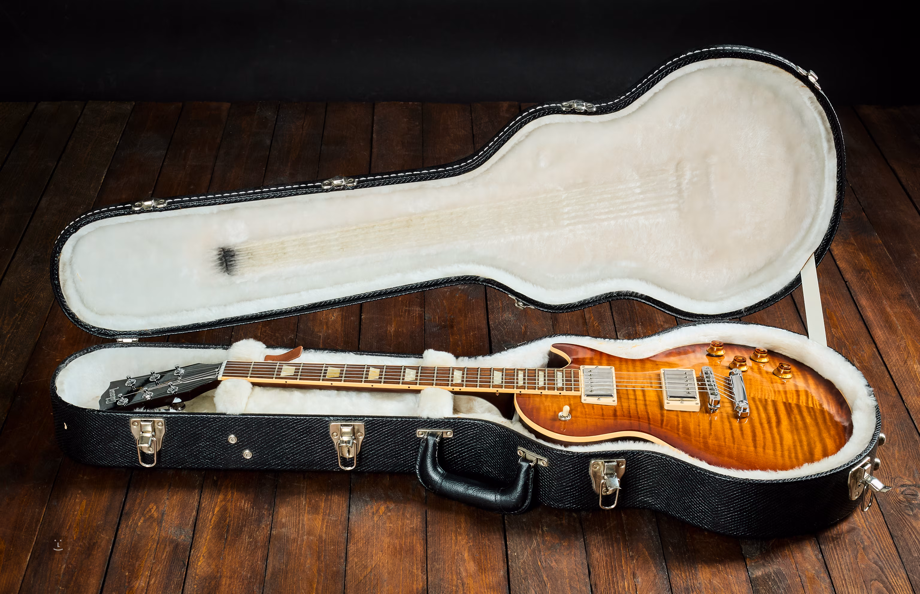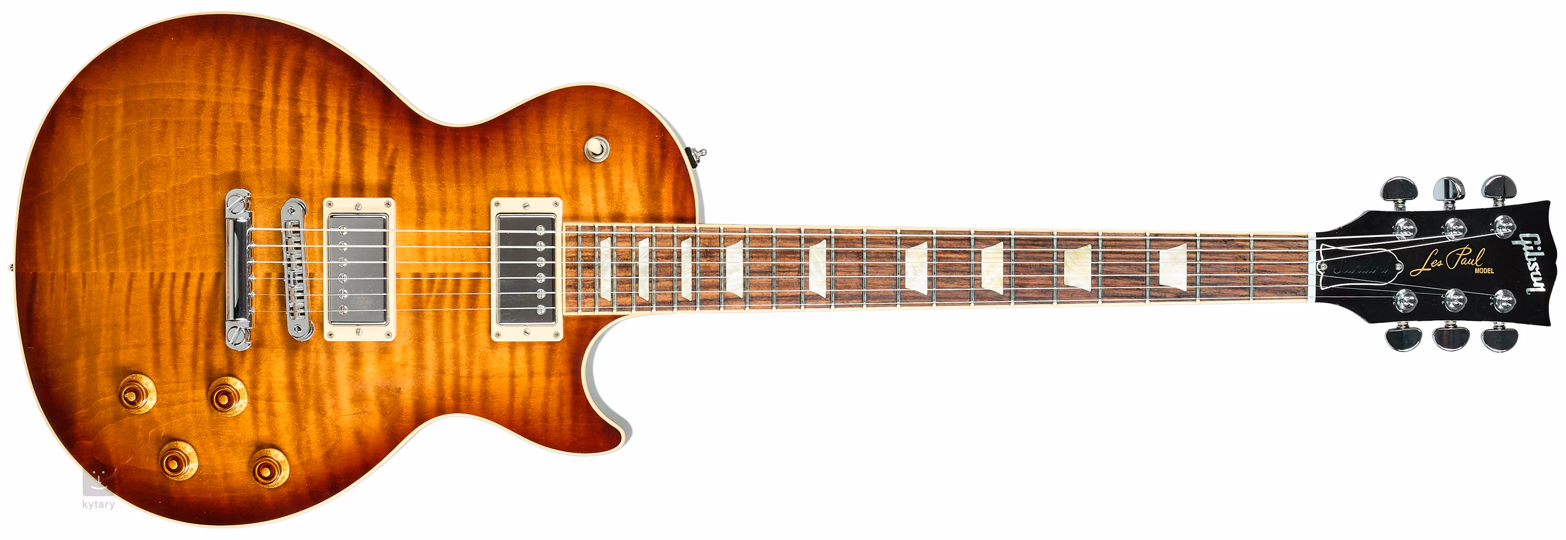 Der Mahagoni-Korpus hat eine "Modern" Weight Relieved Kammerung, die AAAA Figure maple top. Die Gibson Burstbucker-Tonabnehmer haben eine Option zum Abziehen, und die Elektronik bietet eine gegenphasige Verdrahtung und einen echten Bypass, alles dank Push-Pull-Potentiometern.