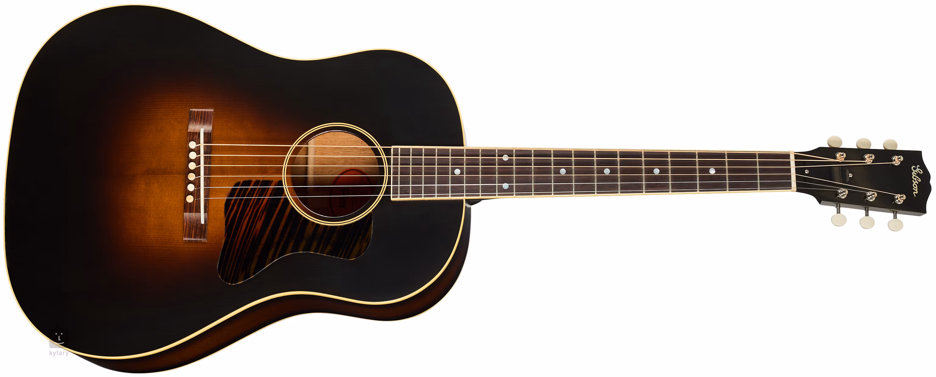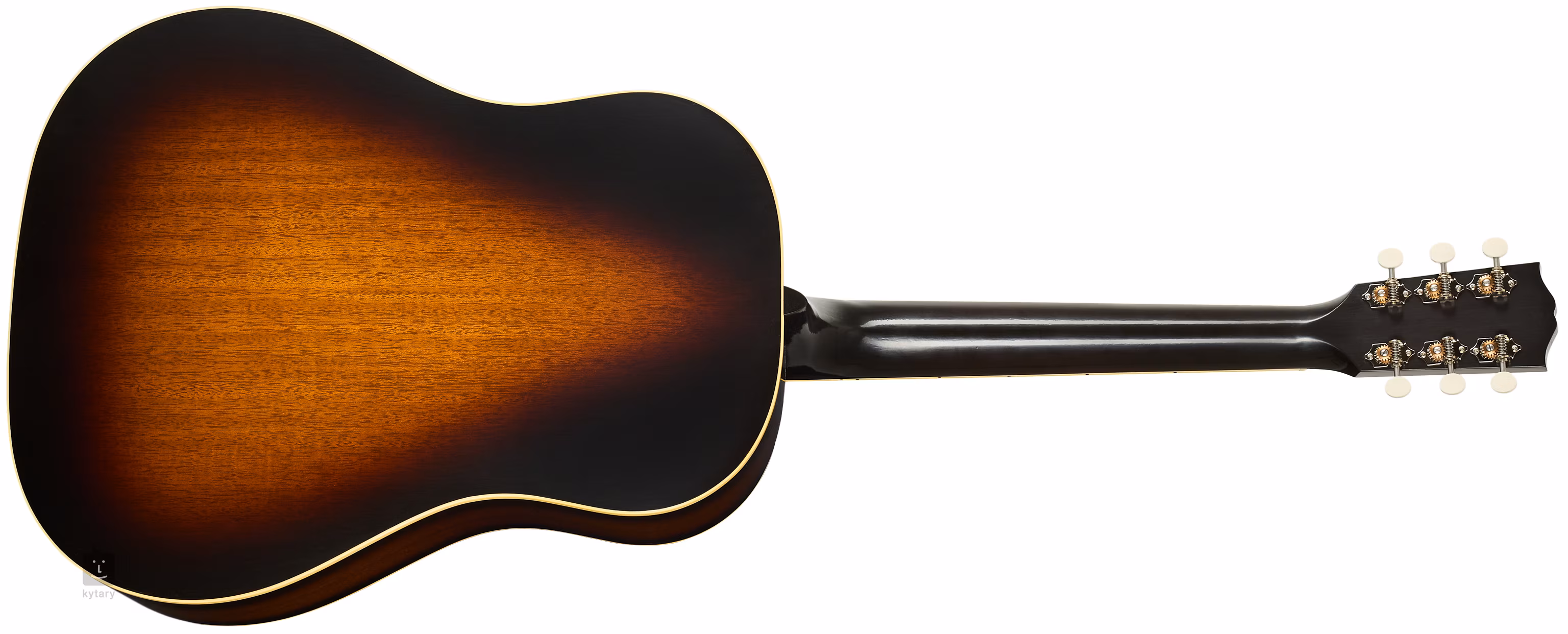 Die Vorderseite der Gitarre ist aus wärmebehandelter massiver Adirondack-Fichte (Rotfichte) gefertigt, während Boden und Zargen aus massivem Mahagoni bestehen. Die Resonanz der Decke wird durch handgeschnittene X-Rippen unterstützt, und das Gefühl der historischen Authentizität wird durch die VOS-Lackierung (Vintage Original Spec) mit subtilen Patina-Elementen, d.h. handaufgetragenem und poliertem echtem Nitrolack, unterstrichen.
