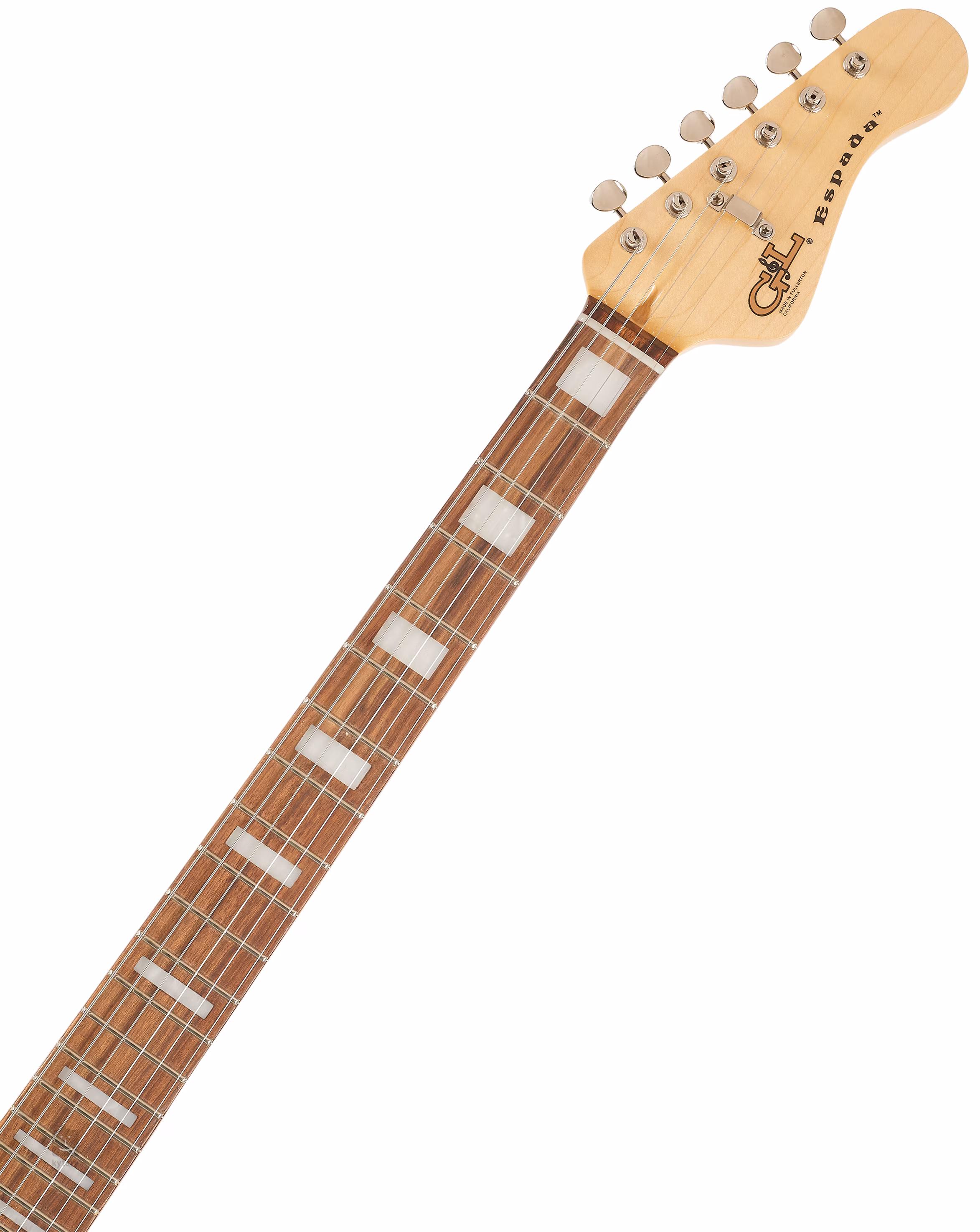 Der Korpus der USA CLF Research Espada HH Vintage White Gitarre ist aus Erle gefertigt. Ein Griffbrett aus karibischem Palisander (trotz des Namens ist es kein Palisander) mit einundzwanzig Medium-Jumbo-Nickelbünden ist auf einen verschraubten Ahornhals mit "Modern Classic"-Profil geklebt, wobei die Orientierung auf dem Griffbrett durch Perlmutt-Positionsblöcke erleichtert wird.